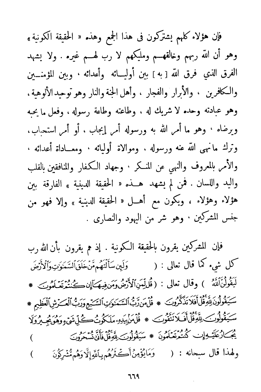 فَإِنَّ هَؤُلَاءِ كُلَّهُمْ يَشْتَرِكُونَ فِي هَذَا الْجَمْعِ وَهَذِهِ " الْحَقِيقَةُ الْكَوْنِيَّةُ " وَهُوَ أَنَّ اللَّهَ رَبُّهُمْ وَخَالِقُهُمْ وَمَلِيكُهُمْ لَا رَبَّ لَهُمْ غَيْرُهُ. وَلَا يَشْهَدُ الْفَرْقَ الَّذِي فَرَّقَ اللَّهُ بِهِ بَيْنَ أَوْلِيَائِهِ وَأَعْدَائِهِ وَبَيْنَ الْمُؤْمِنِينَ وَالْكَافِرِينَ وَالْأَبْرَارِ وَالْفُجَّارِ وَأَهْلِ الْجَنَّةِ وَالنَّارِ وَهُوَ تَوْحِيدُ الْأُلُوهِيَّةِ وَهُوَ عِبَادَتُهُ وَحْدَهُ لَا شَرِيكَ لَهُ وَطَاعَتُهُ وَطَاعَةُ رَسُولِهِ وَفِعْلُ مَا يُحِبُّهُ وَيَرْضَاهُ؟ وَهُوَ مَا أَمَرَ اللَّهُ بِهِ وَرَسُولُهُ أَمْرَ إيجَابٍ أَوْ أَمْرَ اسْتِحْبَابٍ وَتَرْكُ مَا نَهَى اللَّهُ عَنْهُ وَرَسُولُهُ وَمُوَالَاةُ أَوْلِيَائِهِ وَمُعَادَاةُ أَعْدَائِهِ وَالْأَمْرُ بِالْمَعْرُوفِ وَالنَّهْيُ عَنْ الْمُنْكَرِ وَجِهَادُ الْكُفَّارِ وَالْمُنَافِقِينَ بِالْقَلْبِ وَالْيَدِ وَاللِّسَانِ. فَمَنْ لَمْ يَشْهَدْ هَذِهِ " الْحَقِيقَةَ الدِّينِيَّةَ " الْفَارِقَةَ بَيْنَ هَؤُلَاءِ وَهَؤُلَاءِ وَيَكُونُ مَعَ أَهْلِ " الْحَقِيقَةِ الدِّينِيَّةِ " وَإِلَّا فَهُوَ مِنْ جِنْسِ الْمُشْرِكِينَ وَهُوَ شَرٌّ مِنْ الْيَهُودِ وَالنَّصَارَى. فَإِنَّ الْمُشْرِكِينَ يُقِرُّونَ بِالْحَقِيقَةِ الْكَوْنِيَّةِ. إذْ هُمْ يُقِرُّونَ بِأَنَّ اللَّهَ رَبُّ كُلِّ شَيْءٍ كَمَا قَالَ تَعَالَى: {وَلَئِنْ سَأَلْتَهُمْ مَنْ خَلَقَ السَّمَاوَاتِ وَالْأَرْضَ لَيَقُولُنَّ اللَّهُ} وَقَالَ تَعَالَى: {قُلْ لِمَنِ الْأَرْضُ وَمَنْ فِيهَا إنْ كُنْتُمْ تَعْلَمُونَ} {سَيَقُولُونَ لِلَّهِ قُلْ أَفَلَا تَذَكَّرُونَ} {قُلْ مَنْ رَبُّ السَّمَاوَاتِ السَّبْعِ وَرَبُّ الْعَرْشِ الْعَظِيمِ} {سَيَقُولُونَ لِلَّهِ قُلْ أَفَلَا تَتَّقُونَ} {قُلْ مَنْ بِيَدِهِ مَلَكُوتُ كُلِّ شَيْءٍ وَهُوَ يُجِيرُ وَلَا يُجَارُ عَلَيْهِ إنْ كُنْتُمْ تَعْلَمُونَ} {سَيَقُولُونَ لِلَّهِ قُلْ فَأَنَّى تُسْحَرُونَ} وَلِهَذَا قَالَ سُبْحَانَهُ: {وَمَا يُؤْمِنُ أَكْثَرُهُمْ