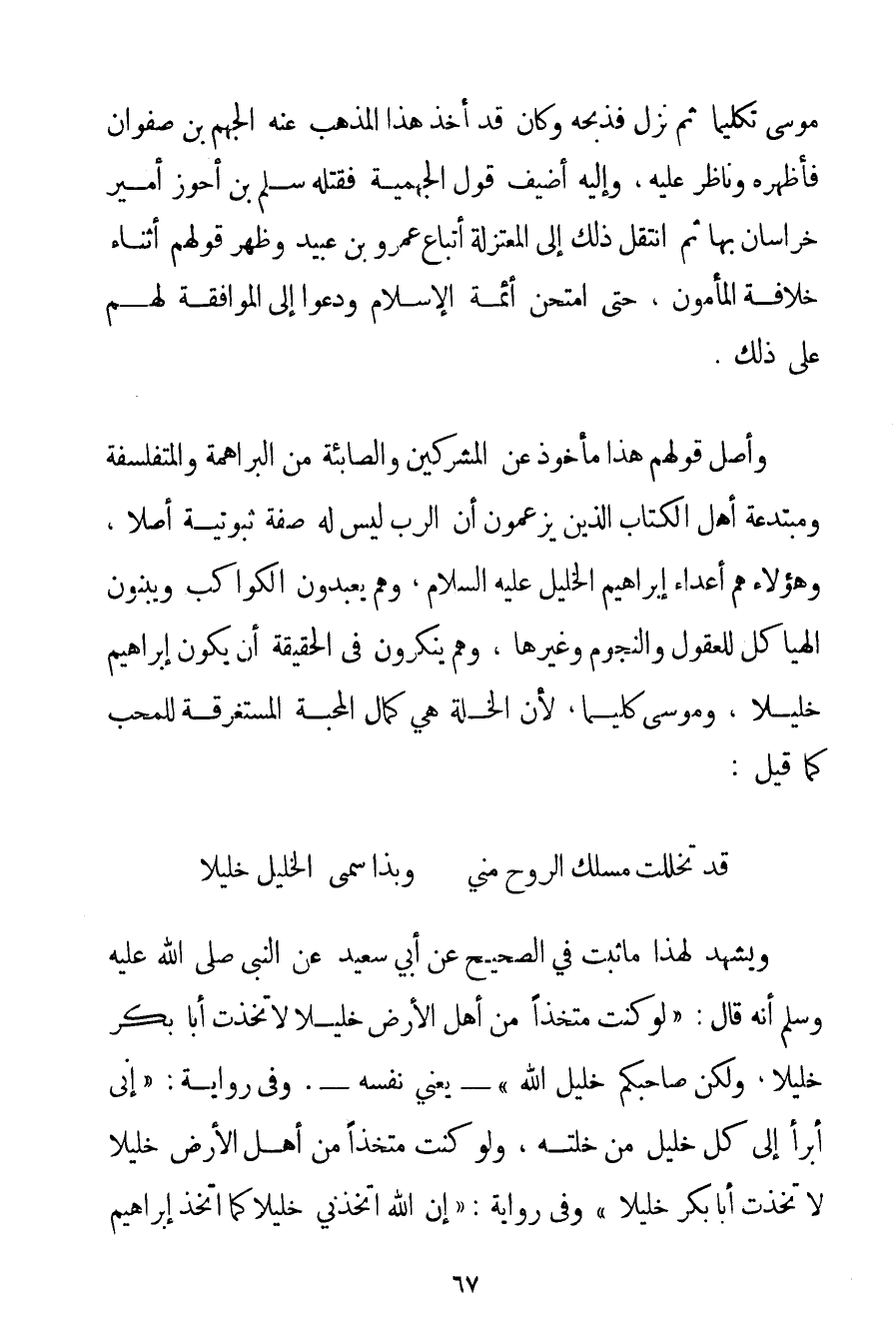 مُوسَى تَكْلِيمًا ثُمَّ نَزَلَ فَذَبَحَهُ وَكَانَ قَدْ أَخَذَ هَذَا الْمَذْهَبَ عَنْهُ الْجَهْمُ بْنُ صَفْوَانَ فَأَظْهَرَهُ وَنَاظَرَ عَلَيْهِ وَإِلَيْهِ أُضِيفَ قَوْلُ الْجَهْمِيَّة فَقَتَلَهُ سَلْمُ بْنُ أَحْوَزَ أَمِيرُ خُرَاسَانَ بِهَا ثُمَّ انْتَقَلَ ذَلِكَ إلَى الْمُعْتَزِلَةِ أَتْبَاعِ عَمْرِو بْنِ عُبَيْدٍ وَظَهَرَ قَوْلُهُمْ أَثْنَاءَ خِلَافَةِ الْمَأْمُونِ حَتَّى امْتَحَنَ أَئِمَّةَ الْإِسْلَامِ وَدَعَوْا إلَى الْمُوَافَقَةِ لَهُمْ عَلَى ذَلِكَ. وَأَصْلُ قَوْلِهِمْ هَذَا مَأْخُوذٌ عَنْ الْمُشْرِكِينَ وَالصَّابِئَةِ مِنْ البراهمة والمتفلسفة وَمُبْتَدِعَةِ أَهْلِ الْكِتَابِ الَّذِينَ يَزْعُمُونَ أَنَّ الرَّبَّ لَيْسَ لَهُ صِفَةٌ ثُبُوتِيَّةٌ أَصْلًا وَهَؤُلَاءِ هُمْ أَعْدَاءُ إبْرَاهِيمَ الْخَلِيلِ عَلَيْهِ السَّلَامُ وَهُمْ يَعْبُدُونَ الْكَوَاكِبَ وَيَبْنُونَ الْهَيَاكِلَ لِلْعُقُولِ وَالنُّجُومِ وَغَيْرِهَا وَهُمْ يُنْكِرُونَ فِي الْحَقِيقَةِ أَنْ يَكُونَ إبْرَاهِيمُ خَلِيلًا وَمُوسَى كَلِيمًا لِأَنَّ الْخُلَّةَ هِيَ كَمَالُ الْمَحَبَّةِ الْمُسْتَغْرِقَةِ لِلْمُحِبِّ كَمَا قِيلَ: