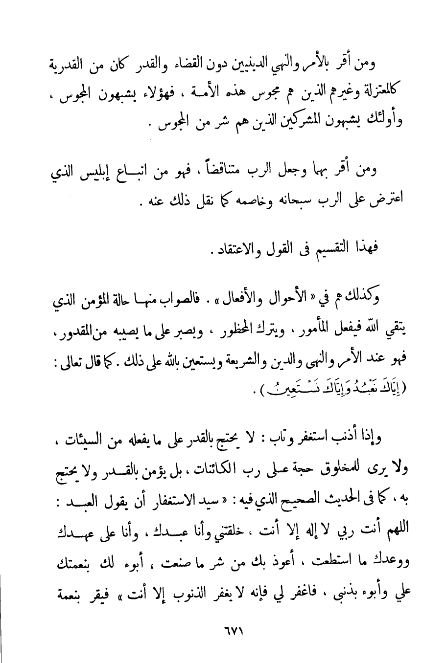 وَمَنْ أَقَرَّ بِالْأَمْرِ وَالنَّهْيِ الدِّينِيَّيْنِ دُونَ الْقَضَاءِ وَالْقَدَرِ كَانَ مِنْ الْقَدَرِيَّةِ كَالْمُعْتَزِلَةِ وَغَيْرِهِمْ الَّذِينَ هُمْ مَجُوسُ هَذِهِ الْأُمَّةِ فَهَؤُلَاءِ يُشْبِهُونَ الْمَجُوسَ وَأُولَئِكَ يُشْبِهُونَ الْمُشْرِكِينَ الَّذِينَ هُمْ شَرٌّ مِنْ الْمَجُوسِ. وَمَنْ أَقَرَّ بِهِمَا وَجَعَلَ الرَّبَّ مُتَنَاقِضًا فَهُوَ مِنْ أَتْبَاعِ إبْلِيسَ الَّذِي اعْتَرَضَ عَلَى الرَّبِّ سُبْحَانَهُ وَخَاصَمَهُ كَمَا نُقِلَ ذَلِكَ عَنْهُ. فَهَذَا التَّقْسِيمُ فِي الْقَوْلِ وَالِاعْتِقَادِ. وَكَذَلِكَ هُمْ فِي " الْأَحْوَالِ وَالْأَفْعَالِ ". فَالصَّوَابُ مِنْهَا حَالَةُ الْمُؤْمِنِ الَّذِي يَتَّقِي اللَّهَ فَيَفْعَلُ الْمَأْمُورَ وَيَتْرُكُ الْمَحْظُورَ وَيَصْبِرُ عَلَى مَا يُصِيبُهُ مِنْ الْمَقْدُورِ فَهُوَ عِنْدَ الْأَمْرِ وَالنَّهْيِ وَالدِّينِ وَالشَّرِيعَةِ وَيَسْتَعِينُ بِاَللَّهِ عَلَى ذَلِكَ. كَمَا قَالَ تَعَالَى: {إيَّاكَ نَعْبُدُ وَإِيَّاكَ نَسْتَعِينُ} . وَإِذَا أَذْنَبَ اسْتَغْفَرَ وَتَابَ: لَا يَحْتَجُّ بِالْقَدَرِ عَلَى مَا يَفْعَلُهُ مِنْ السَّيِّئَاتِ وَلَا يَرَى لِلْمَخْلُوقِ حُجَّةً عَلَى رَبِّ الْكَائِنَاتِ بَلْ يُؤْمِنُ بِالْقَدَرِ وَلَا يَحْتَجُّ بِهِ كَمَا فِي الْحَدِيثِ الصَّحِيحِ الَّذِي فِيهِ: {سَيِّدُ الِاسْتِغْفَارِ أَنْ يَقُولَ الْعَبْدُ: اللَّهُمَّ أَنْتَ رَبِّي لَا إلَهَ إلَّا أَنْتَ خَلَقْتَنِي وَأَنَا عَبْدُك وَأَنَا عَلَى عَهْدِك وَوَعْدِك مَا اسْتَطَعْت أَعُوذُ بِك مِنْ شَرِّ مَا صَنَعْت أَبُوءُ لَك بِنِعْمَتِك عَلَيَّ وَأَبُوءُ بِذَنْبِي فَاغْفِرْ لِي فَإِنَّهُ لَا يَغْفِرُ الذُّنُوبَ إلَّا أَنْتَ} فَيُقِرُّ بِنِعْمَةِ