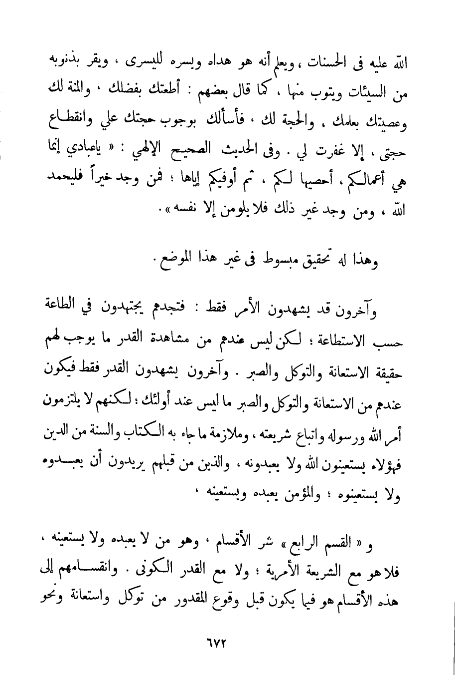 اللَّهِ عَلَيْهِ فِي الْحَسَنَاتِ وَيَعْلَمُ أَنَّهُ هُوَ هَدَاهُ وَيَسَّرَهُ لِلْيُسْرَى وَيُقِرُّ بِذُنُوبِهِ مِنْ السَّيِّئَاتِ وَيَتُوبُ مِنْهَا كَمَا قَالَ بَعْضُهُمْ: أَطَعْتُك بِفَضْلِك وَالْمِنَّةُ لَك وَعَصَيْتُك بِعِلْمِك وَالْحُجَّةُ لَك فَأَسْأَلُك بِوُجُوبِ حُجَّتِك عَلَيَّ وَانْقِطَاعِ حُجَّتِي إلَّا غَفَرْت لِي. وَفِي الْحَدِيثِ الصَّحِيحِ الْإِلَهِيِّ: {يَا عِبَادِي إنَّمَا هِيَ أَعْمَالُكُمْ أُحْصِيهَا لَكُمْ ثُمَّ أُوَفِّيكُمْ إيَّاهَا؛ فَمَنْ وَجَدَ خَيْرًا فَلْيَحْمَدْ اللَّهَ وَمَنْ وَجَدَ غَيْرَ ذَلِكَ فَلَا يَلُومَنَّ إلَّا نَفْسَهُ} . وَهَذَا لَهُ تَحْقِيقٌ مَبْسُوطٌ فِي غَيْرِ هَذَا الْمَوْضِعِ. وَآخَرُونَ قَدْ يَشْهَدُونَ الْأَمْرَ فَقَطْ: فَتَجِدُهُمْ يَجْتَهِدُونَ فِي الطَّاعَةِ حَسَبَ الِاسْتِطَاعَةِ؛ لَكِنْ لَيْسَ عِنْدَهُمْ مِنْ مُشَاهَدَةِ الْقَدَرِ مَا يُوجِبُ لَهُمْ حَقِيقَةَ الِاسْتِعَانَةِ وَالتَّوَكُّلِ وَالصَّبْرِ. وَآخَرُونَ يَشْهَدُونَ الْقَدَرَ فَقَطْ فَيَكُونُ عِنْدَهُمْ مِنْ الِاسْتِعَانَةِ وَالتَّوَكُّلِ وَالصَّبْرِ مَا لَيْسَ عِنْدَ أُولَئِكَ؛ لَكِنَّهُمْ لَا يَلْتَزِمُونَ أَمْرَ اللَّهِ وَرَسُولِهِ وَاتِّبَاعَ شَرِيعَتِهِ وَمُلَازَمَةَ مَا جَاءَ بِهِ الْكِتَابُ وَالسُّنَّةُ مِنْ الدِّينِ فَهَؤُلَاءِ يَسْتَعِينُونَ اللَّهَ وَلَا يَعْبُدُونَهُ وَاَلَّذِينَ مِنْ قَبْلِهِمْ يُرِيدُونَ أَنْ يَعْبُدُوهُ وَلَا يَسْتَعِينُوهُ؛ وَالْمُؤْمِنُ يَعْبُدُهُ وَيَسْتَعِينُهُ وَ " الْقِسْمُ الرَّابِعُ " شَرُّ الْأَقْسَامِ وَهُوَ مَنْ لَا يَعْبُدُهُ وَلَا يَسْتَعِينُهُ فَلَا هُوَ مَعَ الشَّرِيعَةِ الْأَمْرِيَّةِ. وَلَا مَعَ الْقَدَرِ الْكَوْنِيِّ. وَانْقِسَامُهُمْ إلَى هَذِهِ الْأَقْسَامِ هُوَ فِيمَا يَكُونُ قَبْلَ وُقُوعِ الْمَقْدُورِ مِنْ تَوَكُّلٍ وَاسْتِعَانَةٍ وَنَحْوِ