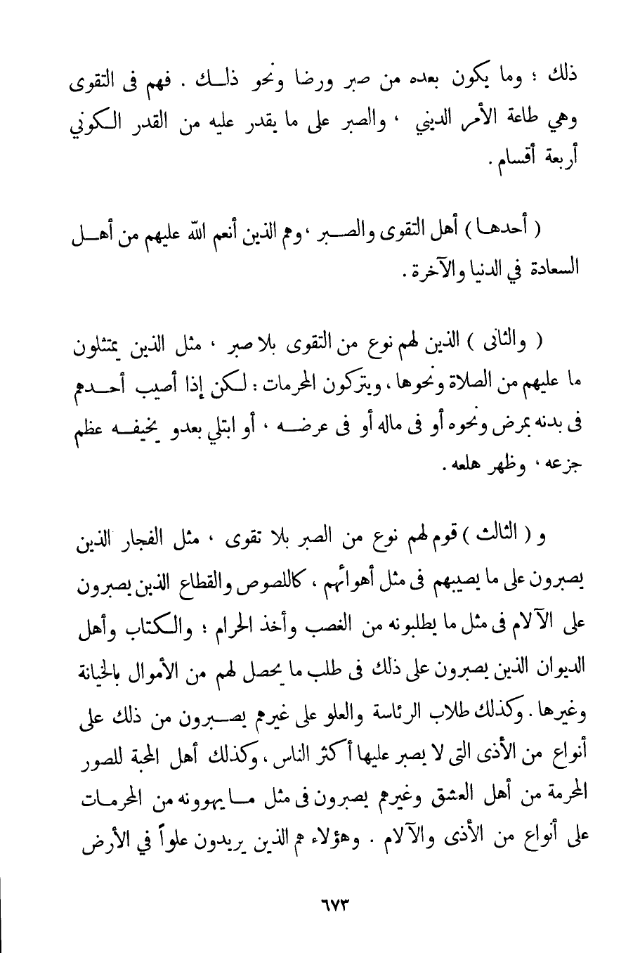 أَحَدُهَا أَهْلُ التَّقْوَى وَالصَّبْرِ وَهُمْ الَّذِينَ أَنْعَمَ اللَّهُ عَلَيْهِمْ مِنْ أَهْلِ السَّعَادَةِ فِي الدُّنْيَا وَالْآخِرَةِ. وَالثَّانِي الَّذِينَ لَهُمْ نَوْعٌ مِنْ التَّقْوَى بِلَا صَبْرٍ مِثْلُ الَّذِينَ يَمْتَثِلُونَ مَا عَلَيْهِمْ مِنْ الصَّلَاةِ وَنَحْوِهَا وَيَتْرُكُونَ الْمُحَرَّمَاتِ: لَكِنْ إذَا أُصِيبَ أَحَدُهُمْ فِي بَدَنِهِ بِمَرَضِ وَنَحْوِهِ أَوْ فِي مَالِهِ أَوْ فِي عِرْضِهِ أَوْ اُبْتُلِيَ بِعَدُوِّ يُخِيفُهُ عَظُمَ جَزَعُهُ وَظَهَرَ هَلَعُهُ. وَالثَّالِثُ قَوْمٌ لَهُمْ نَوْعٌ مِنْ الصَّبْرِ بِلَا تَقْوَى مِثْلُ الْفُجَّارِ الَّذِينَ يَصْبِرُونَ عَلَى مَا يُصِيبُهُمْ فِي مِثْلِ أَهْوَائِهِمْ كَاللُّصُوصِ وَالْقُطَّاعِ الَّذِينَ يَصْبِرُونَ عَلَى الْآلَامِ فِي مِثْلِ مَا يَطْلُبُونَهُ مِنْ الْغَصْبِ وَأَخْذِ الْحَرَامِ؛ وَالْكُتَّابِ وَأَهْلِ الدِّيوَانِ الَّذِينَ يَصْبِرُونَ عَلَى ذَلِكَ فِي طَلَبِ مَا يَحْصُلُ لَهُمْ مِنْ الْأَمْوَالِ بِالْخِيَانَةِ وَغَيْرِهَا. وَكَذَلِكَ طُلَّابُ الرِّئَاسَةِ وَالْعُلُوِّ عَلَى غَيْرِهِمْ يَصْبِرُونَ مِنْ ذَلِكَ عَلَى أَنْوَاعٍ مِنْ الْأَذَى الَّتِي لَا يَصْبِرُ عَلَيْهَا أَكْثَرُ النَّاسِ وَكَذَلِكَ أَهْلُ الْمَحَبَّةِ لِلصُّوَرِ الْمُحَرَّمَةِ مِنْ أَهْلِ الْعِشْقِ وَغَيْرِهِمْ يَصْبِرُونَ فِي مِثْلِ مَا يَهْوُونَهُ مِنْ الْمُحَرَّمَاتِ عَلَى أَنْوَاعٍ مِنْ الْأَذَى وَالْآلَامِ. وَهَؤُلَاءِ هُمْ الَّذِينَ يُرِيدُونَ عُلُوًّا فِي الْأَرْضِ