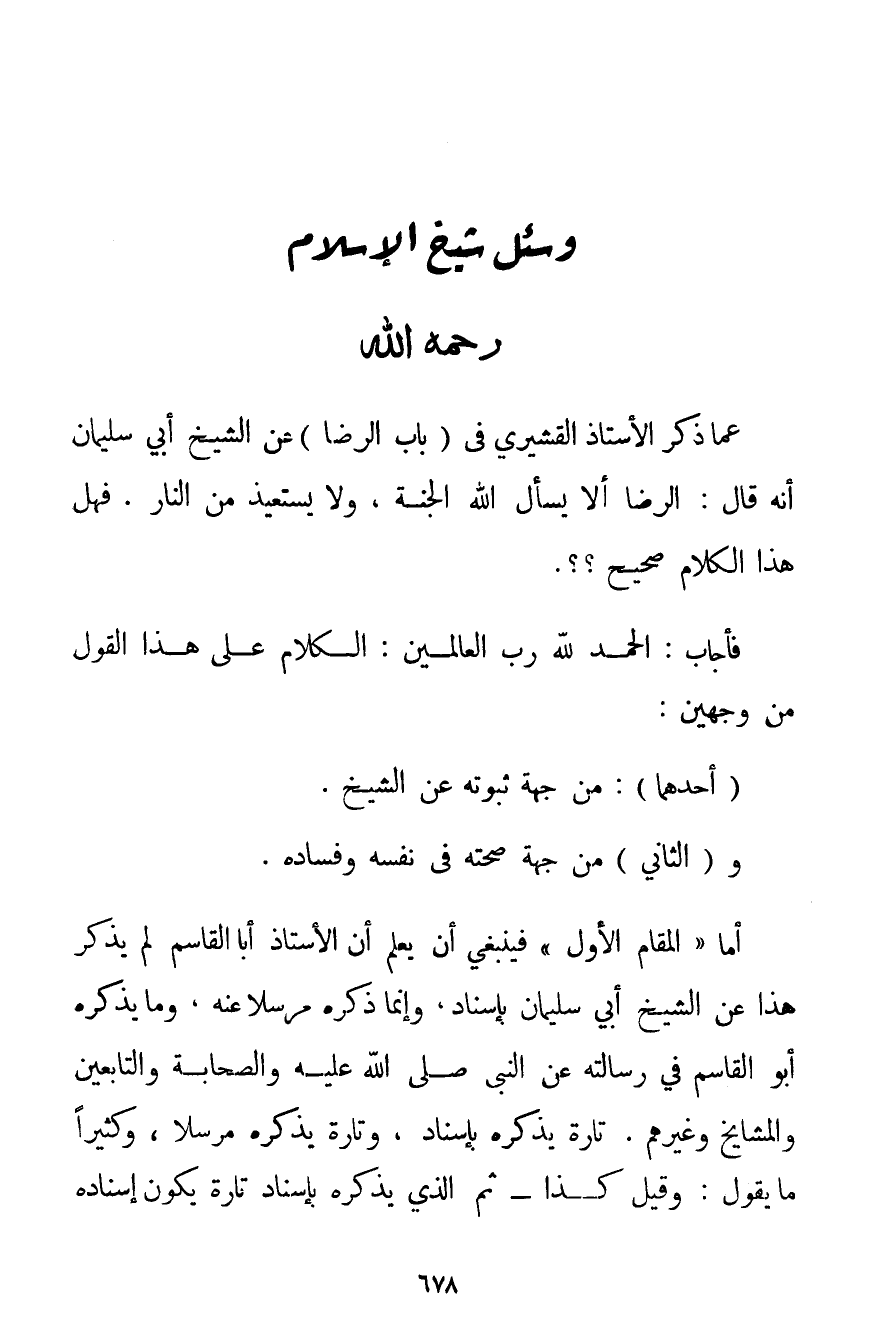 أَمَّا " الْمَقَامُ الْأَوَّلُ " فَيَنْبَغِي أَنْ يُعْلَمَ أَنَّ الْأُسْتَاذَ أَبَا الْقَاسِمِ لَمْ يَذْكُرْ هَذَا عَنْ الشَّيْخِ أَبِي سُلَيْمَانَ بِإِسْنَادِ وَإِنَّمَا ذَكَرَهُ مُرْسَلًا عَنْهُ وَمَا يَذْكُرُهُ أَبُو الْقَاسِمِ فِي رِسَالَتِهِ عَنْ النَّبِيِّ صَلَّى اللَّهُ عَلَيْهِ وَالصَّحَابَةِ وَالتَّابِعِينَ وَالْمَشَايِخِ وَغَيْرِهِمْ. تَارَةً يَذْكُرُهُ بِإِسْنَادِ وَتَارَةً يَذْكُرُهُ مُرْسَلًا وَكَثِيرًا مَا يَقُولُ: وَقِيلَ كَذَا - ثُمَّ الَّذِي يَذْكُرُهُ بِإِسْنَادِ تَارَةً يَكُونُ إسْنَادُهُ