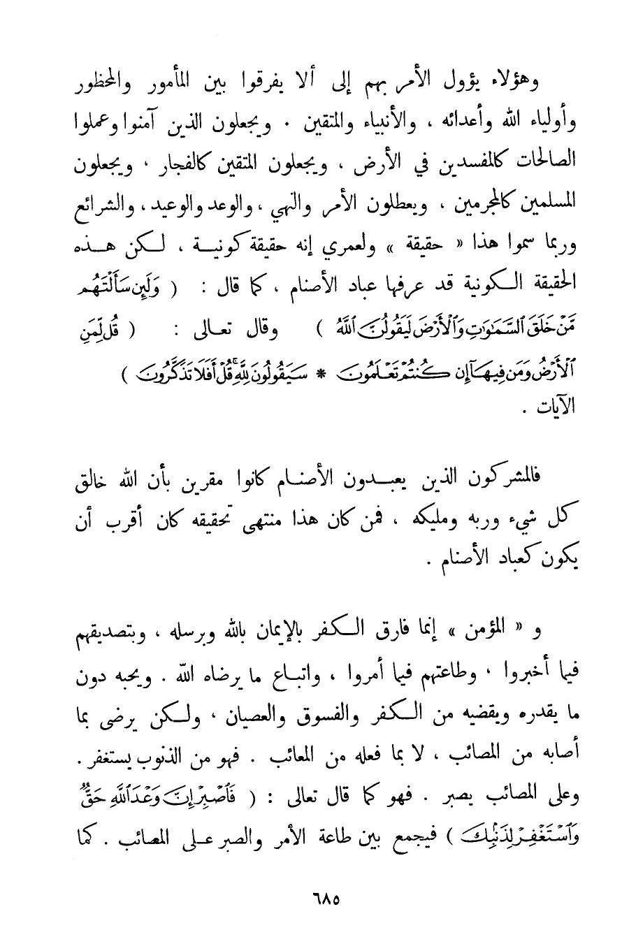 وَهَؤُلَاءِ يَئُولُ الْأَمْرُ بِهِمْ إلَى أَلَّا يُفَرِّقُوا بَيْنَ الْمَأْمُورِ وَالْمَحْظُورِ وَأَوْلِيَاءِ اللَّهِ وَأَعْدَائِهِ وَالْأَنْبِيَاءِ وَالْمُتَّقِينَ. وَيَجْعَلُونَ الَّذِينَ آمَنُوا وَعَمِلُوا الصَّالِحَاتِ كَالْمُفْسِدِينَ فِي الْأَرْضِ وَيَجْعَلُونَ الْمُتَّقِينَ كَالْفُجَّارِ وَيَجْعَلُونَ الْمُسْلِمِينَ كَالْمُجْرِمِينَ وَيُعَطِّلُونَ الْأَمْرَ وَالنَّهْيَ وَالْوَعْدَ وَالْوَعِيدَ وَالشَّرَائِعَ وَرُبَّمَا سَمَّوْا هَذَا " حَقِيقَةً " وَلَعَمْرِي إنَّهُ حَقِيقَةٌ كَوْنِيَّةٌ لَكِنَّ هَذِهِ الْحَقِيقَةَ الْكَوْنِيَّةَ قَدْ عَرَفَهَا عُبَّادُ الْأَصْنَامِ كَمَا قَالَ: {وَلَئِنْ سَأَلْتَهُمْ مَنْ خَلَقَ السَّمَاوَاتِ وَالْأَرْضَ لَيَقُولُنَّ اللَّهُ} وَقَالَ تَعَالَى: {قُلْ لِمَنِ الْأَرْضُ وَمَنْ فِيهَا إنْ كُنْتُمْ تَعْلَمُونَ} {سَيَقُولُونَ لِلَّهِ قُلْ أَفَلَا تَذَكَّرُونَ} الْآيَاتِ. فَالْمُشْرِكُونَ الَّذِينَ يَعْبُدُونَ الْأَصْنَامَ كَانُوا مُقِرِّينَ بِأَنَّ اللَّهَ خَالِقُ كُلِّ شَيْءٍ وَرَبُّهُ وَمَلِيكُهُ فَمَنْ كَانَ هَذَا مُنْتَهَى تَحْقِيقِهِ كَانَ أَقْرَبَ أَنْ يَكُونَ كَعُبَّادِ الْأَصْنَامِ. وَ " الْمُؤْمِنُ " إنَّمَا فَارَقَ الْكُفْرَ بِالْإِيمَانِ بِاَللَّهِ وَبِرُسُلِهِ وَبِتَصْدِيقِهِمْ فِيمَا أَخْبَرُوا وَطَاعَتِهِمْ فِيمَا أَمَرُوا وَاتِّبَاعِ مَا يَرْضَاهُ اللَّهُ. وَيُحِبُّهُ دُونَ مَا يُقَدِّرُهُ وَيَقْضِيهِ مِنْ الْكُفْرِ وَالْفُسُوقِ وَالْعِصْيَانِ وَلَكِنْ يَرْضَى بِمَا أَصَابَهُ مِنْ الْمَصَائِبِ لَا بِمَا فَعَلَهُ مِنْ المعائب. فَهُوَ مِنْ الذُّنُوبِ يَسْتَغْفِرُ. وَعَلَى الْمَصَائِبِ يَصْبِرُ. فَهُوَ كَمَا قَالَ تَعَالَى: {فَاصْبِرْ إنَّ وَعْدَ اللَّهِ حَقٌّ وَاسْتَغْفِرْ لِذَنْبِكَ} فَيَجْمَعُ بَيْنَ طَاعَةِ الْأَمْرِ وَالصَّبْرِ عَلَى الْمَصَائِبِ. كَمَا