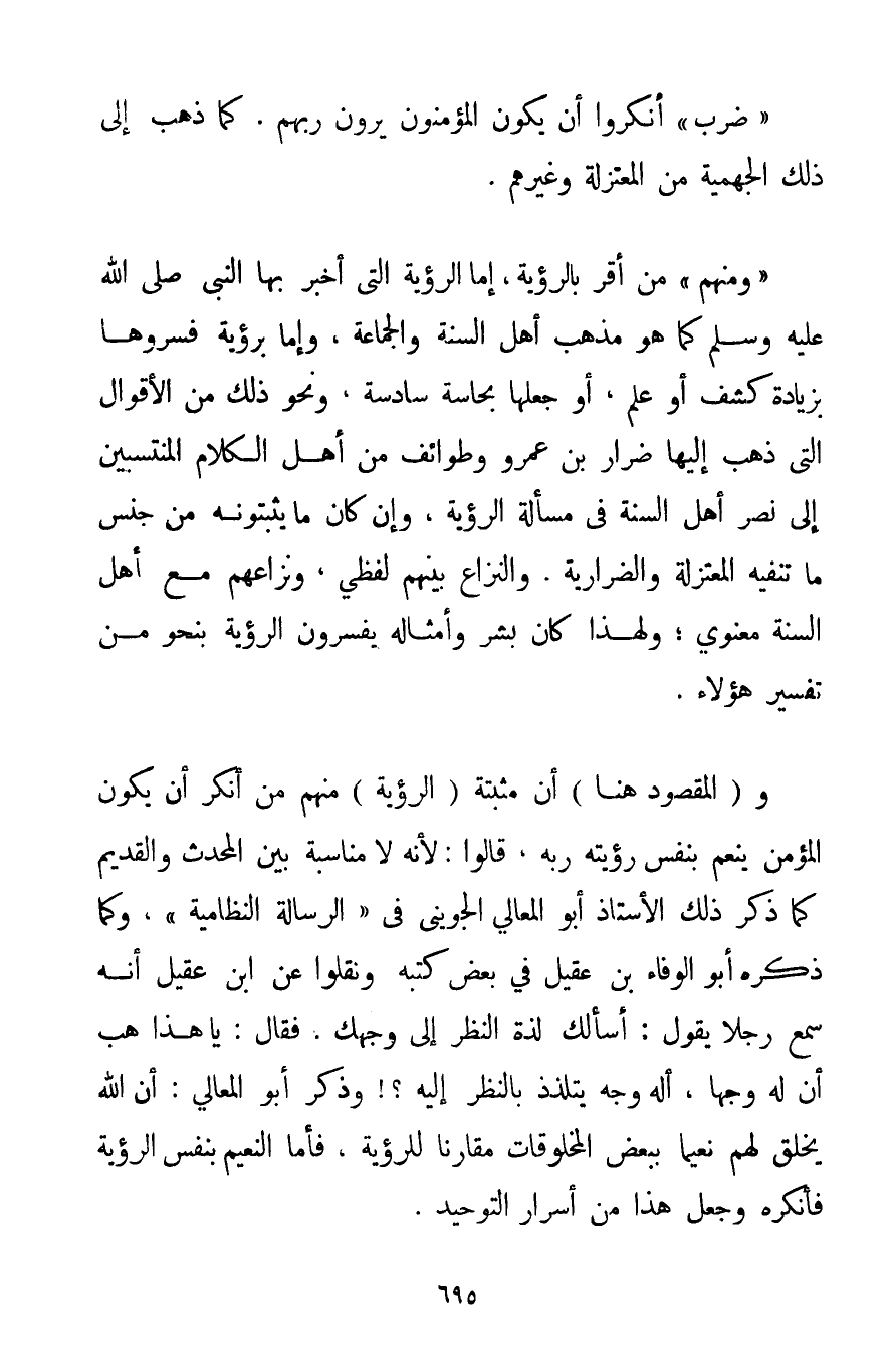" ضَرْبٌ " أَنْكَرُوا أَنْ يَكُونَ الْمُؤْمِنُونَ يَرَوْنَ رَبَّهُمْ. كَمَا ذَهَبَ إلَى ذَلِكَ الْجَهْمِيَّة مِنْ الْمُعْتَزِلَةِ وَغَيْرِهِمْ. " وَمِنْهُمْ " مَنْ أَقَرَّ بِالرُّؤْيَةِ إمَّا الرُّؤْيَةُ الَّتِي أَخْبَرَ بِهَا النَّبِيُّ صَلَّى اللَّهُ عَلَيْهِ وَسَلَّمَ كَمَا هُوَ مَذْهَبُ أَهْلِ السُّنَّةِ وَالْجَمَاعَةِ وَإِمَّا بِرُؤْيَةِ فَسَّرُوهَا بِزِيَادَةِ كَشْفٍ أَوْ عِلْمٍ أَوْ جَعْلِهَا بِحَاسَّةٍ سَادِسَةٍ وَنَحْوِ ذَلِكَ مِنْ الْأَقْوَالِ الَّتِي ذَهَبَ إلَيْهَا ضِرَارُ بْنُ عَمْرٍو وَطَوَائِفُ مِنْ أَهْلِ الْكَلَامِ الْمُنْتَسِبِينَ إلَى نَصْرِ أَهْلِ السُّنَّةِ فِي مَسْأَلَةِ الرُّؤْيَةِ وَإِنْ كَانَ مَا يُثْبِتُونَهُ مِنْ جِنْسِ مَا تَنْفِيه الْمُعْتَزِلَةُ والضرارية. وَالنِّزَاعُ بَيْنَهُمْ لَفْظِيٌّ وَنِزَاعُهُمْ مَعَ أَهْلِ السُّنَّةِ مَعْنَوِيٌّ؛ وَلِهَذَا كَانَ بِشْرٌ وَأَمْثَالُهُ يُفَسِّرُونَ الرُّؤْيَةَ بِنَحْوِ مِنْ تَفْسِيرِ هَؤُلَاءِ. وَ (الْمَقْصُودُ هُنَا أَنَّ مُثْبِتَةَ (الرُّؤْيَةِ مِنْهُمْ مَنْ أَنْكَرَ أَنْ يَكُونَ الْمُؤْمِنُ يَنْعَمُ بِنَفْسِ رُؤْيَتِهِ رَبَّهُ قَالُوا: لِأَنَّهُ لَا مُنَاسَبَةَ بَيْنَ الْمُحْدَثِ وَالْقَدِيمِ كَمَا ذَكَرَ ذَلِكَ الْأُسْتَاذُ أَبُو الْمَعَالِي الجُوَيْنِي فِي " الرِّسَالَةِ النِّظَامِيَّةِ " وَكَمَا ذَكَرَهُ أَبُو الْوَفَاءِ بْنُ عَقِيلٍ فِي بَعْضِ كُتُبِهِ وَنَقَلُوا عَنْ ابْنِ عَقِيلٍ أَنَّهُ سَمِعَ رَجُلًا يَقُولُ: أَسْأَلُك لَذَّةَ النَّظَرِ إلَى وَجْهِك. فَقَالَ: يَا هَذَا هَبْ أَنَّ لَهُ وَجْهًا أَلَهُ وَجْهٌ يُتَلَذَّذُ بِالنَّظَرِ إلَيْهِ وَذَكَرَ أَبُو الْمَعَالِي: أَنَّ اللَّهَ يَخْلُقُ لَهُمْ نَعِيمًا بِبَعْضِ الْمَخْلُوقَاتِ مُقَارِنًا لِلرُّؤْيَةِ فَأَمَّا النَّعِيمُ بِنَفْسِ الرُّؤْيَةِ فَأَنْكَرَهُ وَجَعَلَ هَذَا مِنْ أَسْرَارِ التَّوْحِيدِ.