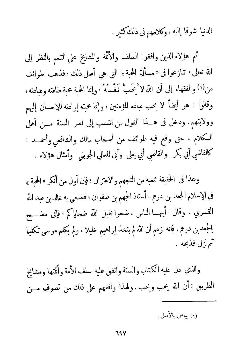 الدُّنْيَا شَوْقًا إلَيْهِ وَكَلَامُهُمْ فِي ذَلِكَ كَثِيرٌ. ثُمَّ هَؤُلَاءِ الَّذِينَ وَافَقُوا السَّلَفَ وَالْأَئِمَّةَ وَالْمَشَايِخَ عَلَى التَّنَعُّمِ بِالنَّظَرِ إلَى اللَّهِ تَعَالَى تَنَازَعُوا فِي " مَسْأَلَةِ الْمَحَبَّةِ " الَّتِي هِيَ أَصْلُ ذَلِكَ؛ فَذَهَبَ طَوَائِفُ مِنْ. . . (1) وَالْفُقَهَاءِ إلَى أَنَّ اللَّهَ لَا يُحَبُّ نَفْسُهُ وَإِنَّمَا الْمَحَبَّةُ مَحَبَّةُ طَاعَتِهِ وَعِبَادَتِهِ؛ وَقَالُوا: هُوَ أَيْضًا لَا يُحِبُّ عِبَادَهُ الْمُؤْمِنِينَ؛ وَإِنَّمَا مَحَبَّتُهُ إرَادَتُهُ لِلْإِحْسَانِ إلَيْهِمْ وَوِلَايَتُهُمْ. وَدَخَلَ فِي هَذَا الْقَوْلِ مَنْ انْتَسَبَ إلَى نَصْرِ السُّنَّةِ مِنْ أَهْلِ الْكَلَامِ حَتَّى وَقَعَ فِيهِ طَوَائِفُ مِنْ أَصْحَابِ مَالِك وَالشَّافِعِيِّ وَأَحْمَد: كَالْقَاضِي أَبِي بَكْرٍ وَالْقَاضِي أَبِي يَعْلَى وَأَبِي الْمَعَالِي الجُوَيْنِي وَأَمْثَالِ هَؤُلَاءِ. وَهَذَا فِي الْحَقِيقَةِ شُعْبَةٌ مِنْ التَّجَهُّمِ وَالِاعْتِزَالِ؛ فَإِنَّ أَوَّلَ مَنْ أَنْكَرَ " الْمَحَبَّةَ " فِي الْإِسْلَامِ الْجَعْدُ بْنُ دِرْهَمٍ أُسْتَاذُ الْجَهْمِ بْنِ صَفْوَانَ؛ فَضَحَّى بِهِ خَالِدُ بْنُ عَبْدِ اللَّهِ الْقَسْرِيُّ. وَقَالَ: أَيُّهَا النَّاسُ ضَحُّوا تَقَبَّلَ اللَّهُ ضَحَايَاكُمْ فَإِنِّي مُضَحٍّ بِالْجَعْدِ بْنِ دِرْهَمٍ فَإِنَّهُ زَعَمَ أَنَّ اللَّهَ لَمْ يَتَّخِذْ إبْرَاهِيمَ خَلِيلًا؛ وَلَمْ يُكَلِّمْ مُوسَى تَكْلِيمًا ثُمَّ نَزَلَ فَذَبَحَهُ. وَاَلَّذِي دَلَّ عَلَيْهِ الْكِتَابُ وَالسُّنَّةُ وَاتَّفَقَ عَلَيْهِ سَلَفُ الْأُمَّةِ وَأَئِمَّتُهَا وَمَشَايِخُ الطَّرِيقِ: أَنَّ اللَّهَ يُحِبُّ وَيُحَبُّ. وَلِهَذَا وَافَقَهُمْ عَلَى ذَلِكَ مَنْ تَصَوَّفَ مِنْ