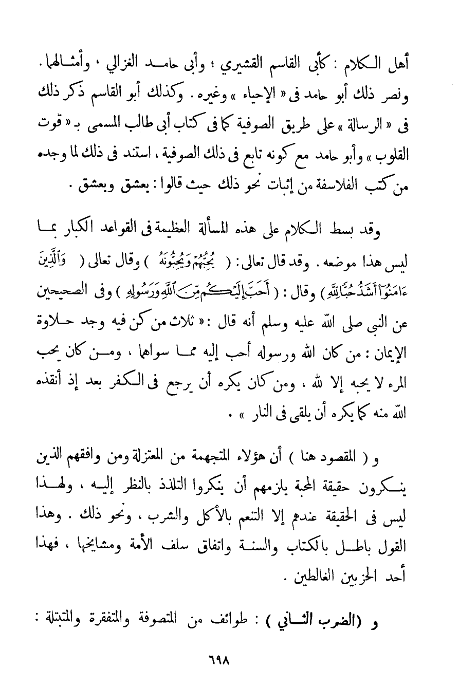 أَهْلِ الْكَلَامِ: كَأَبِي الْقَاسِمِ القشيري؛ وَأَبِي حَامِدٍ الْغَزَالِيِّ وَأَمْثَالِهِمَا. وَنَصَرَ ذَلِكَ أَبُو حَامِدٍ فِي " الْإِحْيَاءِ " وَغَيْرِهِ. وَكَذَلِكَ أَبُو الْقَاسِمِ ذَكَرَ ذَلِكَ فِي " الرِّسَالَةِ " عَلَى طَرِيقِ الصُّوفِيَّةِ كَمَا فِي كِتَابِ أَبِي طَالِبٍ الْمُسَمَّى بِ " قُوتِ الْقُلُوبِ " وَأَبُو حَامِدٍ مَعَ كَوْنِهِ تَابَعَ فِي ذَلِكَ الصُّوفِيَّةَ اسْتَنَدَ فِي ذَلِكَ لِمَا وَجَدَهُ مِنْ كُتُبِ الْفَلَاسِفَةِ مِنْ إثْبَاتِ نَحْوِ ذَلِكَ حَيْثُ قَالُوا: يَعْشَقُ وَيُعْشَقُ. وَقَدْ بُسِطَ الْكَلَامُ عَلَى هَذِهِ الْمَسْأَلَةِ الْعَظِيمَةِ فِي الْقَوَاعِدِ الْكِبَارِ بِمَا لَيْسَ هَذَا مَوْضِعَهُ. وَقَدْ قَالَ تَعَالَى: {يُحِبُّهُمْ وَيُحِبُّونَهُ} وَقَالَ تَعَالَى {وَالَّذِينَ آمَنُوا أَشَدُّ حُبًّا لِلَّهِ} وَقَالَ: {أَحَبَّ إلَيْكُمْ مِنَ اللَّهِ وَرَسُولِهِ} وَفِي الصَّحِيحَيْنِ عَنْ النَّبِيِّ صَلَّى اللَّهُ عَلَيْهِ وَسَلَّمَ أَنَّهُ قَالَ: {ثَلَاثٌ مَنْ كُنَّ فِيهِ وَجَدَ حَلَاوَةَ الْإِيمَانِ: مَنْ كَانَ اللَّهُ وَرَسُولُهُ أَحَبّ إلَيْهِ مِمَّا سِوَاهُمَا وَمَنْ كَانَ يُحِبُّ الْمَرْءَ لَا يُحِبُّهُ إلَّا لِلَّهِ وَمَنْ كَانَ يَكْرَهُ أَنْ يَرْجِعَ فِي الْكُفْرِ بَعْدَ إذْ أَنْقَذَهُ اللَّهُ مِنْهُ كَمَا يَكْرَهُ أَنْ يُلْقَى فِي النَّارِ} . وَ (الْمَقْصُودُ هُنَا أَنَّ هَؤُلَاءِ الْمُتَجَهِّمَةَ مِنْ الْمُعْتَزِلَةِ وَمَنْ وَافَقَهُمْ الَّذِينَ يُنْكِرُونَ حَقِيقَةَ الْمَحَبَّةِ يَلْزَمُهُمْ أَنْ يُنْكِرُوا التَّلَذُّذَ بِالنَّظَرِ إلَيْهِ وَلِهَذَا لَيْسَ فِي الْحَقِيقَةِ عِنْدَهُمْ إلَّا التَّنَعُّمَ بِالْأَكْلِ وَالشُّرْبِ وَنَحْوِ ذَلِكَ. وَهَذَا الْقَوْلُ بَاطِلٌ بِالْكِتَابِ وَالسُّنَّةِ وَاتِّفَاقِ سَلَفِ الْأُمَّةِ وَمَشَايِخِهَا فَهَذَا أَحَدُ الْحِزْبَيْنِ الغالطين. وَالضَّرْبُ الثَّانِي: طَوَائِفُ مِنْ الْمُتَصَوِّفَةِ وَالْمُتَفَقِّرَةِ وَالْمُتَبَتِّلَةِ: