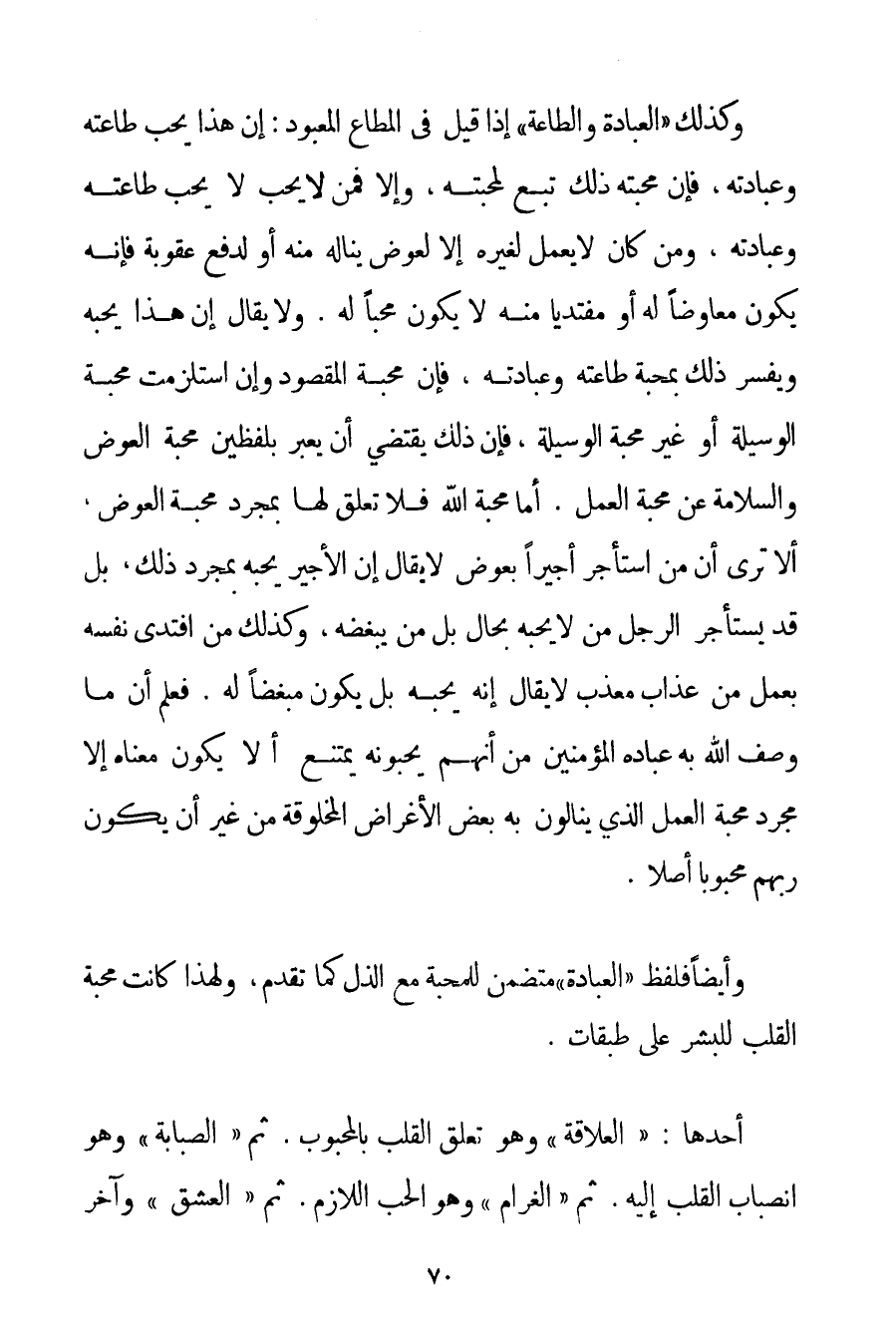 وَأَيْضًا فَلَفْظُ " الْعِبَادَةِ " مُتَضَمِّنٌ لِلْمَحَبَّةِ مَعَ الذُّلِّ كَمَا تَقَدَّمَ وَلِهَذَا كَانَتْ مَحَبَّةُ الْقَلْبِ لِلْبَشَرِ عَلَى طَبَقَاتٍ. أَحَدُهَا: " الْعَلَاقَةُ " وَهُوَ تَعَلُّقُ الْقَلْبِ بِالْمَحْبُوبِ. ثُمَّ " الصَّبَابَةُ " وَهُوَ انْصِبَابُ الْقَلْبِ إلَيْهِ. ثُمَّ " الْغَرَامُ " وَهُوَ الْحُبُّ اللَّازِمُ. ثُمَّ " الْعِشْقُ " وَآخِرُ