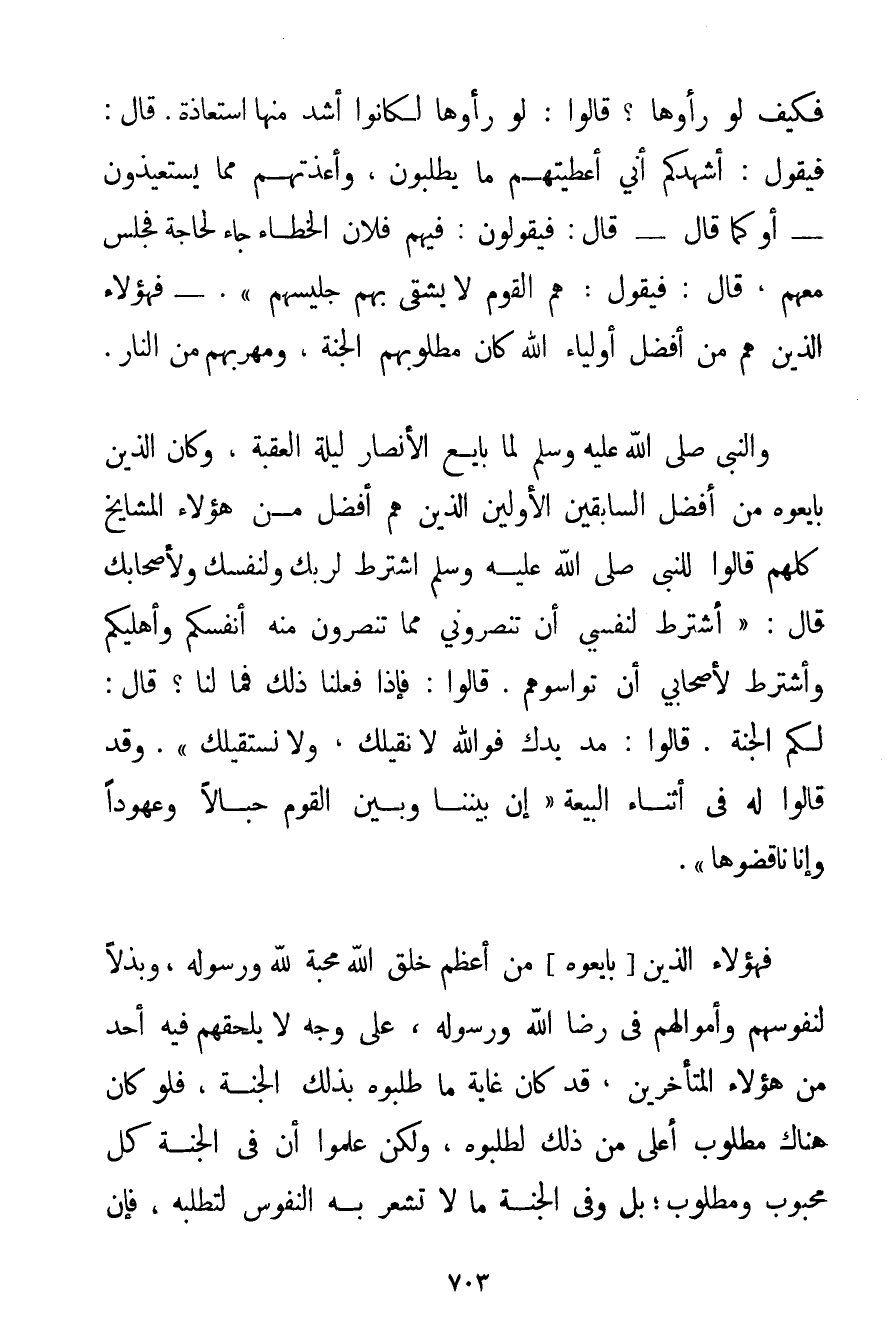 فَكَيْفَ لَوْ رَأَوْهَا؟ قَالُوا: لَوْ رَأَوْهَا لَكَانُوا أَشَدَّ مِنْهَا اسْتِعَاذَةً. قَالَ: فَيَقُولُ: أُشْهِدُكُمْ أَنِّي أَعْطَيْتهمْ مَا يَطْلُبُونَ وَأَعَذْتهمْ مِمَّا يَسْتَعِيذُونَ - أَوْ كَمَا قَالَ - قَالَ: فَيَقُولُونَ: فِيهِمْ فُلَانٌ الْخَطَّاءُ جَاءَ لِحَاجَةِ فَجَلَسَ مَعَهُمْ قَالَ: فَيَقُولُ: هُمْ الْقَوْمُ لَا يَشْقَى بِهِمْ جَلِيسُهُمْ} . - فَهَؤُلَاءِ الَّذِينَ هُمْ مِنْ أَفْضَلِ أَوْلِيَاءِ اللَّهِ كَانَ مَطْلُوبُهُمْ الْجَنَّةَ وَمَهْرَبُهُمْ مِنْ النَّارِ. وَالنَّبِيُّ صَلَّى اللَّهُ عَلَيْهِ وَسَلَّمَ لَمَّا بَايَعَ الْأَنْصَارَ لَيْلَةَ الْعَقَبَةِ وَكَانَ الَّذِينَ بَايَعُوهُ مِنْ أَفْضَلِ السَّابِقِينَ الْأَوَّلِينَ الَّذِينَ هُمْ أَفْضَلُ مِنْ هَؤُلَاءِ الْمَشَايِخِ كُلِّهِمْ قَالُوا لِلنَّبِيِّ صَلَّى اللَّهُ عَلَيْهِ وَسَلَّمَ اشْتَرِطْ لِرَبِّك وَلِنَفْسِك وَلِأَصْحَابِك قَالَ: {أَشْتَرِطُ لِنَفْسِي أَنْ تَنْصُرُونِي مِمَّا تَنْصُرُونَ مِنْهُ أَنْفُسَكُمْ وَأَهْلِيكُمْ وَأَشْتَرِطُ لِأَصْحَابِي أَنْ تُوَاسُوهُمْ. قَالُوا: فَإِذَا فَعَلْنَا ذَلِكَ فَمَا لَنَا؟ قَالَ: لَكُمْ الْجَنَّةُ. قَالُوا: مُدَّ يَدَك فَوَاَللَّهِ لَا نُقِيلُك وَلَا نَسْتَقِيلُك} . وَقَدْ قَالُوا لَهُ فِي أَثْنَاءِ الْبَيْعَةِ {إنَّ بَيْنَنَا وَبَيْنَ الْقَوْمِ حِبَالًا وَعُهُودًا وَإِنَّا نَاقِضُوهَا} . فَهَؤُلَاءِ الَّذِينَ بَايَعُوهُ مِنْ أَعْظَمِ خَلْقِ اللَّهِ مَحَبَّةً لِلَّهِ وَرَسُولِهِ وَبَذْلًا لِنُفُوسِهِمْ وَأَمْوَالِهِمْ فِي رِضَا اللَّهِ وَرَسُولِهِ عَلَى وَجْهٍ لَا يَلْحَقُهُمْ فِيهِ أَحَدٌ مِنْ هَؤُلَاءِ الْمُتَأَخِّرِينَ قَدْ كَانَ غَايَةُ مَا طَلَبُوهُ بِذَلِكَ الْجَنَّةَ فَلَوْ كَانَ هُنَاكَ مَطْلُوبٌ أَعْلَى مِنْ ذَلِكَ لَطَلَبُوهُ وَلَكِنْ عَلِمُوا أَنَّ فِي الْجَنَّةِ كُلَّ مَحْبُوبٍ وَمَطْلُوبٍ؛ بَلْ وَفِي الْجَنَّةِ مَا لَا تَشْعُرُ بِهِ النُّفُوسُ لِتَطْلُبَهُ فَإِنَّ