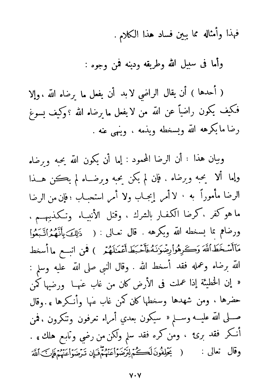 أَحَدُهَا: أَنْ يُقَالَ الرَّاضِي لَا بُدَّ أَنْ يَفْعَلَ مَا يَرْضَاهُ اللَّهُ وَإِلَّا فَكَيْفَ يَكُونُ رَاضِيًا عَنْ اللَّهِ مَنْ لَا يَفْعَلُ مَا يَرْضَاهُ اللَّهُ؟ وَكَيْفَ يَسُوغُ رِضَا مَا يَكْرَهُهُ اللَّهُ وَيَسْخَطُهُ وَيَذُمُّهُ وَيَنْهَى عَنْهُ. وَبَيَانُ هَذَا: أَنَّ الرِّضَا الْمَحْمُودَ: إمَّا أَنْ يَكُونَ اللَّهُ يُحِبُّهُ وَيَرْضَاهُ وَإِمَّا أَلَّا يُحِبَّهُ وَيَرْضَاهُ فَإِنْ لَمْ يَكُنْ يُحِبُّهُ وَيَرْضَاهُ لَمْ يَكُنْ هَذَا الرِّضَا مَأْمُورًا بِهِ لَا أَمْرَ إيجَابٍ وَلَا أَمْرَ اسْتِحْبَابٍ؛ فَإِنَّ مِنْ الرِّضَا مَا هُوَ كُفْرٌ كَرِضَا الْكُفَّارِ بِالشِّرْكِ وَقَتْلِ الْأَنْبِيَاءِ وَتَكْذِيبِهِمْ وَرِضَاهُمْ بِمَا يَسْخَطُهُ اللَّهُ وَيَكْرَهُهُ. قَالَ تَعَالَى: {ذَلِكَ بِأَنَّهُمُ اتَّبَعُوا مَا أَسْخَطَ اللَّهَ وَكَرِهُوا رِضْوَانَهُ فَأَحْبَطَ أَعْمَالَهُمْ} فَمَنْ اتَّبَعَ مَا أَسْخَطَ اللَّهَ بِرِضَاهُ وَعَمَلِهِ فَقَدْ أَسْخَطَ اللَّهَ. وَقَالَ النَّبِيُّ صَلَّى اللَّهُ عَلَيْهِ وَسَلَّمَ {إنَّ الْخَطِيئَةَ إذَا عُمِلَتْ فِي الْأَرْضِ كَانَ مَنْ غَابَ عَنْهَا وَرَضِيَهَا كَمَنْ حَضَرَهَا وَمَنْ شَهِدَهَا وَسَخِطَهَا كَانَ كَمَنْ غَابَ عَنْهَا وَأَنْكَرَهَا} . وَقَالَ صَلَّى اللَّهُ عَلَيْهِ وَسَلَّمَ {سَيَكُونُ بَعْدِي أُمَرَاءُ تَعْرِفُونَ وَتُنْكِرُونَ فَمَنْ أَنْكَرَ فَقَدْ بَرِئَ وَمَنْ كَرِهَ فَقَدْ سَلِمَ وَلَكِنْ مَنْ رَضِيَ وَتَابَعَ هَلَكَ} . وَقَالَ تَعَالَى: {يَحْلِفُونَ لَكُمْ لِتَرْضَوْا عَنْهُمْ فَإِنْ تَرْضَوْا عَنْهُمْ فَإِنَّ اللَّهَ