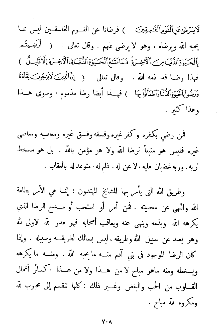 لَا يَرْضَى عَنِ الْقَوْمِ الْفَاسِقِينَ} فَرِضَانَا عَنْ الْقَوْمِ الْفَاسِقِينَ لَيْسَ مِمَّا يُحِبُّهُ اللَّهُ وَيَرْضَاهُ وَهُوَ لَا يَرْضَى عَنْهُمْ. وَقَالَ تَعَالَى: {أَرَضِيتُمْ بِالْحَيَاةِ الدُّنْيَا مِنَ الْآخِرَةِ فَمَا مَتَاعُ الْحَيَاةِ الدُّنْيَا فِي الْآخِرَةِ إلَّا قَلِيلٌ} فَهَذَا رِضًا قَدْ ذَمَّهُ اللَّهُ. وَقَالَ تَعَالَى {إنَّ الَّذِينَ لَا يَرْجُونَ لِقَاءَنَا وَرَضُوا بِالْحَيَاةِ الدُّنْيَا وَاطْمَأَنُّوا بِهَا} فَهَذَا أَيْضًا رِضًا مَذْمُومٌ وَسِوَى هَذَا وَهَذَا كَثِيرٌ. فَمَنْ رَضِيَ بِكُفْرِهِ وَكُفْرِ غَيْرِهِ وَفِسْقِهِ وَفِسْقِ غَيْرِهِ وَمَعَاصِيهِ وَمَعَاصِي غَيْرِهِ فَلَيْسَ هُوَ مُتَّبِعًا لِرِضَا اللَّهِ وَلَا هُوَ مُؤْمِنٌ بِاَللَّهِ. بَلْ هُوَ مُسْخِطٌ لِرَبِّهِ وَرَبُّهُ غَضْبَانُ عَلَيْهِ لَاعِنٌ لَهُ ذَامٌّ لَهُ مُتَوَعِّدٌ لَهُ بِالْعِقَابِ. وَطَرِيقُ اللَّهِ الَّتِي يَأْمُرُ بِهَا الْمَشَايِخُ الْمُهْتَدُونَ: إنَّمَا هِيَ الْأَمْرُ بِطَاعَةِ اللَّهِ وَالنَّهْيُ عَنْ مَعْصِيَتِهِ. فَمَنْ أَمَرَ أَوْ اسْتَحَبَّ أَوْ مَدَحَ الرِّضَا الَّذِي يَكْرَهُهُ اللَّهُ وَيَذُمُّهُ وَيَنْهَى عَنْهُ وَيُعَاقِبُ أَصْحَابَهُ فَهُوَ عَدُوٌّ لِلَّهِ لَا وَلِيٌّ لِلَّهِ وَهُوَ يَصُدُّ عَنْ سَبِيلِ اللَّهِ وَطَرِيقُهُ لَيْسَ بِسَالِكِ لِطَرِيقِهِ وَسَبِيلِهِ. وَإِذَا كَانَ الرِّضَا الْمَوْجُودُ فِي بَنِي آدَمَ مِنْهُ مَا يُحِبُّهُ اللَّهُ وَمِنْهُ مَا يَكْرَهُهُ وَيَسْخَطُهُ وَمِنْهُ مَا هُوَ مُبَاحٌ لَا مِنْ هَذَا وَلَا مِنْ هَذَا كَسَائِرِ أَعْمَالِ الْقُلُوبِ مِنْ الْحُبِّ وَالْبُغْضِ وَغَيْرِ ذَلِكَ: كُلُّهَا تَنْقَسِمُ إلَى مَحْبُوبٍ لِلَّهِ وَمَكْرُوهٍ لِلَّهِ مُبَاحٍ.