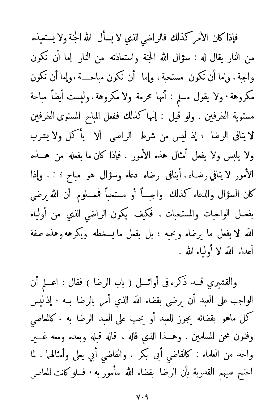 فَإِذَا كَانَ الْأَمْرُ كَذَلِكَ فَالرَّاضِي الَّذِي لَا يَسْأَلُ اللَّهَ الْجَنَّةَ وَلَا يَسْتَعِيذُهُ مِنْ النَّارِ يُقَالُ لَهُ: سُؤَالُ اللَّهِ الْجَنَّةَ وَاسْتِعَاذَتُهُ مِنْ النَّارِ إمَّا أَنْ تَكُونَ وَاجِبَةً وَإِمَّا أَنْ تَكُونَ مُسْتَحَبَّةً وَإِمَّا أَنْ تَكُونَ مُبَاحَةً وَإِمَّا أَنْ تَكُونَ مَكْرُوهَةً وَلَا يَقُولُ مُسْلِمٌ: إنَّهَا مُحَرَّمَةٌ وَلَا مَكْرُوهَةٌ وَلَيْسَتْ أَيْضًا مُبَاحَةً مُسْتَوِيَةَ الطَّرَفَيْنِ. وَلَوْ قِيلَ: إنَّهَا كَذَلِكَ فَفِعْلُ الْمُبَاحِ الْمُسْتَوِي الطَّرَفَيْنِ لَا يُنَافِي الرِّضَا؛ إذْ لَيْسَ مِنْ شَرْطِ الرَّاضِي أَلَّا يَأْكُلَ وَلَا يَشْرَبَ وَلَا يَلْبَسَ وَلَا يَفْعَلَ أَمْثَالَ هَذِهِ الْأُمُورِ. فَإِذَا كَانَ مَا يَفْعَلُهُ مِنْ هَذِهِ الْأُمُورِ لَا يُنَافِي رِضَاهُ أَيُنَافِي رِضَاهُ دُعَاءٌ وَسُؤَالٌ هُوَ مُبَاحٌ. وَإِذَا كَانَ السُّؤَالُ وَالدُّعَاءُ كَذَلِكَ وَاجِبًا أَوْ مُسْتَحَبًّا فَمَعْلُومٌ أَنَّ اللَّهَ يَرْضَى بِفِعْلِ الْوَاجِبَاتِ وَالْمُسْتَحَبَّات فَكَيْفَ يَكُونُ الرَّاضِي الَّذِي مِنْ أَوْلِيَاءِ اللَّهِ لَا يَفْعَلُ مَا يَرْضَاهُ وَيُحِبُّهُ؛ بَلْ يَفْعَلُ مَا يَسْخَطُهُ وَيَكْرَهُهُ وَهَذِهِ صِفَةُ أَعْدَاءِ اللَّهِ لَا أَوْلِيَاءِ اللَّهِ. والقشيري قَدْ ذَكَرَهُ فِي أَوَائِلِ (بَابِ الرِّضَا فَقَالَ: اعْلَمْ أَنَّ الْوَاجِبَ عَلَى الْعَبْدِ أَنْ يَرْضَى بِقَضَاءِ اللَّهِ الَّذِي أَمَرَ بِالرِّضَا بِهِ إذْ لَيْسَ كُلُّ مَا هُوَ بِقَضَائِهِ يَجُوزُ لِلْعَبْدِ أَوْ يَجِبُ عَلَى الْعَبْدِ الرِّضَا بِهِ. كَالْمَعَاصِي وَفُنُونِ مِحَنِ الْمُسْلِمِينَ. وَهَذَا الَّذِي قَالَهُ قَالَهُ قَبْلَهُ وَبَعْدَهُ وَمَعَهُ غَيْرُ وَاحِدٍ مِنْ الْعُلَمَاءِ: كَالْقَاضِي أَبِي بَكْرٍ وَالْقَاضِي أَبِي يَعْلَى وَأَمْثَالِهِمَا لَمَّا احْتَجَّ عَلَيْهِمْ الْقَدَرِيَّةُ بِأَنَّ الرِّضَا بِقَضَاءِ اللَّهِ مَأْمُورٌ بِهِ فَلَوْ كَانَتْ الْمَعَاصِي