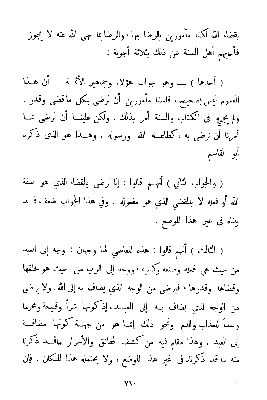 بِقَضَاءِ اللَّهِ لَكُنَّا مَأْمُورِينَ بِالرِّضَا بِهَا وَالرِّضَا بِمَا نَهَى اللَّهُ عَنْهُ لَا يَجُوزُ فَأَجَابَهُمْ أَهْلُ السُّنَّةِ عَنْ ذَلِكَ بِثَلَاثَةِ أَجْوِبَةٍ: (أَحَدُهَا - وَهُوَ جَوَابُ هَؤُلَاءِ وَجَمَاهِيرِ الْأَئِمَّةِ - أَنَّ هَذَا الْعُمُومَ لَيْسَ بِصَحِيحِ فَلَسْنَا مَأْمُورِينَ أَنْ نَرْضَى بِكُلِّ مَا قَضَى وَقَدَّرَ وَلَمْ يَجِئْ فِي الْكِتَابِ وَالسُّنَّةِ أَمْرٌ بِذَلِكَ وَلَكِنْ عَلَيْنَا أَنْ نَرْضَى بِمَا أَمَرَنَا أَنْ نَرْضَى بِهِ كَطَاعَةِ اللَّهِ وَرَسُولِهِ. وَهَذَا هُوَ الَّذِي ذَكَرَهُ أَبُو الْقَاسِمِ. (وَالْجَوَابُ الثَّانِي أَنَّهُمْ قَالُوا: إنَّا نَرْضَى بِالْقَضَاءِ الَّذِي هُوَ صِفَةُ اللَّهِ أَوْ فِعْلُهُ لَا بِالْمَقْضِيِّ الَّذِي هُوَ مَفْعُولُهُ. وَفِي هَذَا الْجَوَابِ ضَعْفٌ قَدْ بَيَّنَّاهُ فِي غَيْرِ هَذَا الْمَوْضِعِ. (الثَّالِثُ أَنَّهُمْ قَالُوا: هَذِهِ الْمَعَاصِي لَهَا وَجْهَانِ: وَجْهٌ إلَى الْعَبْدِ مِنْ حَيْثُ هِيَ فِعْلُهُ وَصُنْعُهُ وَكَسْبُهُ وَوَجْهٌ إلَى الرَّبِّ مِنْ حَيْثُ هُوَ خَلَقَهَا وَقَضَاهَا وَقَدَّرَهَا فَيَرْضَى مِنْ الْوَجْهِ الَّذِي يُضَافُ بِهِ إلَى اللَّهِ وَلَا يَرْضَى مِنْ الْوَجْهِ الَّذِي يُضَافُ بِهِ إلَى الْعَبْدِ إذْ كَوْنُهَا شَرًّا وَقَبِيحَةً وَمُحَرَّمًا وَسَبَبًا لِلْعَذَابِ وَالذَّمِّ وَنَحْوِ ذَلِكَ إنَّمَا هُوَ مِنْ جِهَةِ كَوْنِهَا مُضَافَةً إلَى الْعَبْدِ. وَهَذَا مَقَامٌ فِيهِ مِنْ كَشْفِ الْحَقَائِقِ وَالْأَسْرَارِ مَا قَدْ ذَكَرْنَا مِنْهُ مَا قَدْ ذَكَرْنَاهُ فِي غَيْرِ هَذَا الْمَوْضِعِ؛ وَلَا يَحْتَمِلُهُ هَذَا الْمَكَانُ. فَإِنَّ