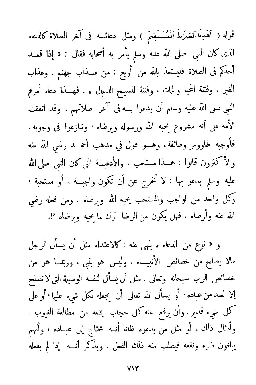 قَوْلِهِ {اهْدِنَا الصِّرَاطَ الْمُسْتَقِيمَ} وَمِثْلَ دُعَائِهِ فِي آخِرِ الصَّلَاةِ كَالدُّعَاءِ الَّذِي كَانَ النَّبِيُّ صَلَّى اللَّهُ عَلَيْهِ وَسَلَّمَ يَأْمُرُ بِهِ أَصْحَابَهُ فَقَالَ: {إذَا قَعَدَ أَحَدُكُمْ فِي الصَّلَاةِ فَلْيَسْتَعِذْ بِاَللَّهِ مِنْ أَرْبَعٍ: مِنْ عَذَابِ جَهَنَّمَ وَعَذَابِ الْقَبْرِ وَفِتْنَةِ الْمَحْيَا وَالْمَمَاتِ وَفِتْنَةِ الْمَسِيحِ الدَّجَّالِ} . فَهَذَا دُعَاءٌ أَمَرَهُمْ النَّبِيُّ صَلَّى اللَّهُ عَلَيْهِ وَسَلَّمَ أَنْ يَدْعُوا بِهِ فِي آخِرِ صَلَاتِهِمْ. وَقَدْ اتَّفَقَتْ الْأُمَّةُ عَلَى أَنَّهُ مَشْرُوعٌ يُحِبُّهُ اللَّهُ وَرَسُولُهُ وَيَرْضَاهُ وَتَنَازَعُوا فِي وُجُوبِهِ. فَأَوْجَبَهُ طَاوُوسٌ وَطَائِفَةٌ وَهُوَ قَوْلٌ فِي مَذْهَبِ أَحْمَد رَضِيَ اللَّهُ عَنْهُ وَالْأَكْثَرُونَ قَالُوا: هَذَا مُسْتَحَبٌّ وَالْأَدْعِيَةُ الَّتِي كَانَ النَّبِيُّ صَلَّى اللَّهُ عَلَيْهِ وَسَلَّمَ يَدْعُو بِهَا: لَا تَخْرُجُ عَنْ أَنْ تَكُونَ وَاجِبَةً أَوْ مُسْتَحَبَّةً وَكُلُّ وَاحِدٍ مِنْ الْوَاجِبِ وَالْمُسْتَحَبِّ يُحِبُّهُ اللَّهُ وَيَرْضَاهُ. وَمَنْ فَعَلَهُ رَضِيَ اللَّهُ عَنْهُ وَأَرْضَاهُ فَهَلْ يَكُونُ مِنْ الرِّضَا تَرْكُ مَا يُحِبُّهُ وَيَرْضَاهُ. وَ " نَوْعٌ مِنْ الدُّعَاءِ " يَنْهَى عَنْهُ: كَالِاعْتِدَاءِ مِثْلَ أَنْ يَسْأَلَ الرَّجُلُ مَا لَا يَصْلُحُ مِنْ خَصَائِصِ الْأَنْبِيَاءِ وَلَيْسَ هُوَ بِنَبِيِّ وَرُبَّمَا هُوَ مِنْ خَصَائِصِ الرَّبِّ سُبْحَانَهُ وَتَعَالَى. مِثْلَ أَنْ يَسْأَلَ لِنَفْسِهِ الْوَسِيلَةَ الَّتِي لَا تَصْلُحُ إلَّا لِعَبْدِ مِنْ عِبَادِهِ أَوْ يَسْأَلَ اللَّهَ تَعَالَى أَنْ يَجْعَلَهُ بِكُلِّ شَيْءٍ عَلِيمًا أَوْ عَلَى كُلِّ شَيْءٍ قَدِيرًا وَأَنْ يَرْفَعَ عَنْهُ كُلَّ حِجَابٍ يَمْنَعُهُ مِنْ مُطَالَعَةِ الْغُيُوبِ. وَأَمْثَالِ ذَلِكَ أَوْ مِثْلَ مَنْ يَدْعُوهُ ظَانًّا أَنَّهُ مُحْتَاجٌ إلَى عِبَادِهِ؛ وَأَنَّهُمْ يَبْلُغُونَ ضَرَّهُ وَنَفْعَهُ فَيَطْلُبُ مِنْهُ ذَلِكَ الْفِعْلَ. وَيَذْكُرُ أَنَّهُ إذَا لَمْ يَفْعَلْهُ