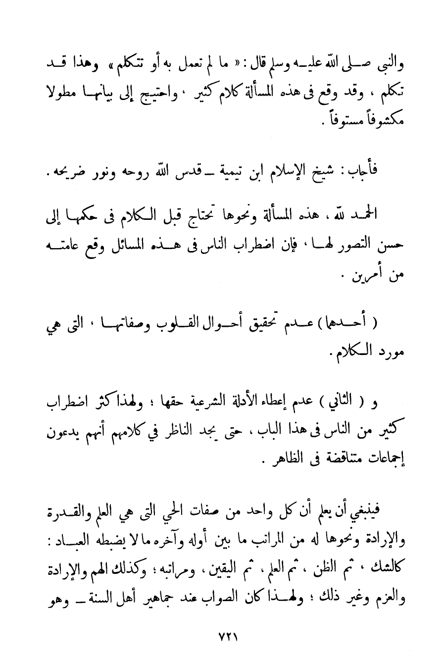 وَالثَّانِي عَدَمُ إعْطَاءِ الْأَدِلَّةِ الشَّرْعِيَّةِ حَقَّهَا؛ وَلِهَذَا كَثُرَ اضْطِرَابُ كَثِيرٍ مِنْ النَّاسِ فِي هَذَا الْبَابِ حَتَّى يَجِدَ النَّاظِرُ فِي كَلَامِهِمْ أَنَّهُمْ يَدَّعُونَ إجماعات مُتَنَاقِضَةً فِي الظَّاهِرِ. فَيَنْبَغِي أَنْ يَعْلَمَ أَنَّ كُلَّ وَاحِدٍ مِنْ صِفَاتِ الْحَيِّ الَّتِي هِيَ الْعِلْمُ وَالْقُدْرَةُ وَالْإِرَادَةُ وَنَحْوُهَا لَهُ مِنْ الْمَرَاتِبِ مَا بَيْنَ أَوَّلِهِ وَآخِرِهِ مَا لَا يَضْبُطُهُ الْعِبَادُ: كَالشَّكِّ ثُمَّ الظَّنِّ ثُمَّ الْعِلْمِ ثُمَّ الْيَقِينِ وَمَرَاتِبِهِ؛ وَكَذَلِكَ الْهَمُّ وَالْإِرَادَةُ وَالْعَزْمُ وَغَيْرُ ذَلِكَ؛ وَلِهَذَا كَانَ الصَّوَابُ عِنْدَ جَمَاهِيرِ أَهْلِ السُّنَّةِ - وَهُوَ