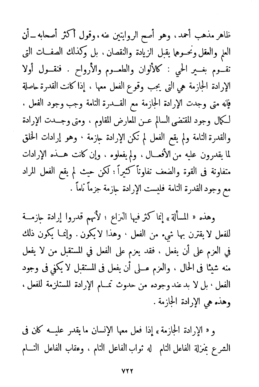 ظَاهِرُ مَذْهَبِ أَحْمَد وَهُوَ أَصَحُّ الرِّوَايَتَيْنِ عَنْهُ وَقَوْلُ أَكْثَرِ أَصْحَابِهِ - أَنَّ الْعِلْمَ وَالْعَقْلَ وَنَحْوَهُمَا يَقْبَلُ الزِّيَادَةَ وَالنُّقْصَانَ بَلْ وَكَذَلِكَ الصِّفَاتُ الَّتِي تَقُومُ بِغَيْرِ الْحَيِّ: كَالْأَلْوَانِ وَالطُّعُومِ وَالْأَرْوَاحِ. فَنَقُولُ أَوَّلًا الْإِرَادَةُ الْجَازِمَةُ هِيَ الَّتِي يَجِبُ وُقُوعُ الْفِعْلِ مَعَهَا إذَا كَانَتْ الْقُدْرَةُ حَاصِلَةً فَإِنَّهُ مَتَى وُجِدَتْ الْإِرَادَةُ الْجَازِمَةُ مَعَ الْقُدْرَةِ التَّامَّةِ وَجَبَ وُجُودُ الْفِعْلِ لِكَمَالِ وُجُودِ الْمُقْتَضِي السَّالِمِ عَنْ الْمُعَارِضِ الْمُقَاوِمِ وَمَتَى وُجِدَتْ الْإِرَادَةُ وَالْقُدْرَةُ التَّامَّةُ وَلَمْ يَقَعْ الْفِعْلُ لَمْ تَكُنْ الْإِرَادَةُ جَازِمَةً وَهُوَ إرَادَاتُ الْخَلْقِ لِمَا يَقْدِرُونَ عَلَيْهِ مِنْ الْأَفْعَالِ وَلَمْ يَفْعَلُوهُ وَإِنْ كَانَتْ هَذِهِ الْإِرَادَاتُ مُتَفَاوِتَةً فِي الْقُوَّةِ وَالضَّعْفِ تَفَاوُتًا كَثِيرًا؛ لَكِنْ حَيْثُ لَمْ يَقَعْ الْفِعْلُ الْمُرَادُ مَعَ وُجُودِ الْقُدْرَةِ التَّامَّةِ فَلَيْسَتْ الْإِرَادَةُ جَازِمَةً جَزْمًا تَامًّا. وَهَذِهِ " الْمَسْأَلَةُ " إنَّمَا كَثُرَ فِيهَا النِّزَاعُ؛ لِأَنَّهُمْ قَدَّرُوا إرَادَةً جَازِمَةً لِلْفِعْلِ لَا يَقْتَرِنُ بِهَا شَيْءٌ مِنْ الْفِعْلِ وَهَذَا لَا يَكُونُ. وَإِنَّمَا يَكُونُ ذَلِكَ فِي الْعَزْمِ عَلَى أَنْ يَفْعَلَ فَقَدْ يَعْزِمُ عَلَى الْفِعْلِ فِي الْمُسْتَقْبَلِ مَنْ لَا يَفْعَلُ مِنْهُ شَيْئًا فِي الْحَالِ وَالْعَزْمُ عَلَى أَنْ يَفْعَلَ فِي الْمُسْتَقْبَلِ لَا يَكْفِي فِي وُجُودِ الْفِعْلِ بَلْ لَا بُدَّ عِنْدَ وُجُودِهِ مِنْ حُدُوثِ تَمَامِ الْإِرَادَةِ الْمُسْتَلْزِمَةِ لِلْفِعْلِ وَهَذِهِ هِيَ الْإِرَادَةُ الْجَازِمَةُ. وَ " الْإِرَادَةُ الْجَازِمَةُ " إذَا فَعَلَ مَعَهَا الْإِنْسَانُ مَا يَقْدِرُ عَلَيْهِ كَانَ فِي الشَّرْعِ بِمَنْزِلَةِ الْفَاعِلِ التَّامِّ: لَهُ ثَوَابُ الْفَاعِلِ التَّامِّ وَعِقَابُ الْفَاعِلِ التَّامِّ