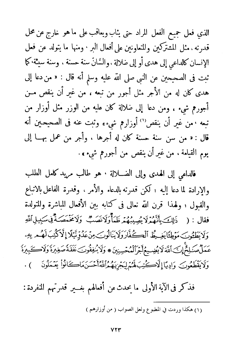 الَّذِي فَعَلَ جَمِيعَ الْفِعْلِ الْمُرَادِ حَتَّى يُثَابَ وَيُعَاقَبَ عَلَى مَا هُوَ خَارِجٌ عَنْ مَحَلِّ قُدْرَتِهِ مِثْلَ الْمُشْتَرِكِينَ والمتعاونين عَلَى أَفْعَالِ الْبِرِّ وَمِنْهَا مَا يَتَوَلَّدُ عَنْ فِعْلِ الْإِنْسَانِ كَالدَّاعِي إلَى هُدًى أَوْ إلَى ضَلَالَةٍ وَالسَّانِّ سُنَّةً حَسَنَةً وَسُنَّةً سَيِّئَةً كَمَا ثَبَتَ فِي الصَّحِيحَيْنِ عَنْ النَّبِيِّ صَلَّى اللَّهُ عَلَيْهِ وَسَلَّمَ أَنَّهُ قَالَ: {مَنْ دَعَا إلَى هُدًى كَانَ لَهُ مِنْ الْأَجْرِ مِثْلُ أُجُورِ مَنْ تَبِعَهُ مِنْ غَيْرِ أَنْ يَنْقُصَ مِنْ أُجُورِهِمْ شَيْءٌ وَمَنْ دَعَا إلَى ضَلَالَةٍ كَانَ عَلَيْهِ مِنْ الْوِزْرِ مِثْلُ أَوْزَارِ مَنْ تَبِعَهُ مِنْ غَيْرِ أَنْ يَنْقُصَ مِنْ أَوْزَارِهِمْ شَيْءٌ} وَثَبَتَ عَنْهُ فِي الصَّحِيحَيْنِ أَنَّهُ قَالَ: {مَنْ سَنَّ سُنَّةً حَسَنَةً كَانَ لَهُ أَجْرُهَا وَأَجْرُ مَنْ عَمِلَ بِهَا إلَى يَوْمِ الْقِيَامَةِ مِنْ غَيْرِ أَنْ يَنْقُصَ مِنْ أُجُورِهِمْ شَيْءٌ} . فَالدَّاعِي إلَى الْهُدَى وَإِلَى الضَّلَالَةِ هُوَ طَالِبٌ مُرِيدٌ كَامِلُ الطَّلَبِ وَالْإِرَادَةِ لِمَا دَعَا إلَيْهِ؛ لَكِنَّ قُدْرَتَهُ بِالدُّعَاءِ وَالْأَمْرِ وَقُدْرَةَ الْفَاعِلِ بِالِاتِّبَاعِ وَالْقَبُولِ؛ وَلِهَذَا قَرَنَ اللَّهُ تَعَالَى فِي كِتَابِهِ بَيْنَ الْأَفْعَالِ الْمُبَاشِرَةِ وَالْمُتَوَلِّدَةِ فَقَالَ: {ذَلِكَ بِأَنَّهُمْ لَا يُصِيبُهُمْ ظَمَأٌ وَلَا نَصَبٌ وَلَا مَخْمَصَةٌ فِي سَبِيلِ اللَّهِ وَلَا يَطَئُونَ مَوْطِئًا يَغِيظُ الْكُفَّارَ وَلَا يَنَالُونَ مِنْ عَدُوٍّ نَيْلًا إلَّا كُتِبَ لَهُمْ بِهِ عَمَلٌ صَالِحٌ إنَّ اللَّهَ لَا يُضِيعُ أَجْرَ الْمُحْسِنِينَ} {وَلَا يُنْفِقُونَ نَفَقَةً صَغِيرَةً وَلَا كَبِيرَةً وَلَا يَقْطَعُونَ وَادِيًا إلَّا كُتِبَ لَهُمْ لِيَجْزِيَهُمُ اللَّهُ أَحْسَنَ مَا كَانُوا يَعْمَلُونَ} . فَذَكَرَ فِي الْآيَةِ الْأُولَى مَا يَحْدُثُ عَنْ أَفْعَالِهِمْ بِغَيْرِ قُدْرَتِهِمْ الْمُنْفَرِدَةِ: