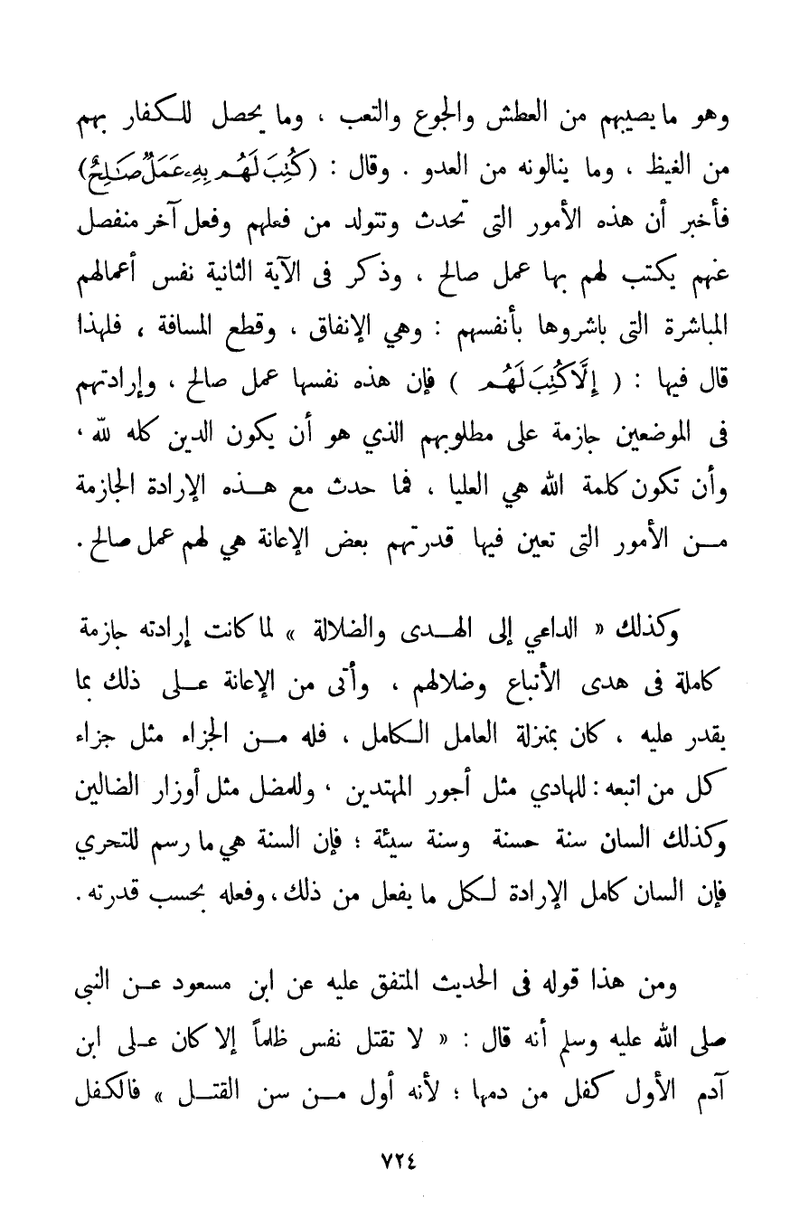 وَهُوَ مَا يُصِيبُهُمْ مِنْ الْعَطَشِ وَالْجُوعِ وَالتَّعَبِ وَمَا يَحْصُلُ لِلْكُفَّارِ بِهِمْ مِنْ الْغَيْظِ وَمَا يَنَالُونَهُ مِنْ الْعَدُوِّ. وَقَالَ: {كُتِبَ لَهُمْ بِهِ عَمَلٌ صَالِحٌ} فَأَخْبَرَ أَنَّ هَذِهِ الْأُمُورَ الَّتِي تَحْدُثُ وَتَتَوَلَّدُ مِنْ فِعْلِهِمْ وَفِعْلٍ آخَرَ مُنْفَصِلٍ عَنْهُمْ يُكْتَبُ لَهُمْ بِهَا عَمَلٌ صَالِحٌ وَذَكَرَ فِي الْآيَةِ الثَّانِيَةِ نَفْسَ أَعْمَالِهِمْ الْمُبَاشِرَةِ الَّتِي بَاشَرُوهَا بِأَنْفُسِهِمْ: وَهِيَ الْإِنْفَاقُ وَقَطْعُ الْمَسَافَةِ فَلِهَذَا قَالَ فِيهَا: {إلَّا كُتِبَ لَهُمْ} فَإِنَّ هَذِهِ نَفْسَهَا عَمَلٌ صَالِحٌ وَإِرَادَتُهُمْ فِي الْمَوْضِعَيْنِ جَازِمَةٌ عَلَى مَطْلُوبِهِمْ الَّذِي هُوَ أَنْ يَكُونَ الدِّينُ كُلُّهُ لِلَّهِ وَأَنْ تَكُونَ كَلِمَةُ اللَّهِ هِيَ الْعُلْيَا فَمَا حَدَثَ مَعَ هَذِهِ الْإِرَادَةِ الْجَازِمَةِ مِنْ الْأُمُورِ الَّتِي تُعِينُ فِيهَا قُدْرَتَهُمْ بَعْضُ الْإِعَانَةِ هِيَ لَهُمْ عَمَلٌ صَالِحٌ. وَكَذَلِكَ " الدَّاعِي إلَى الْهُدَى وَالضَّلَالَةِ " لَمَّا كَانَتْ إرَادَتُهُ جَازِمَةً كَامِلَةً فِي هُدَى الْأَتْبَاعِ وَضَلَالِهِمْ وَأَتَى مِنْ الْإِعَانَةِ عَلَى ذَلِكَ بِمَا يَقْدِرُ عَلَيْهِ كَانَ بِمَنْزِلَةِ الْعَامِلِ الْكَامِلِ فَلَهُ مِنْ الْجَزَاءِ مِثْلُ جَزَاءِ كُلِّ مَنْ اتَّبَعَهُ: لِلْهَادِي مِثْلَ أُجُورِ الْمُهْتَدِينَ وَلِلْمُضِلِّ مِثْلَ أَوْزَارِ الضَّالِّينَ وَكَذَلِكَ السَّانُّ سُنَّةً حَسَنَةً وَسُنَّةً سَيِّئَةً؛ فَإِنَّ السُّنَّةَ هِيَ مَا رُسِمَ لِلتَّحَرِّي فَإِنَّ السَّانَّ كَامِلُ الْإِرَادَةِ لِكُلِّ مَا يَفْعَلُ مِنْ ذَلِكَ وَفِعْلُهُ بِحَسَبِ قُدْرَتِهِ. وَمِنْ هَذَا قَوْلُهُ فِي الْحَدِيثِ الْمُتَّفَقِ عَلَيْهِ عَنْ ابْنِ مَسْعُودٍ عَنْ {النَّبِيِّ صَلَّى اللَّهُ عَلَيْهِ وَسَلَّمَ أَنَّهُ قَالَ: لَا تُقْتَلُ نَفْسٌ ظُلْمًا إلَّا كَانَ عَلَى ابْنِ آدَمَ الْأَوَّلِ كِفْلٌ مِنْ دَمِهَا؛} لِأَنَّهُ أَوَّلُ مَنْ سَنَّ الْقَتْلَ " فَالْكِفْلُ