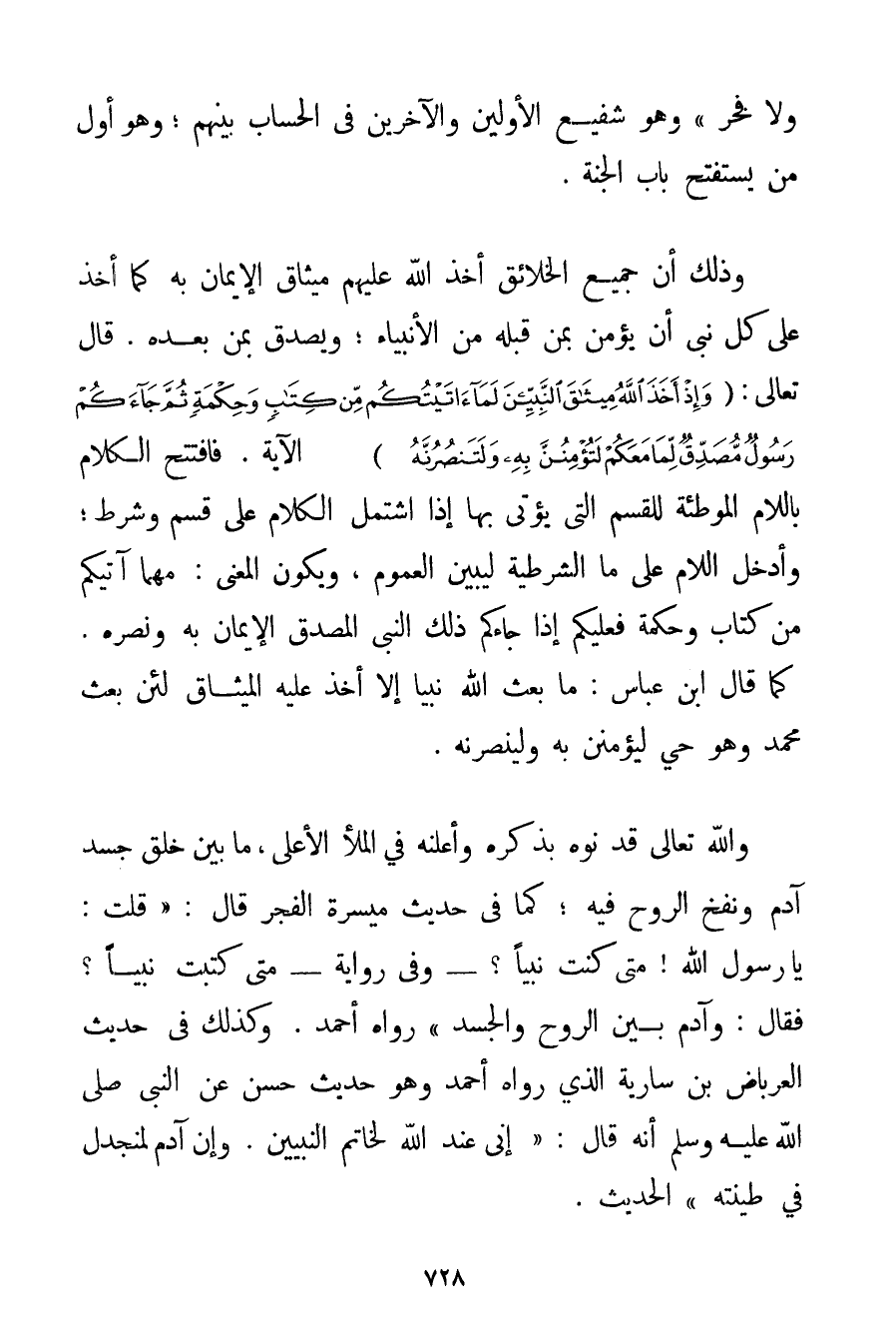 وَلَا فَخْرَ} وَهُوَ شَفِيعُ الْأَوَّلِينَ والآخرين فِي الْحِسَابِ بَيْنَهُمْ؛ وَهُوَ أَوَّلُ مَنْ يَسْتَفْتِحُ بَابَ الْجَنَّةِ. وَذَلِكَ أَنَّ جَمِيعَ الْخَلَائِقِ أَخَذَ اللَّهُ عَلَيْهِمْ مِيثَاقَ الْإِيمَانِ بِهِ كَمَا أَخَذَ عَلَى كُلِّ نَبِيٍّ أَنْ يُؤْمِنَ بِمَنْ قَبْلَهُ مِنْ الْأَنْبِيَاءِ؛ وَيُصَدِّقَ بِمَنْ بَعْدَهُ. قَالَ تَعَالَى: {وَإِذْ أَخَذَ اللَّهُ مِيثَاقَ النَّبِيِّينَ لَمَا آتَيْتُكُمْ مِنْ كِتَابٍ وَحِكْمَةٍ ثُمَّ جَاءَكُمْ رَسُولٌ مُصَدِّقٌ لِمَا مَعَكُمْ لَتُؤْمِنُنَّ بِهِ وَلَتَنْصُرُنَّهُ} الْآيَةَ. فَافْتَتَحَ الْكَلَامَ بِاللَّامِ الْمُوَطِّئَةِ لِلْقَسَمِ الَّتِي يُؤْتَى بِهَا إذَا اشْتَمَلَ الْكَلَامُ عَلَى قَسَمٍ وَشَرْطٍ؛ وَأَدْخَلَ اللَّامَ عَلَى مَا الشَّرْطِيَّةِ لِيُبَيِّنَ الْعُمُومَ وَيَكُونَ الْمَعْنَى: مَهْمَا آتِيكُمْ مِنْ كِتَابٍ وَحِكْمَةٍ فَعَلَيْكُمْ إذَا جَاءَكُمْ ذَلِكَ النَّبِيُّ الْمُصَدِّقُ الْإِيمَانُ بِهِ وَنَصْرُهُ. كَمَا قَالَ ابْنُ عَبَّاسٍ: مَا بَعَثَ اللَّهُ نَبِيًّا إلَّا أَخَذَ عَلَيْهِ الْمِيثَاقَ لَئِنْ بُعِثَ مُحَمَّدٌ وَهُوَ حَيٌّ لَيُؤْمِنَنَّ بِهِ وَلَيَنْصُرَنَّهُ. وَاَللَّهُ تَعَالَى قَدْ نَوَّهَ بِذِكْرِهِ وَأَعْلَنَهُ فِي الْمَلَأِ الْأَعْلَى مَا بَيْنَ خَلْقِ جَسَدِ آدَمَ وَنَفْخِ الرُّوحِ فِيهِ؛ كَمَا فِي {حَدِيثِ مَيْسَرَةَ الْفَجْرِ قَالَ: قُلْت: يَا رَسُولَ اللَّهِ متى كُنْت نَبِيًّا؟ - وَفِي رِوَايَةٍ - مَتَى كُتِبْت نَبِيًّا؟ فَقَالَ: وَآدَمُ بَيْنَ الرُّوحِ وَالْجَسَدِ} رَوَاهُ أَحْمَد. وَكَذَلِكَ فِي حَدِيثِ العرباض بْنِ سَارِيَةَ الَّذِي رَوَاهُ أَحْمَد وَهُوَ حَدِيثٌ حَسَنٌ عَنْ النَّبِيِّ صَلَّى اللَّهُ عَلَيْهِ وَسَلَّمَ أَنَّهُ {قَالَ: إنِّي عِنْدَ اللَّهِ لَخَاتَمُ النَّبِيِّينَ. وَإِنَّ آدَمَ لَمُنْجَدِلٌ فِي طِينَتِهِ} الْحَدِيثَ.