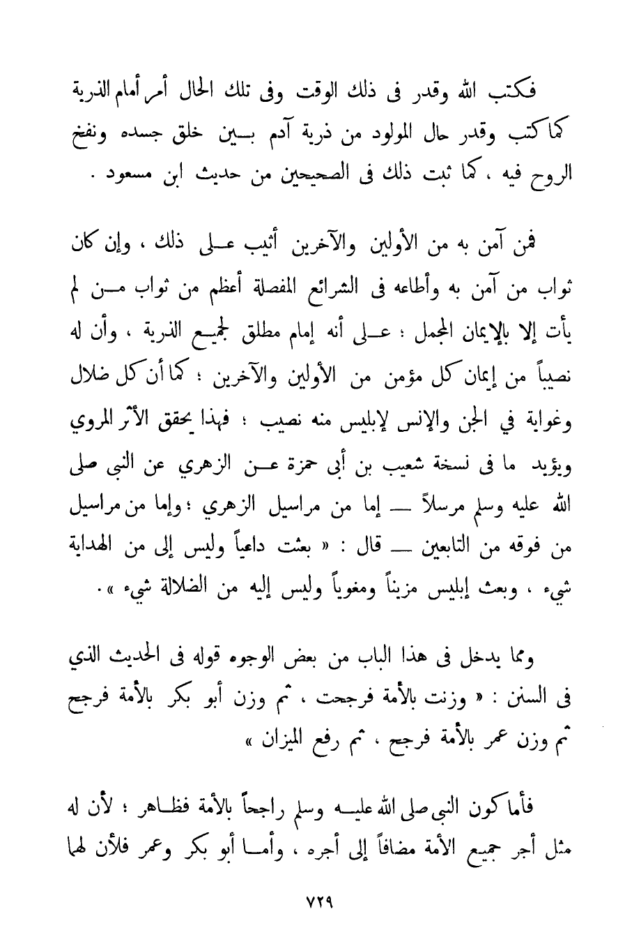 فَكَتَبَ اللَّهُ وَقَدَّرَ فِي ذَلِكَ الْوَقْتِ وَفِي تِلْكَ الْحَالِ أَمْرَ إمَامِ الذُّرِّيَّةِ كَمَا كَتَبَ وَقَدَّرَ حَالَ الْمَوْلُودِ مِنْ ذُرِّيَّةِ آدَمَ بَيْنَ خَلْقِ جَسَدِهِ وَنَفْخِ الرُّوحِ فِيهِ كَمَا ثَبَتَ ذَلِكَ فِي الصَّحِيحَيْنِ مِنْ حَدِيثِ ابْنِ مَسْعُودٍ. فَمَنْ آمَنَ بِهِ مِنْ الْأَوَّلِينَ والآخرين أُثِيبَ عَلَى ذَلِكَ وَإِنْ كَانَ ثَوَابُ مَنْ آمَنَ بِهِ وَأَطَاعَهُ فِي الشَّرَائِعِ الْمُفَصَّلَةِ أَعْظَمَ مِنْ ثَوَابِ مَنْ لَمْ يَأْتِ إلَّا بِالْإِيمَانِ الْمُجْمَلِ؛ عَلَى أَنَّهُ إمَامٌ مُطْلَقٌ لِجَمِيعِ الذُّرِّيَّةِ وَأَنَّ لَهُ نَصِيبًا مِنْ إيمَانِ كُلِّ مُؤْمِنٍ مِنْ الْأَوَّلِينَ والآخرين؛ كَمَا أَنَّ كُلَّ ضَلَالٍ وغواية فِي الْجِنِّ وَالْإِنْسِ لإبليس مِنْهُ نَصِيبٌ؛ فَهَذَا يُحَقِّقُ الْأَثَرَ الْمَرْوِيَّ وَيُؤَيِّدُ مَا فِي نُسْخَةِ شُعَيْبِ بْنِ أَبِي حَمْزَةَ عَنْ الزُّهْرِيِّ عَنْ النَّبِيِّ صَلَّى اللَّهُ عَلَيْهِ وَسَلَّمَ مُرْسَلًا - إمَّا مِنْ مَرَاسِيلِ الزُّهْرِيِّ. وَإِمَّا مِنْ مَرَاسِيلِ مَنْ فَوْقَهُ مِنْ التَّابِعِينَ - قَالَ: {بُعِثْت دَاعِيًا وَلَيْسَ إلَيَّ مِنْ الْهِدَايَةِ شَيْءٌ وَبُعِثَ إبْلِيسُ مُزَيِّنًا وَمُغْوِيًا وَلَيْسَ إلَيْهِ مِنْ الضَّلَالَةِ شَيْءٌ} . وَمِمَّا يَدْخُلُ فِي هَذَا الْبَابِ مِنْ بَعْضِ الْوُجُوهِ قَوْلُهُ فِي الْحَدِيثِ الَّذِي فِي السُّنَنِ: {وُزِنْت بِالْأُمَّةِ فَرَجَحْت ثُمَّ وُزِنَ أَبُو بَكْرٍ بِالْأُمَّةِ فَرَجَحَ ثُمَّ وُزِنَ عُمَرُ بِالْأُمَّةِ فَرَجَحَ ثُمَّ رُفِعَ الْمِيزَانُ} فَأَمَّا كَوْنُ النَّبِيِّ صَلَّى اللَّهُ عَلَيْهِ وَسَلَّمَ رَاجِحًا بِالْأُمَّةِ فَظَاهِرٌ؛ لِأَنَّ لَهُ مِثْلَ أَجْرِ جَمِيعِ الْأُمَّةِ مُضَافًا إلَى أَجْرِهِ وَأَمَّا أَبُو بَكْرٍ وَعُمَرَ فَلِأَنَّ لَهُمَا
