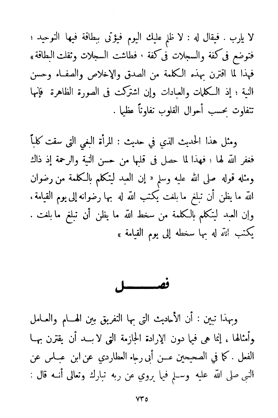 لَا يَا رَبِّ. فَيُقَالُ لَهُ: لَا ظُلْمَ عَلَيْك الْيَوْمَ فَيُؤْتَى بِبِطَاقَةِ فِيهَا التَّوْحِيدُ؛ فَتُوضَعُ فِي كِفَّةٍ وَالسِّجِلَّاتُ فِي كِفَّةٍ فَطَاشَتْ السِّجِلَّاتُ وَثَقُلَتْ الْبِطَاقَةُ} فَهَذَا لِمَا اقْتَرَنَ بِهَذِهِ الْكَلِمَةِ مِنْ الصِّدْقِ وَالْإِخْلَاصِ وَالصَّفَاءِ وَحُسْنِ النِّيَّةِ؛ إذْ الْكَلِمَاتُ وَالْعِبَادَاتُ وَإِنْ اشْتَرَكَتْ فِي الصُّورَةِ الظَّاهِرَةِ فَإِنَّهَا تَتَفَاوَتُ بِحَسَبِ أَحْوَالِ الْقُلُوبِ تَفَاوُتًا عَظِيمًا. وَمِثْلُ هَذَا الْحَدِيثِ الَّذِي فِي حَدِيثِ: الْمَرْأَةِ الْبَغِيِّ الَّتِي سَقَتْ كَلْبًا فَغَفَرَ اللَّهُ لَهَا؛ فَهَذَا لِمَا حَصَلَ فِي قَلْبِهَا مِنْ حُسْنِ النِّيَّةِ وَالرَّحْمَةِ إذْ ذَاكَ وَمِثْلُهُ قَوْلُهُ صَلَّى اللَّهُ عَلَيْهِ وَسَلَّمَ {إنَّ الْعَبْدَ لَيَتَكَلَّمُ بِالْكَلِمَةِ مِنْ رِضْوَانِ اللَّهِ مَا يَظُنُّ أَنْ تَبْلُغَ مَا بَلَغَتْ يَكْتُبُ اللَّهُ لَهُ بِهَا رِضْوَانَهُ إلَى يَوْمِ الْقِيَامَةِ وَإِنَّ الْعَبْدَ لَيَتَكَلَّمُ بِالْكَلِمَةِ مِنْ سَخَطِ اللَّهِ مَا يَظُنُّ أَنْ تَبْلُغَ مَا بَلَغَتْ. يَكْتُبُ اللَّهُ لَهُ بِهَا سُخْطَهُ إلَى يَوْمِ الْقِيَامَةِ}