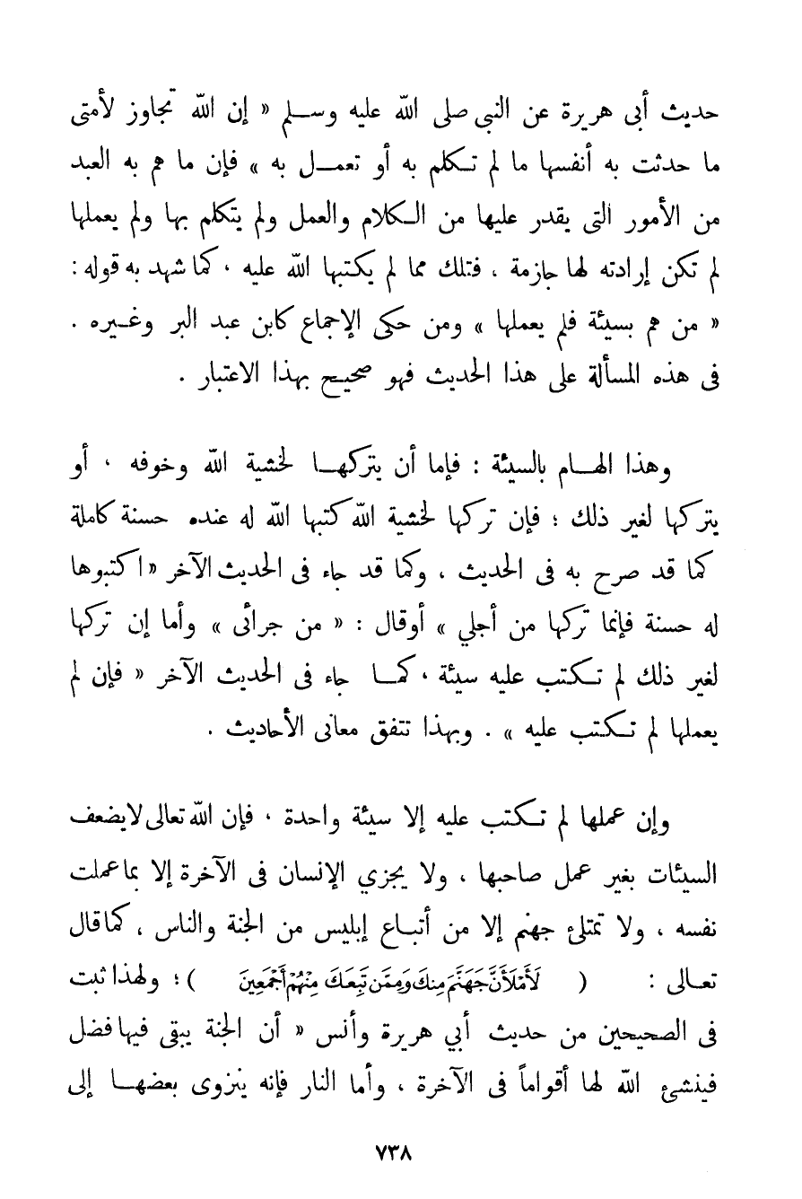 حَدِيثِ أَبِي هُرَيْرَةَ عَنْ النَّبِيِّ صَلَّى اللَّهُ عَلَيْهِ وَسَلَّمَ {إنَّ اللَّهَ تَجَاوَزَ لِأُمَّتِي مَا حَدَّثَتْ بِهِ أَنْفُسَهَا مَا لَمْ تَكَلَّمْ بِهِ أَوْ تَعْمَلَ بِهِ} فَإِنَّ مَا هَمَّ بِهِ الْعَبْدُ مِنْ الْأُمُورِ الَّتِي يَقْدِرُ عَلَيْهَا مِنْ الْكَلَامِ وَالْعَمَلِ وَلَمْ يَتَكَلَّمْ بِهَا وَلَمْ يَعْمَلْهَا لَمْ تَكُنْ إرَادَتُهُ لَهَا جَازِمَةً فَتِلْكَ مِمَّا لَمْ يَكْتُبْهَا اللَّهُ عَلَيْهِ كَمَا شَهِدَ بِهِ قَوْلُهُ: {مَنْ هَمَّ بِسَيِّئَةٍ فَلَمْ يَعْمَلْهَا} وَمَنْ حَكَى الْإِجْمَاعَ كَابْنِ عَبْدِ الْبَرِّ وَغَيْرِهِ. فِي هَذِهِ الْمَسْأَلَةِ عَلَى هَذَا الْحَدِيثِ فَهُوَ صَحِيحٌ بِهَذَا الِاعْتِبَارِ. وَهَذَا الْهَامُّ بِالسَّيِّئَةِ: فَإِمَّا أَنْ يَتْرُكَهَا لِخَشْيَةِ اللَّهِ وَخَوْفِهِ أَوْ يَتْرُكَهَا لِغَيْرِ ذَلِكَ؛ فَإِنْ تَرَكَهَا لِخَشْيَةِ اللَّهِ كَتَبَهَا اللَّهُ لَهُ عِنْدَهُ حَسَنَةً كَامِلَةً كَمَا قَدْ صَرَّحَ بِهِ فِي الْحَدِيثِ وَكَمَا قَدْ جَاءَ فِي الْحَدِيثِ الْآخَرِ {اُكْتُبُوهَا لَهُ حَسَنَةً فَإِنَّمَا تَرَكَهَا مِنْ أَجْلِي أَوْ قَالَ: مِنْ جَرَّائِي} وَأَمَّا إنْ تَرَكَهَا لِغَيْرِ ذَلِكَ لَمْ تُكْتَبْ عَلَيْهِ سَيِّئَةً كَمَا جَاءَ فِي الْحَدِيثِ الْآخَرِ {فَإِنْ لَمْ يَعْمَلْهَا لَمْ تُكْتَبْ عَلَيْهِ} . وَبِهَذَا تَتَّفِقُ مَعَانِي الْأَحَادِيثِ. وَإِنْ عَمِلَهَا لَمْ تُكْتَبْ عَلَيْهِ إلَّا سَيِّئَةً وَاحِدَةً فَإِنَّ اللَّهَ تَعَالَى لَا يُضَعِّفُ السَّيِّئَاتِ بِغَيْرِ عَمَلِ صَاحِبِهَا وَلَا يَجْزِي الْإِنْسَانَ فِي الْآخِرَةِ إلَّا بِمَا عَمِلَتْ نَفْسُهُ وَلَا تَمْتَلِئُ جَهَنَّمُ إلَّا مِنْ أَتْبَاعِ إبْلِيسَ مِنْ الْجِنَّةِ وَالنَّاسِ كَمَا قَالَ تَعَالَى: {لَأَمْلَأَنَّ جَهَنَّمَ مِنْكَ وَمِمَّنْ تَبِعَكَ مِنْهُمْ أَجْمَعِينَ} وَلِهَذَا ثَبَتَ فِي الصَّحِيحَيْنِ مِنْ حَدِيثِ أَبِي هُرَيْرَةَ وَأَنَسٍ {أَنَّ الْجَنَّةَ يَبْقَى فِيهَا فَضْلٌ فَيُنْشِئُ اللَّهُ لَهَا أَقْوَامًا فِي الْآخِرَةِ وَأَمَّا النَّارُ فَإِنَّهُ يَنْزَوِي بَعْضُهَا إلَى