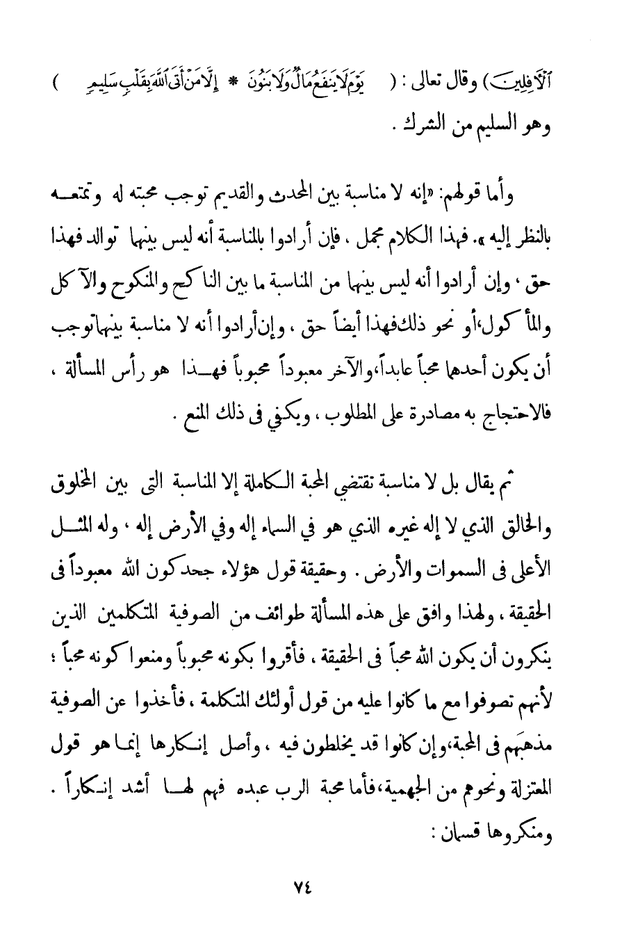 الْآفِلِينَ} وَقَالَ تَعَالَى: {يَوْمَ لَا يَنْفَعُ مَالٌ وَلَا بَنُونَ} {إلَّا مَنْ أَتَى اللَّهَ بِقَلْبٍ سَلِيمٍ} وَهُوَ السَّلِيمُ مِنْ الشِّرْكِ. وَأَمَّا قَوْلُهُمْ: " إنَّهُ لَا مُنَاسَبَةَ بَيْنَ الْمُحْدَثِ وَالْقَدِيمِ تُوجِبُ مَحَبَّتَهُ لَهُ وَتَمَتُّعَهُ بِالنَّظَرِ إلَيْهِ ". فَهَذَا الْكَلَامُ مُجْمَلٌ فَإِنْ أَرَادُوا بِالْمُنَاسَبَةِ أَنَّهُ لَيْسَ بَيْنَهُمَا تَوَالُدٌ فَهَذَا حَقٌّ وَإِنْ أَرَادُوا أَنَّهُ لَيْسَ بَيْنَهُمَا مِنْ الْمُنَاسَبَةِ مَا بَيْنَ النَّاكِحِ وَالْمَنْكُوحِ وَالْآكِلِ وَالْمَأْكُولِ أَوْ نَحْوِ ذَلِكَ فَهَذَا أَيْضًا حَقٌّ وَإِنْ أَرَادُوا أَنَّهُ لَا مُنَاسَبَةَ بَيْنَهُمَا تُوجِبُ أَنْ يَكُونَ أَحَدُهُمَا مُحِبًّا عَابِدًا وَالْآخَرُ مَعْبُودًا مَحْبُوبًا فَهَذَا هُوَ رَأْسُ الْمَسْأَلَةِ فَالِاحْتِجَاجُ بِهِ مُصَادَرَةٌ عَلَى الْمَطْلُوبِ وَيَكْفِي فِي ذَلِكَ الْمَنْعُ. ثُمَّ يُقَالُ بَلْ لَا مُنَاسَبَةَ تَقْتَضِي الْمَحَبَّةَ الْكَامِلَةَ إلَّا الْمُنَاسَبَةُ الَّتِي بَيْنَ الْمَخْلُوقِ وَالْخَالِقِ الَّذِي لَا إلَهَ غَيْرُهُ. الَّذِي هُوَ فِي السَّمَاءِ إلَهٌ وَفِي الْأَرْضِ إلَهٌ وَلَهُ الْمَثَلُ الْأَعْلَى فِي السَّمَوَاتِ وَالْأَرْضِ. وَحَقِيقَةُ قَوْلِ هَؤُلَاءِ جَحْدُ كَوْنِ اللَّهِ مَعْبُودًا فِي الْحَقِيقَةِ وَلِهَذَا وَافَقَ عَلَى هَذِهِ الْمَسْأَلَةِ طَوَائِفُ مِنْ الصُّوفِيَّةِ الْمُتَكَلِّمِينَ الَّذِينَ يُنْكِرُونَ أَنْ يَكُونَ اللَّهُ مُحِبًّا فِي الْحَقِيقَةِ فَأَقَرُّوا بِكَوْنِهِ مَحْبُوبًا وَمَنَعُوا كَوْنَهُ مُحِبًّا؛ لِأَنَّهُمْ تَصَوَّفُوا مَعَ مَا كَانُوا عَلَيْهِ مِنْ قَوْلِ أُولَئِكَ الْمُتَكَلِّمَةِ فَأَخَذُوا عَنْ الصُّوفِيَّةِ مَذْهَبَهُمْ فِي الْمَحَبَّةِ وَإِنْ كَانُوا قَدْ يَخْلِطُونَ فِيهِ وَأَصْلُ إنْكَارِهَا إنَّمَا هُوَ قَوْلُ الْمُعْتَزِلَةِ وَنَحْوِهِمْ مِنْ الْجَهْمِيَّة فَأَمَّا مَحَبَّةُ الرَّبِّ عَبْدَهُ فَهُمْ لَهَا أَشَدُّ إنْكَارًا. وَمُنْكِرُوهَا قِسْمَانِ: