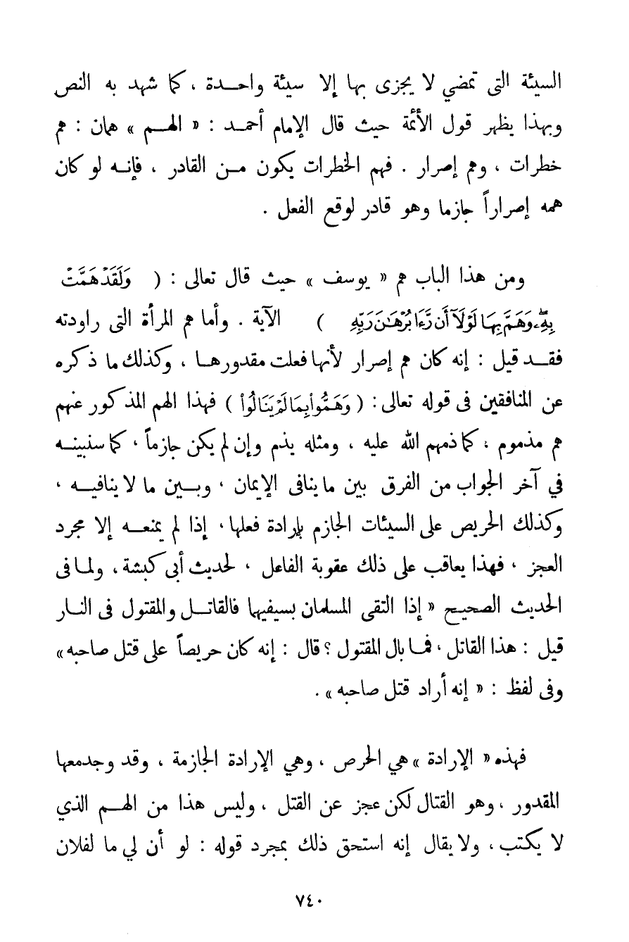 السَّيِّئَةِ الَّتِي تَمْضِي لَا يُجْزَى بِهَا إلَّا سَيِّئَةً وَاحِدَةً كَمَا شَهِدَ بِهِ النَّصُّ وَبِهَذَا يَظْهَرُ قَوْلُ الْأَئِمَّةِ حَيْثُ قَالَ الْإِمَامُ أَحْمَد: " الْهَمُّ " هَمَّانِ: هَمُّ خَطِرَاتٍ وَهَمُّ إصْرَارٍ. فَهَمُّ الْخَطِرَاتِ يَكُونُ مِنْ الْقَادِرِ فَإِنَّهُ لَوْ كَانَ هَمُّهُ إصْرَارًا جَازِمًا وَهُوَ قَادِرٌ لَوَقَعَ الْفِعْلُ. وَمِنْ هَذَا الْبَابِ هَمُّ " يُوسُفَ " حَيْثُ قَالَ تَعَالَى: {وَلَقَدْ هَمَّتْ بِهِ وَهَمَّ بِهَا لَوْلَا أَنْ رَأَى بُرْهَانَ رَبِّهِ} الْآيَةُ. وَأَمَّا هَمُّ الْمَرْأَةِ الَّتِي رَاوَدَتْهُ فَقَدْ قِيلَ: إنَّهُ كَانَ هَمَّ إصْرَارٍ لِأَنَّهَا فَعَلَتْ مَقْدُورَهَا وَكَذَلِكَ مَا ذَكَرَهُ عَنْ الْمُنَافِقِينَ فِي قَوْله تَعَالَى {وَهَمُّوا بِمَا لَمْ يَنَالُوا} فَهَذَا الْهَمُّ الْمَذْكُورُ عَنْهُمْ هَمٌّ مَذْمُومٌ كَمَا ذَمَّهُمْ اللَّهُ عَلَيْهِ وَمِثْلُهُ يَذُمُّ وَإِنْ لَمْ يَكُنْ جَازِمًا كَمَا سَنُبَيِّنُهُ فِي آخِرِ الْجَوَابِ مِنْ الْفَرْقِ بَيْنَ مَا يُنَافِي الْإِيمَانَ وَبَيْنَ مَا لَا يُنَافِيهِ وَكَذَلِكَ الْحَرِيصُ عَلَى السَّيِّئَاتِ الْجَازِمُ بِإِرَادَةِ فِعْلِهَا إذَا لَمْ يَمْنَعْهُ إلَّا مُجَرَّدُ الْعَجْزِ فَهَذَا يُعَاقَبُ عَلَى ذَلِكَ عُقُوبَةَ الْفَاعِلِ لِحَدِيثِ أَبِي كَبْشَةَ وَلِمَا فِي الْحَدِيثِ الصَّحِيحِ {إذَا الْتَقَى الْمُسْلِمَانِ بِسَيْفَيْهِمَا فَالْقَاتِلُ وَالْمَقْتُولُ فِي النَّارِ قِيلَ: هَذَا الْقَاتِلُ فَمَا بَالُ الْمَقْتُولِ؟ قَالَ: إنَّهُ كَانَ حَرِيصًا عَلَى قَتْلِ صَاحِبِهِ} وَفِي لَفْظٍ: {إنَّهُ أَرَادَ قَتْلَ صَاحِبِهِ} . فَهَذِهِ " الْإِرَادَةُ " هِيَ الْحِرْصُ وَهِيَ الْإِرَادَةُ الْجَازِمَةُ وَقَدْ وُجِدَ مَعَهَا الْمَقْدُورُ وَهُوَ الْقِتَالُ لَكِنْ عَجَزَ عَنْ الْقَتْلِ وَلَيْسَ هَذَا مِنْ الْهَمِّ الَّذِي لَا يُكْتَبُ وَلَا يُقَالُ إنَّهُ اسْتَحَقَّ ذَلِكَ بِمُجَرَّدِ قَوْلِهِ: لَوْ أَنَّ لِي مَا لِفُلَانِ