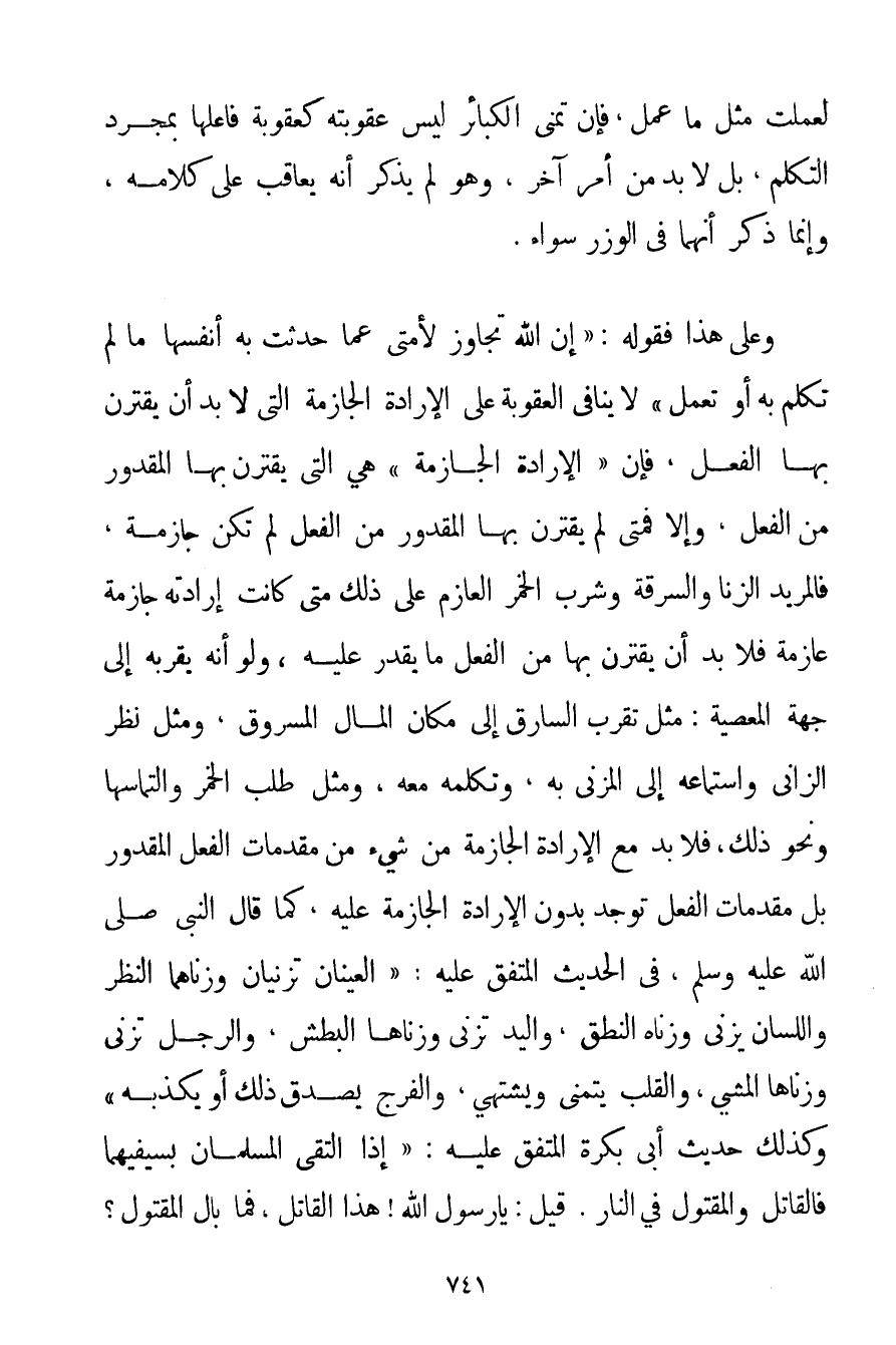 لَعَمِلْت مِثْلَ مَا عَمِلَ فَإِنَّ تَمَنِّي الْكَبَائِرِ لَيْسَ عُقُوبَتُهُ كَعُقُوبَةِ فَاعِلِهَا بِمُجَرَّدِ التَّكَلُّمِ بَلْ لَا بُدَّ مِنْ أَمْرٍ آخَرَ وَهُوَ لَمْ يَذْكُرْ أَنَّهُ يُعَاقَبُ عَلَى كَلَامِهِ وَإِنَّمَا ذَكَرَ أَنَّهُمَا فِي الْوِزْرِ سَوَاءٌ. وَعَلَى هَذَا فَقَوْلُهُ: {إنَّ اللَّهَ تَجَاوَزَ لِأُمَّتِي عَمَّا حَدَّثَتْ بِهِ أَنْفُسَهَا مَا لَمْ تَكَلَّمْ بِهِ أَوْ تَعْمَلْ} لَا يُنَافِي الْعُقُوبَةَ عَلَى الْإِرَادَةِ الْجَازِمَةِ الَّتِي لَا بُدَّ أَنْ يَقْتَرِنَ بِهَا الْفِعْلُ فَإِنَّ " الْإِرَادَةَ الْجَازِمَةَ " هِيَ الَّتِي يَقْتَرِنُ بِهَا الْمَقْدُورُ مِنْ الْفِعْلِ وَإِلَّا فَمَتَى لَمْ يَقْتَرِنْ بِهَا الْمَقْدُورُ مِنْ الْفِعْلِ لَمْ تَكُنْ جَازِمَةً فَالْمُرِيدُ الزِّنَا وَالسَّرِقَةِ وَشُرْبِ الْخَمْرِ الْعَازِمُ عَلَى ذَلِكَ مَتَى كَانَتْ إرَادَتُهُ جَازِمَةً عَازِمَةً فَلَا بُدَّ أَنْ يَقْتَرِنَ بِهَا مِنْ الْفِعْلِ مَا يَقْدِرُ عَلَيْهِ وَلَوْ أَنَّهُ يُقَرِّبُهُ إلَى جِهَةِ الْمَعْصِيَةِ: مِثْلَ تَقَرُّبِ السَّارِقِ إلَى مَكَانِ الْمَالِ الْمَسْرُوقِ وَمِثْلَ نَظَرِ الزَّانِي وَاسْتِمَاعِهِ إلَى الْمَزْنِيِّ بِهِ وَتَكَلُّمِهِ مَعَهُ وَمِثْلَ طَلَبِ الْخَمْرِ وَالْتِمَاسِهَا وَنَحْوِ ذَلِكَ فَلَا بُدَّ مَعَ الْإِرَادَةِ الْجَازِمَةِ مِنْ شَيْءٍ مِنْ مُقَدِّمَاتِ الْفِعْلِ الْمَقْدُورِ بَلْ مُقَدِّمَاتُ الْفِعْلِ تُوجَدُ بِدُونِ الْإِرَادَةِ الْجَازِمَةِ عَلَيْهِ كَمَا قَالَ النَّبِيُّ صَلَّى اللَّهُ عَلَيْهِ وَسَلَّمَ فِي الْحَدِيثِ الْمُتَّفَقِ عَلَيْهِ: {الْعَيْنَانِ تَزْنِيَانِ وَزِنَاهُمَا النَّظَرُ وَاللِّسَانُ يَزْنِي وَزِنَاهُ النُّطْقُ وَالْيَدُ تَزْنِي وَزِنَاهَا الْبَطْشُ وَالرِّجْلُ تَزْنِي وَزِنَاهَا الْمَشْيُ وَالْقَلْبُ يَتَمَنَّى وَيَشْتَهِي وَالْفَرْجُ يُصَدِّقُ ذَلِكَ أَوْ يُكَذِّبُهُ} وَكَذَلِكَ حَدِيثُ أَبِي بَكْرَةَ الْمُتَّفَقُ عَلَيْهِ: {إذَا الْتَقَى الْمُسْلِمَانِ بِسَيْفَيْهِمَا فَالْقَاتِلُ وَالْمَقْتُولُ فِي النَّارِ. قِيلَ: يَا رَسُولَ اللَّهِ هَذَا الْقَاتِلُ فَمَا بَالُ الْمَقْتُولِ؟