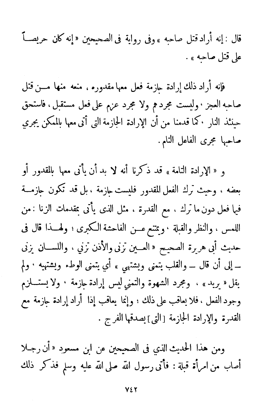 قَالَ: إنَّهُ أَرَادَ قَتْلَ صَاحِبِهِ} وَفِي رِوَايَةٍ فِي الصَّحِيحَيْنِ {إنَّهُ كَانَ حَرِيصًا عَلَى قَتْلِ صَاحِبِهِ} . فَإِنَّهُ أَرَادَ ذَلِكَ إرَادَةً جَازِمَةً فَعَلَ مَعَهَا مَقْدُورَهُ مَنَعَهُ مِنْهَا مِنْ قَتْلِ صَاحِبِهِ الْعَجْزُ وَلَيْسَتْ مُجَرَّدَ هَمٍّ وَلَا مُجَرَّدَ عَزْمٍ عَلَى فِعْلٍ مُسْتَقْبَلٍ فَاسْتَحَقَّ حِينَئِذٍ النَّارَ كَمَا قَدَّمْنَا مِنْ أَنَّ الْإِرَادَةَ الْجَازِمَةَ الَّتِي أَتَى مَعَهَا بِالْمُمْكِنِ يَجْرِي صَاحِبُهَا مَجْرَى الْفَاعِلِ التَّامِّ. و " الْإِرَادَةُ التَّامَّةُ " قَدْ ذَكَرْنَا أَنَّهُ لَا بُدَّ أَنْ يَأْتِيَ مَعَهَا بِالْمَقْدُورِ أَوْ بَعْضِهِ وَحَيْثُ تَرَكَ الْفِعْلَ الْمَقْدُورَ فَلَيْسَتْ جَازِمَةً بَلْ قَدْ تَكُونُ جَازِمَةً فِيمَا فَعَلَ دُونَ مَا تَرَكَ مَعَ الْقُدْرَةِ مِثْلَ الَّذِي يَأْتِي بِمُقَدِّمَاتِ الزِّنَا: مِنْ اللَّمْسِ وَالنَّظَرِ وَالْقُبْلَةِ وَيَمْتَنِعُ عَنْ الْفَاحِشَةِ الْكُبْرَى؛ وَلِهَذَا قَالَ فِي حَدِيثِ أَبِي هُرَيْرَةَ الصَّحِيحِ {الْعَيْنُ تَزْنِي وَالْأُذُنُ تَزْنِي وَاللِّسَانُ يَزْنِي - إلَى أَنْ قَالَ - وَالْقَلْبُ يَتَمَنَّى وَيَشْتَهِي} أَيْ يَتَمَنَّى الْوَطْءَ وَيَشْتَهِيهِ وَلَمْ يَقُلْ " يُرِيدُ " وَمُجَرَّدُ الشَّهْوَةِ وَالتَّمَنِّي لَيْسَ إرَادَةً جَازِمَةً وَلَا يَسْتَلْزِمُ وُجُودَ الْفِعْلِ فَلَا يُعَاقَبُ عَلَى ذَلِكَ؛ وَإِنَّمَا يُعَاقَبُ إذَا أَرَادَ إرَادَةً جَازِمَةً مَعَ الْقُدْرَةِ وَالْإِرَادَةِ الْجَازِمَةِ الَّتِي يُصَدِّقُهَا الْفَرْجُ. وَمِنْ هَذَا الْحَدِيثِ الَّذِي فِي الصَّحِيحَيْنِ عَنْ ابْنِ مَسْعُودٍ {أَنَّ رَجُلًا أَصَابَ مِنْ امْرَأَةٍ قُبْلَةً: فَأَتَى رَسُولَ اللَّهِ صَلَّى اللَّهُ عَلَيْهِ وَسَلَّمَ فَذَكَرَ ذَلِكَ