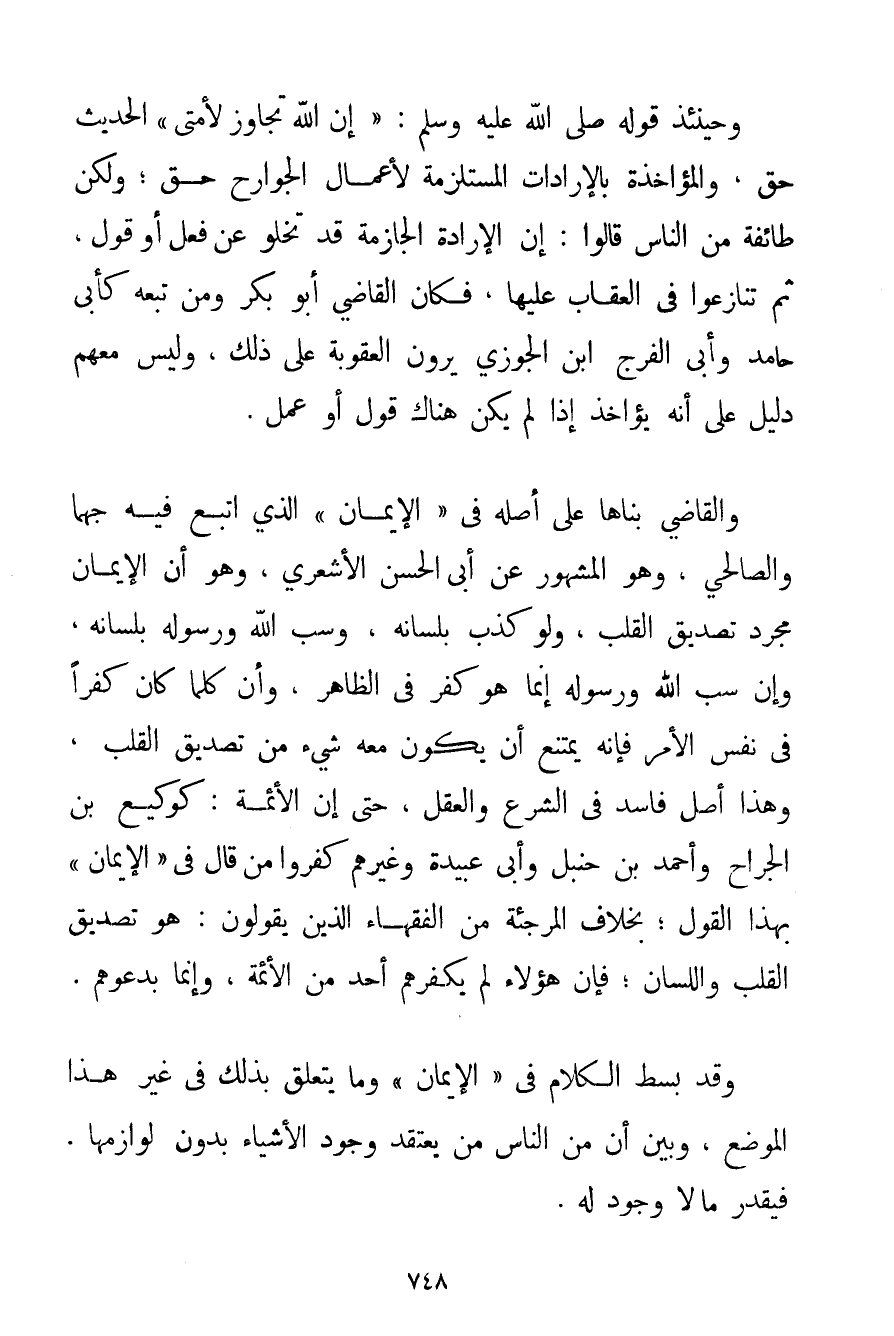 وَحِينَئِذٍ قَوْلُهُ صَلَّى اللَّهُ عَلَيْهِ وَسَلَّمَ {إنَّ اللَّهَ تَجَاوَزَ لِأُمَّتِي} الْحَدِيثُ حَقٌّ وَالْمُؤَاخَذَةُ بِالْإِرَادَاتِ الْمُسْتَلْزِمَةِ لِأَعْمَالِ الْجَوَارِحِ حَقٌّ؛ وَلَكِنَّ طَائِفَة مِنْ النَّاسِ قَالُوا: إنَّ الْإِرَادَةَ الْجَازِمَةَ قَدْ تَخْلُو عَنْ فِعْلٍ أَوْ قَوْلٍ ثُمَّ تَنَازَعُوا فِي الْعِقَابِ عَلَيْهَا فَكَانَ الْقَاضِي أَبُو بَكْرٍ وَمَنْ تَبِعَهُ كَأَبِي حَامِدٍ وَأَبِي الْفَرَجِ ابْنِ الْجَوْزِيِّ يَرَوْنَ الْعُقُوبَةَ عَلَى ذَلِكَ وَلَيْسَ مَعَهُمْ دَلِيلٌ عَلَى أَنَّهُ يُؤَاخَذُ إذَا لَمْ يَكُنْ هُنَاكَ قَوْلٌ أَوْ عَمَلٌ. وَالْقَاضِي بَنَاهَا عَلَى أَصْلِهِ فِي " الْإِيمَانِ " الَّذِي اتَّبَعَ فِيهِ جَهْمًا وَالصَّالِحِيَّ وَهُوَ الْمَشْهُورُ عَنْ أَبِي الْحَسَنِ الْأَشْعَرِيِّ وَهُوَ أَنَّ الْإِيمَانَ مُجَرَّدُ تَصْدِيقِ الْقَلْبِ وَلَوْ كَذَّبَ بِلِسَانِهِ وَسَبَّ اللَّهَ وَرَسُولَهُ بِلِسَانِهِ وَإِنَّ سَبَّ اللَّهِ وَرَسُولِهِ إنَّمَا هُوَ كُفْرٌ فِي الظَّاهِرِ وَأَنَّ كُلَّمَا كَانَ كُفْرًا فِي نَفْسِ الْأَمْرِ فَإِنَّهُ يَمْتَنِعُ أَنْ يَكُونَ مَعَهُ شَيْءٌ مِنْ تَصْدِيقِ الْقَلْبِ وَهَذَا أَصْلٌ فَاسِدٌ فِي الشَّرْعِ وَالْعَقْلِ حَتَّى إنَّ الْأَئِمَّةَ: كَوَكِيعِ بْنِ الْجَرَّاحِ وَأَحْمَدَ بْنِ حَنْبَلٍ وَأَبِي عُبَيْدٍ وَغَيْرِهِمْ كَفَّرُوا مَنْ قَالَ فِي " الْإِيمَانِ " بِهَذَا الْقَوْلِ؛ بِخِلَافِ الْمُرْجِئَةِ مِنْ الْفُقَهَاءِ الَّذِينَ يَقُولُونَ: هُوَ تَصْدِيقُ الْقَلْبِ وَاللِّسَانِ؛ فَإِنَّ هَؤُلَاءِ لَمْ يُكَفِّرْهُمْ أَحَدٌ مِنْ الْأَئِمَّةِ وَإِنَّمَا بَدَّعُوهُمْ.