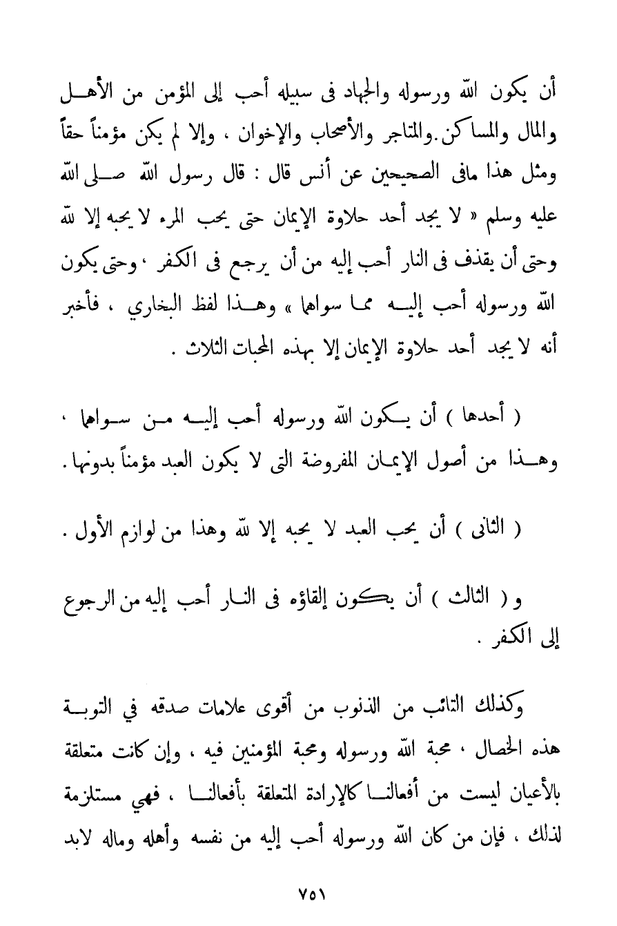 أَنْ يَكُونَ اللَّهُ وَرَسُولُهُ وَالْجِهَادُ فِي سَبِيلِهِ أَحَبَّ إلَى الْمُؤْمِنِ مِنْ الْأَهْلِ وَالْمَالِ وَالْمَسَاكِنِ وَالْمَتَاجِرِ وَالْأَصْحَابِ وَالْإِخْوَانِ وَإِلَّا لَمْ يَكُنْ مُؤْمِنًا حَقًّا وَمِثْلُ هَذَا مَا فِي الصَّحِيحَيْنِ عَنْ أَنَسٍ قَالَ: {قَالَ رَسُولُ اللَّهِ صَلَّى اللَّهُ عَلَيْهِ وَسَلَّمَ لَا يَجِدُ أَحَدٌ حَلَاوَةَ الْإِيمَانِ حَتَّى يُحِبَّ الْمَرْءَ لَا يُحِبُّهُ إلَّا لِلَّهِ وَحَتَّى أَنْ يُقْذَفَ فِي النَّارِ أَحَبّ إلَيْهِ مِنْ أَنْ يَرْجِعَ فِي الْكُفْرِ وَحَتَّى يَكُونَ اللَّهُ وَرَسُولُهُ أَحَبّ إلَيْهِ مِمَّا سِوَاهُمَا} وَهَذَا لَفْظُ الْبُخَارِيِّ فَأَخْبَرَ أَنَّهُ لَا يَجِدُ أَحَدٌ حَلَاوَةَ الْإِيمَانِ إلَّا بِهَذِهِ المحبات الثَّلَاثِ. (أَحَدُهَا أَنْ يَكُونَ اللَّهُ وَرَسُولُهُ أَحَبَّ إلَيْهِ مِنْ سِوَاهُمَا وَهَذَا مِنْ أُصُولِ الْإِيمَانِ الْمَفْرُوضَةِ الَّتِي لَا يَكُونُ الْعَبْدُ مُؤْمِنًا بِدُونِهَا. (الثَّانِي أَنْ يُحِبَّ الْعَبْدَ لَا يُحِبُّهُ إلَّا لِلَّهِ وَهَذَا مِنْ لَوَازِمِ الْأَوَّلِ. و (الثَّالِثُ أَنْ يَكُونَ إلْقَاؤُهُ فِي النَّارِ أَحَبَّ إلَيْهِ مِنْ الرُّجُوعِ إلَى الْكُفْرِ. وَكَذَلِكَ التَّائِبُ مِنْ الذُّنُوبِ مِنْ أَقْوَى عَلَامَاتِ صِدْقِهِ فِي التَّوْبَةِ هَذِهِ الْخِصَالُ مَحَبَّةُ اللَّهِ وَرَسُولِهِ وَمَحَبَّةُ الْمُؤْمِنِينَ فِيهِ وَإِنْ كَانَتْ مُتَعَلِّقَةً بِالْأَعْيَانِ لَيْسَتْ مِنْ أَفْعَالِنَا كَالْإِرَادَةِ الْمُتَعَلِّقَةِ بِأَفْعَالِنَا فَهِيَ مُسْتَلْزِمَةٌ لِذَلِكَ فَإِنَّ مَنْ كَانَ اللَّهُ وَرَسُولُهُ أَحَبَّ إلَيْهِ مِنْ نَفْسِهِ وَأَهْلِهِ وَمَالِهِ لَا بُدَّ