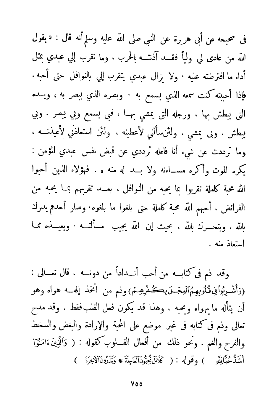 فِي صَحِيحِهِ عَنْ أَبِي هُرَيْرَةَ عَنْ {النَّبِيِّ صَلَّى اللَّهُ عَلَيْهِ وَسَلَّمَ أَنَّهُ قَالَ: يَقُولُ اللَّهُ مَنْ عَادَى لِي وَلِيًّا فَقَدْ آذَنْته بِالْحَرْبِ وَمَا تَقَرَّبَ إلَيَّ عَبْدِي بِمِثْلِ أَدَاءِ مَا افْتَرَضْته عَلَيْهِ وَلَا يَزَالُ عَبْدِي يَتَقَرَّبُ إلَيَّ بِالنَّوَافِلِ حَتَّى أُحِبَّهُ فَإِذَا أَحْبَبْته كُنْت سَمْعَهُ الَّذِي يَسْمَعُ بِهِ وَبَصَرَهُ الَّذِي يُبْصِرُ بِهِ وَيَدَهُ الَّتِي يَبْطِشُ بِهَا وَرِجْلَهُ الَّتِي يَمْشِي بِهَا فَبِي يَسْمَعُ وَبِي يُبْصِرُ وَبِي يَبْطِشُ وَبِي يَمْشِي وَلَئِنْ سَأَلَنِي لَأُعْطِيَنَّهُ وَلَئِنْ اسْتَعَاذَنِي لَأُعِيذَنَّهُ وَمَا تَرَدَّدْت عَنْ شَيْءٍ أَنَا فَاعِلُهُ تَرَدُّدِي عَنْ قَبْضِ نَفْسِ عَبْدِي الْمُؤْمِنِ: يَكْرَهُ الْمَوْتَ وَأَكْرَهُ مَسَاءَتَهُ وَلَا بُدَّ لَهُ مِنْهُ} . فَهَؤُلَاءِ الَّذِينَ أَحَبُّوا اللَّهَ مَحَبَّةً كَامِلَةً تَقَرَّبُوا بِمَا يُحِبُّهُ مِنْ النَّوَافِلِ بَعْدَ تَقَرُّبِهِمْ بِمَا يُحِبُّهُ مِنْ الْفَرَائِضِ أَحَبَّهُمْ اللَّهُ مَحَبَّةً كَامِلَةً حَتَّى بَلَغُوا مَا بَلَغُوهُ وَصَارَ أَحَدُهُمْ يُدْرِكُ بِاَللَّهِ وَيَتَحَرَّكُ بِاَللَّهِ بِحَيْثُ أَنَّ اللَّهَ يُجِيبُ مَسْأَلَتَهُ. وَيُعِيذُهُ مِمَّا اسْتَعَاذَ مِنْهُ. وَقَدْ ذَمَّ فِي كِتَابِهِ مَنْ أَحَبّ أَنْدَادًا مِنْ دُونِهِ قَالَ تَعَالَى: {وَأُشْرِبُوا فِي قُلُوبِهِمُ الْعِجْلَ بِكُفْرِهِمْ} وَذَمَّ مَنْ اتَّخَذَ إلَهَهُ هَوَاهُ وَهُوَ أَنْ يَتَأَلَّهَ مَا يَهْوَاهُ وَيُحِبُّهُ وَهَذَا قَدْ يَكُونُ فِعْلَ الْقَلْبِ فَقَطْ. وَقَدْ مَدَحَ تَعَالَى وَذَمَّ فِي كِتَابِهِ فِي غَيْرِ مَوْضِعٍ عَلَى الْمَحَبَّةِ وَالْإِرَادَةِ وَالْبُغْضِ وَالسُّخْطِ وَالْفَرَحِ وَالْغَمِّ وَنَحْوِ ذَلِكَ مِنْ أَفْعَالِ الْقُلُوبِ كَقَوْلِهِ: {وَالَّذِينَ آمَنُوا أَشَدُّ حُبًّا لِلَّهِ} وَقَوْلِهِ: {كَلَّا بَلْ تُحِبُّونَ الْعَاجِلَةَ} {وَتَذَرُونَ الْآخِرَةَ}