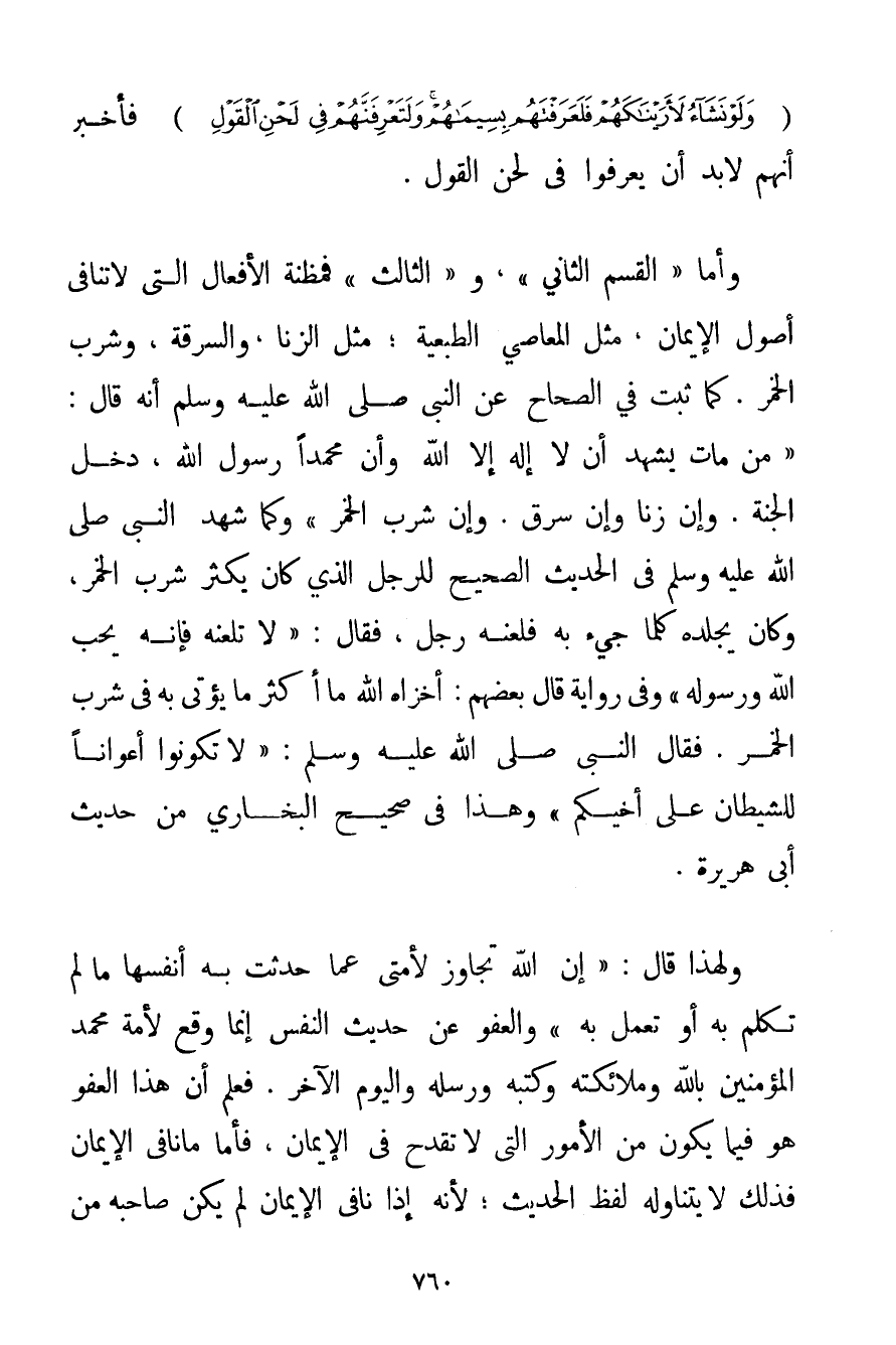 نَشَاءُ لَأَرَيْنَاكَهُمْ فَلَعَرَفْتَهُمْ بِسِيمَاهُمْ وَلَتَعْرِفَنَّهُمْ فِي لَحْنِ الْقَوْلِ} فَأَخْبَرَ أَنَّهُمْ لَا بُدَّ أَنْ يُعْرَفُوا فِي لَحْنِ الْقَوْلِ. وَأَمَّا " الْقِسْمُ الثَّانِي " و " الثَّالِثُ " فَمَظِنَّةُ الْأَفْعَالِ الَّتِي لَا تُنَافِي أُصُولَ الْإِيمَانِ مِثْلَ الْمَعَاصِي الطَّبْعِيَّةِ؛ مِثْلَ الزِّنَا وَالسَّرِقَةِ وَشُرْبِ الْخَمْرِ. كَمَا ثَبَتَ فِي الصِّحَاحِ عَنْ النَّبِيِّ صَلَّى اللَّهُ عَلَيْهِ وَسَلَّمَ أَنَّهُ قَالَ: {مَنْ مَاتَ يَشْهَدُ أَنْ لَا إلَهَ إلَّا اللَّهُ وَأَنَّ مُحَمَّدًا رَسُولُ اللَّهِ دَخَلَ الْجَنَّةَ. وَإِنْ زَنَى وَإِنْ سَرَقَ. وَإِنْ شَرِبَ الْخَمْرَ} وَكَمَا شَهِدَ النَّبِيُّ صَلَّى اللَّهُ عَلَيْهِ وَسَلَّمَ فِي الْحَدِيثِ الصَّحِيحِ لِلرَّجُلِ الَّذِي كَانَ يُكْثِرُ شُرْبَ الْخَمْرِ وَكَانَ يَجْلِدُهُ كُلَّمَا جِيءَ بِهِ فَلَعَنَهُ رَجُلٌ فَقَالَ: {لَا تَلْعَنْهُ فَإِنَّهُ يُحِبُّ اللَّهَ وَرَسُولَهُ} وَفِي رِوَايَةٍ {قَالَ بَعْضُهُمْ: أَخْزَاهُ اللَّهُ مَا أَكْثَرَ مَا يُؤْتَى بِهِ فِي شُرْبِ الْخَمْرِ. فَقَالَ النَّبِيُّ صَلَّى اللَّهُ عَلَيْهِ وَسَلَّمَ لَا تَكُونُوا أَعْوَانًا لِلشَّيْطَانِ عَلَى أَخِيكُمْ} وَهَذَا فِي صَحِيحِ الْبُخَارِيِّ مِنْ حَدِيثِ أَبِي هُرَيْرَةَ. وَلِهَذَا قَالَ: {إنَّ اللَّهَ تَجَاوَزَ لِأُمَّتِي عَمَّا حَدَّثَتْ بِهِ أَنْفُسَهَا مَا لَمْ تَكَلَّمْ بِهِ أَوْ تَعْمَلْ بِهِ} وَالْعَفْوُ عَنْ حَدِيثِ النَّفْسِ إنَّمَا وَقَعَ لِأُمَّةِ مُحَمَّدٍ الْمُؤْمِنِينَ بِاَللَّهِ وَمَلَائِكَتِهِ وَكُتُبِهِ وَرُسُلِهِ وَالْيَوْمِ الْآخِرِ. فَعُلِمَ أَنَّ هَذَا الْعَفْوَ هُوَ فِيمَا يَكُونُ مِنْ الْأُمُورِ الَّتِي لَا تَقْدَحُ فِي الْإِيمَانِ فَأَمَّا مَا نَافَى الْإِيمَانَ فَذَلِكَ لَا يَتَنَاوَلُهُ لَفْظُ الْحَدِيثِ؛ لِأَنَّهُ إذَا نَافَى الْإِيمَانَ لَمْ يَكُنْ صَاحِبُهُ مِنْ