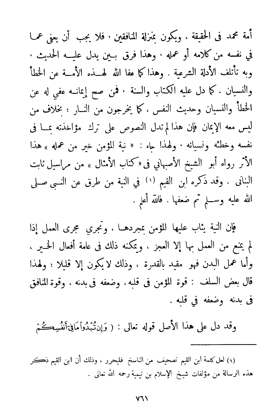 أُمَّةِ مُحَمَّدٍ فِي الْحَقِيقَةِ وَيَكُونُ بِمَنْزِلَةِ الْمُنَافِقِينَ فَلَا يَجِبُ أَنْ يُعْفَى عَمَّا فِي نَفْسِهِ مِنْ كَلَامِهِ أَوْ عَمَلِهِ وَهَذَا فَرْقٌ بَيِّنٌ يَدُلُّ عَلَيْهِ الْحَدِيثُ وَبِهِ تَأْتَلِفُ الْأَدِلَّةُ الشَّرْعِيَّةُ. وَهَذَا كَمَا عَفَا اللَّهُ لِهَذِهِ الْأُمَّةِ عَنْ الْخَطَأِ وَالنِّسْيَانِ. كَمَا دَلَّ عَلَيْهِ الْكِتَابُ وَالسَّنَةُ فَمَنْ صَحَّ إيمَانُهُ عُفِيَ لَهُ عَنْ الْخَطَأِ وَالنِّسْيَانِ وَحَدِيثِ النَّفْسِ كَمَا يُخْرَجُونَ مِنْ النَّارِ؛ بِخِلَافِ مَنْ لَيْسَ مَعَهُ الْإِيمَانُ فَإِنَّ هَذَا لَمْ تَدُلّ النُّصُوصُ عَلَى تَرْكِ مُؤَاخَذَتِهِ بِمَا فِي نَفْسِهِ وَخَطَئِهِ وَنِسْيَانِهِ [وَلِهَذَا جَاءَ: {نِيَّةُ الْمُؤْمِنِ خَيْرٌ مِنْ عَمَلِهِ} هَذَا الْأَثَرُ رَوَاهُ أَبُو الشَّيْخِ الأصبهاني فِي " كِتَابِ الْأَمْثَالِ " مِنْ مَرَاسِيلِ ثَابِتٍ البناني. وَقَدْ ذَكَرَهُ ابْنُ الْقَيِّمِ فِي النِّيَّةِ مَنْ طُرُقٍ عَنْ النَّبِيِّ صَلَّى اللَّهُ عَلَيْهِ وَسَلَّمَ ثُمَّ ضَعَّفَهَا. فَاَللَّهُ أَعْلَم. فَإِنَّ النِّيَّةَ يُثَابُ عَلَيْهَا الْمُؤْمِنُ بِمُجَرَّدِهَا] (*) وَتَجْرِي مَجْرَى الْعَمَلِ إذَا لَمْ يَمْنَعْ مِنْ الْعَمَلِ بِهَا إلَّا الْعَجْزُ وَيُمْكِنُهُ ذَلِكَ فِي عَامَّةِ أَفْعَالِ الْخَيْرِ وَأَمَّا عَمَلُ الْبَدَنِ فَهُوَ مُقَيَّدٌ بِالْقُدْرَةِ وَذَلِكَ لَا يَكُونُ إلَّا قَلِيلًا؛ وَلِهَذَا قَالَ بَعْضُ السَّلَفِ: قُوَّةُ الْمُؤْمِنِ فِي قَلْبِهِ وَضَعْفُهُ فِي بَدَنِهِ وَقُوَّةُ الْمُنَافِقِ فِي بَدَنِهِ وَضَعْفُهُ فِي قَلْبِهِ. وَقَدْ دَلَّ عَلَى هَذَا الْأَصْلِ قَوْله تَعَالَى {وَإِنْ تُبْدُوا مَا فِي أَنْفُسِكُمْ
