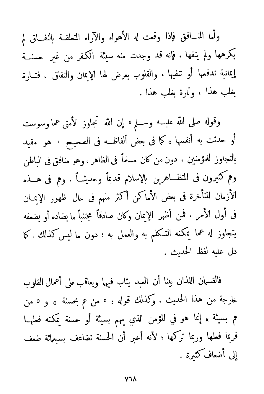 وَأَمَّا الْمُنَافِقُ فَإِذَا وَقَعَتْ لَهُ الْأَهْوَاءُ وَالْآرَاءُ الْمُتَعَلِّقَةُ بِالنِّفَاقِ لَمْ يكرهها وَلَمْ يَنْفِهَا فَإِنَّهُ قَدْ وُجِدَتْ مِنْهُ سَيِّئَةُ الْكُفْرِ مِنْ غَيْرِ حَسَنَةٍ إيمَانِيَّةٍ تَدْفَعُهَا أَوْ تَنْفِيهَا وَالْقُلُوبُ يَعْرِضُ لَهَا الْإِيمَانُ وَالنِّفَاقُ فَتَارَةً يَغْلِبُ هَذَا وَتَارَةً يَغْلِبُ هَذَا. وَقَوْلُهُ صَلَّى اللَّهُ عَلَيْهِ وَسَلَّمَ {إنَّ اللَّهَ تَجَاوَزَ لِأُمَّتِي عَمَّا وَسْوَسَتْ أَوْ حَدَّثَتْ بِهِ أَنْفُسَهَا} كَمَا فِي بَعْضِ أَلْفَاظِهِ فِي الصَّحِيحِ هُوَ مُقَيَّدٌ بِالتَّجَاوُزِ لِلْمُؤْمِنِينَ دُونَ مَنْ كَانَ مُسْلِمًا فِي الظَّاهِرِ وَهُوَ مُنَافِقٌ فِي الْبَاطِنِ وَهُمْ كَثِيرُونَ فِي الْمُتَظَاهِرِينَ بِالْإِسْلَامِ قَدِيمًا وَحَدِيثًا. وَهُمْ فِي هَذِهِ الْأَزْمَانِ الْمُتَأَخِّرَةِ فِي بَعْضِ الْأَمَاكِنِ أَكْثَرُ مِنْهُمْ فِي حَالِ ظُهُورِ الْإِيمَانِ فِي أَوَّلِ الْأَمْرِ فَمَنْ أَظْهَرَ الْإِيمَانَ وَكَانَ صَادِقًا مُجْتَنِبًا مَا يُضَادُّهُ أَوْ يُضْعِفُهُ يَتَجَاوَزُ لَهُ عَمَّا يُمْكِنُهُ التَّكَلُّمُ بِهِ وَالْعَمَلُ بِهِ: دُونَ مَا لَيْسَ كَذَلِكَ. كَمَا دَلَّ عَلَيْهِ لَفْظُ الْحَدِيثِ. فَالْقِسْمَانِ اللَّذَانِ بَيَّنَّا أَنَّ الْعَبْدَ يُثَابُ فِيهِمَا وَيُعَاقَبُ عَلَى أَعْمَالِ الْقُلُوبِ خَارِجَةٌ مِنْ هَذَا الْحَدِيثِ وَكَذَلِكَ قَوْلُهُ: " مَنْ هَمَّ بِحَسَنَةٍ " و " مَنْ هَمَّ بِسَيِّئَةٍ " إنَّمَا هُوَ فِي الْمُؤْمِنِ الَّذِي يَهُمُّ بِسَيِّئَةٍ أَوْ حَسَنَةٍ يُمْكِنُهُ فِعْلُهَا فَرُبَّمَا فَعَلَهَا وَرُبَّمَا تَرَكَهَا؛ لِأَنَّهُ أَخْبَرَ أَنَّ الْحَسَنَةَ تُضَاعَفُ بسبعمائة ضِعْفٍ إلَى أَضْعَافٍ كَثِيرَةٍ.