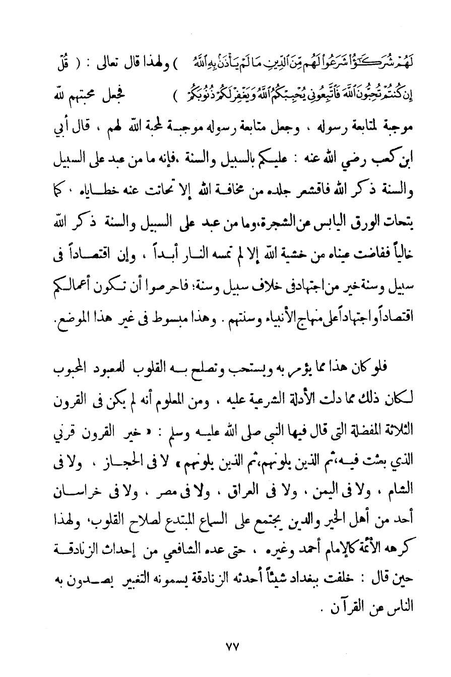 لَهُمْ شُرَكَاءُ شَرَعُوا لَهُمْ مِنَ الدِّينِ مَا لَمْ يَأْذَنْ بِهِ اللَّهُ} وَلِهَذَا قَالَ تَعَالَى: {قُلْ إنْ كُنْتُمْ تُحِبُّونَ اللَّهَ فَاتَّبِعُونِي يُحْبِبْكُمُ اللَّهُ وَيَغْفِرْ لَكُمْ ذُنُوبَكُمْ} فَجَعَلَ مَحَبَّتَهُمْ لِلَّهِ مُوجِبَةً لِمُتَابَعَةِ رَسُولِهِ وَجَعَلَ مُتَابَعَةَ رَسُولِهِ مُوجِبَةً لِمَحَبَّةِ اللَّهِ لَهُمْ قَالَ أبي بْنُ كَعْبٍ رَضِيَ اللَّهُ عَنْهُ عَلَيْكُمْ بِالسَّبِيلِ وَالسُّنَّةِ فَإِنَّهُ مَا مِنْ عَبْدٍ عَلَى السَّبِيلِ وَالسُّنَّةِ ذَكَرَ اللَّهَ فَاقْشَعَرَّ جِلْدُهُ مِنْ مَخَافَةِ اللَّهِ إلَّا تَحَاتَّتْ عَنْهُ خَطَايَاهُ كَمَا يتحات الْوَرَقُ الْيَابِسُ عَنْ الشَّجَرَةِ وَمَا مِنْ عَبْدٍ عَلَى السَّبِيلِ وَالسُّنَّةِ ذَكَرَ اللَّهَ خَالِيًا فَفَاضَتْ عَيْنَاهُ مِنْ خَشْيَةِ اللَّهِ إلَّا لَمْ تَمَسَّهُ النَّارُ أَبَدًا وَإِنَّ اقْتِصَادًا فِي سَبِيلٍ وَسُنَّةٍ خَيْرٌ مِنْ اجْتِهَادٍ فِي خِلَافِ سَبِيلٍ وَسُنَّةٍ؛ فَاحْرِصُوا أَنْ تَكُونَ أَعْمَالُكُمْ اقْتِصَادًا وَاجْتِهَادًا عَلَى مِنْهَاجِ الْأَنْبِيَاءِ وَسُنَّتِهِمْ. وَهَذَا مَبْسُوطٌ فِي غَيْرِ هَذَا الْمَوْضِعِ. فَلَوْ كَانَ هَذَا مِمَّا يُؤْمَرُ بِهِ وَيُسْتَحَبُّ وَتَصْلُحُ بِهِ الْقُلُوبُ لِلْمَعْبُودِ الْمَحْبُوبِ لَكَانَ ذَلِكَ مِمَّا دَلَّتْ الْأَدِلَّةُ الشَّرْعِيَّةُ عَلَيْهِ وَمِنْ الْمَعْلُومِ أَنَّهُ لَمْ يَكُنْ فِي الْقُرُونِ الثَّلَاثَةِ الْمُفَضَّلَةِ الَّتِي قَالَ فِيهَا النَّبِيُّ صَلَّى اللَّهُ عَلَيْهِ وَسَلَّمَ {خَيْرُ الْقُرُونِ قَرْنِي الَّذِي بُعِثْت فِيهِ ثُمَّ الَّذِينَ يَلُونَهُمْ ثُمَّ الَّذِينَ يَلُونَهُمْ} لَا فِي الْحِجَازِ وَلَا فِي الشَّامِ وَلَا فِي الْيَمَنِ وَلَا فِي الْعِرَاقِ وَلَا فِي مِصْرَ وَلَا فِي خُرَاسَانَ أَحَدٌ مِنْ أَهْلِ الْخَيْرِ وَالدِّينِ يَجْتَمِعُ عَلَى السَّمَاعِ الْمُبْتَدَعِ لِصَلَاحِ الْقُلُوبِ وَلِهَذَا كَرِهَهُ الْأَئِمَّةُ كَالْإِمَامِ أَحْمَد وَغَيْرِهِ حَتَّى عَدَّهُ الشَّافِعِيُّ مِنْ إحْدَاثِ الزَّنَادِقَةِ حِينَ قَالَ: خَلَّفْت بِبَغْدَادَ شَيْئًا أَحْدَثَهُ الزَّنَادِقَةُ يُسَمُّونَهُ التَّغْبِيرَ يَصُدُّونَ بِهِ النَّاسَ عَنْ الْقُرْآنِ.