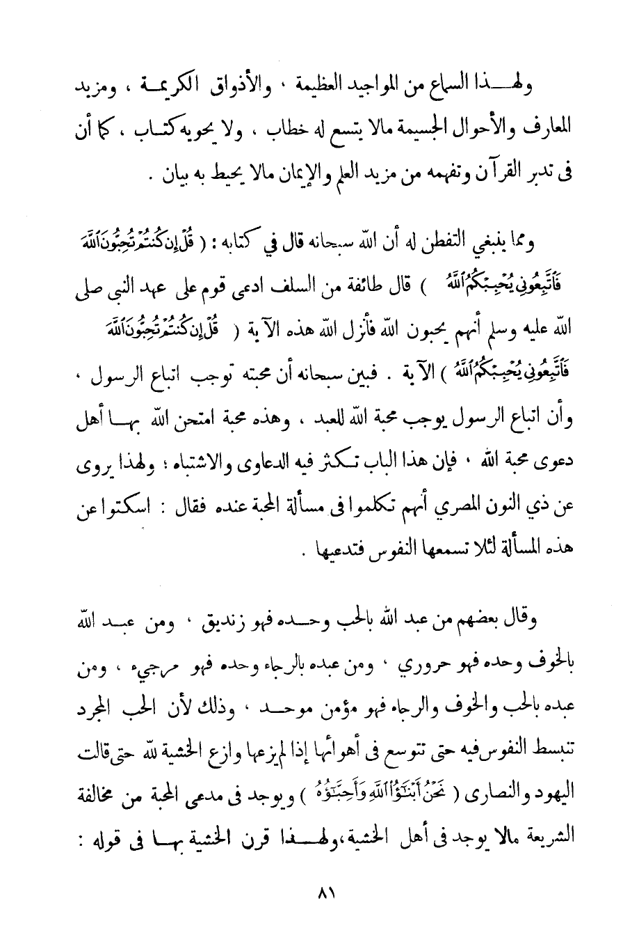 وَمِمَّا يَنْبَغِي التَّفَطُّنُ لَهُ أَنَّ اللَّهَ سُبْحَانَهُ قَالَ فِي كِتَابِهِ: {قُلْ إنْ كُنْتُمْ تُحِبُّونَ اللَّهَ فَاتَّبِعُونِي يُحْبِبْكُمُ اللَّهُ} قَالَ طَائِفَةٌ مِنْ السَّلَفِ ادَّعَى قَوْمٌ عَلَى عَهْدِ النَّبِيِّ صَلَّى اللَّهُ عَلَيْهِ وَسَلَّمَ أَنَّهُمْ يُحِبُّونَ اللَّهَ فَأَنْزَلَ اللَّهُ هَذِهِ الْآيَةَ {قُلْ إنْ كُنْتُمْ تُحِبُّونَ اللَّهَ فَاتَّبِعُونِي يُحْبِبْكُمُ اللَّهُ} الْآيَةَ. فَبَيَّنَ سُبْحَانَهُ أَنَّ مَحَبَّتَهُ تُوجِبُ اتِّبَاعَ الرَّسُولِ وَأَنَّ اتِّبَاعَ الرَّسُولِ يُوجِبُ مَحَبَّةَ اللَّهِ لِلْعَبْدِ وَهَذِهِ مَحَبَّةٌ امْتَحَنَ اللَّهُ بِهَا أَهْلَ دَعْوَى مَحَبَّةِ اللَّهِ فَإِنَّ هَذَا الْبَابَ تَكْثُرُ فِيهِ الدَّعَاوَى وَالِاشْتِبَاهُ؛ وَلِهَذَا يُرْوَى عَنْ ذِي النُّونِ الْمِصْرِيِّ أَنَّهُمْ تَكَلَّمُوا فِي مَسْأَلَةِ الْمَحَبَّةِ عِنْدَهُ فَقَالَ: اُسْكُتُوا عَنْ هَذِهِ الْمَسْأَلَةِ لِئَلَّا تَسْمَعَهَا النُّفُوسُ فَتَدَّعِيَهَا.
