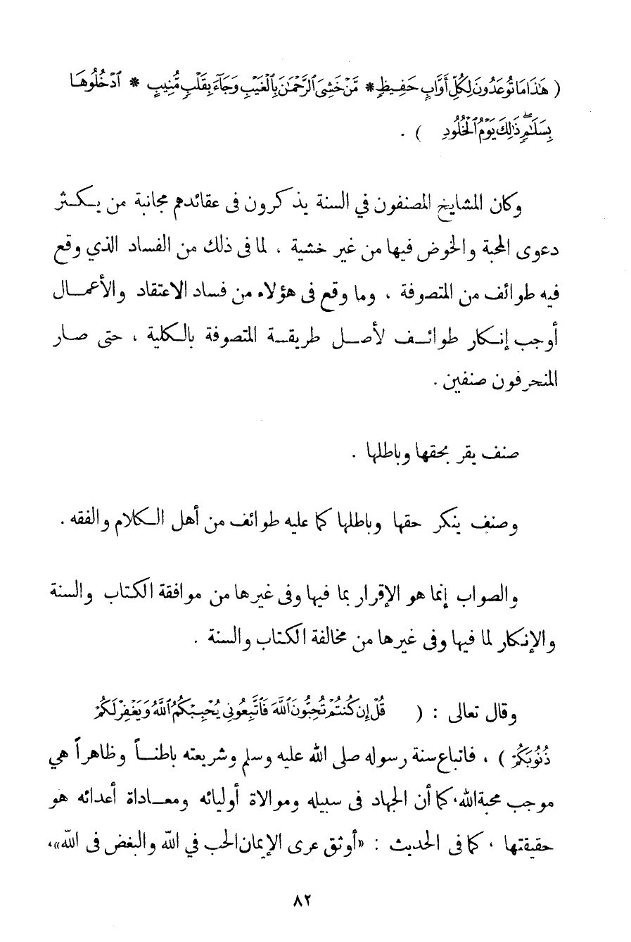 {هَذَا مَا تُوعَدُونَ لِكُلِّ أَوَّابٍ حَفِيظٍ} {مَنْ خَشِيَ الرَّحْمَنَ بِالْغَيْبِ وَجَاءَ بِقَلْبٍ مُنِيبٍ} {ادْخُلُوهَا بِسَلَامٍ ذَلِكَ يَوْمُ الْخُلُودِ} . وَكَانَ الْمَشَايِخُ الْمُصَنِّفُونَ فِي السُّنَّةِ يَذْكُرُونَ فِي عَقَائِدِهِمْ مُجَانَبَةَ مَنْ يُكْثِرُ دَعْوَى الْمَحَبَّةِ وَالْخَوْضِ فِيهَا مِنْ غَيْرِ خَشْيَةٍ لِمَا فِي ذَلِكَ مِنْ الْفَسَادِ الَّذِي وَقَعَ فِيهِ طَوَائِفُ مِنْ الْمُتَصَوِّفَةِ وَمَا وَقَعَ فِي هَؤُلَاءِ مِنْ فَسَادِ الِاعْتِقَادِ وَالْأَعْمَالِ أَوْجَبَ إنْكَارَ طَوَائِفَ لِأَصْلِ طَرِيقَةِ الْمُتَصَوِّفَةِ بِالْكُلِّيَّةِ حَتَّى صَارَ الْمُنْحَرِفُونَ صِنْفَيْنِ. صِنْفٌ يُقِرُّ بِحَقِّهَا وَبَاطِلِهَا وَصِنْفٌ يُنْكِرُ حَقَّهَا وَبَاطِلَهَا كَمَا عَلَيْهِ طَوَائِفُ مِنْ أَهْلِ الْكَلَامِ وَالْفِقْهِ. وَالصَّوَابُ إنَّمَا هُوَ الْإِقْرَارُ بِمَا فِيهَا وَفِي غَيْرِهَا مِنْ مُوَافَقَةِ الْكِتَابِ وَالسُّنَّةِ وَالْإِنْكَارِ لِمَا فِيهَا وَفِي غَيْرِهَا مِنْ مُخَالَفَةِ الْكِتَابِ وَالسُّنَّةِ. وَقَالَ تَعَالَى: {قُلْ إنْ كُنْتُمْ تُحِبُّونَ اللَّهَ فَاتَّبِعُونِي يُحْبِبْكُمُ اللَّهُ وَيَغْفِرْ لَكُمْ ذُنُوبَكُمْ} فَاتِّبَاعُ سُنَّةِ رَسُولِهِ صَلَّى اللَّهُ عَلَيْهِ وَسَلَّمَ وَشَرِيعَتِهِ بَاطِنًا وَظَاهِرًا هِيَ مُوجِبُ مَحَبَّةِ اللَّهِ كَمَا أَنَّ الْجِهَادَ فِي سَبِيلِهِ وَمُوَالَاةَ أَوْلِيَائِهِ وَمُعَادَاةَ أَعْدَائِهِ هُوَ حَقِيقَتُهَا كَمَا فِي الْحَدِيثِ: {أَوْثَقُ عُرَى الْإِيمَانِ الْحُبُّ فِي اللَّهِ وَالْبُغْضُ فِي اللَّهِ}