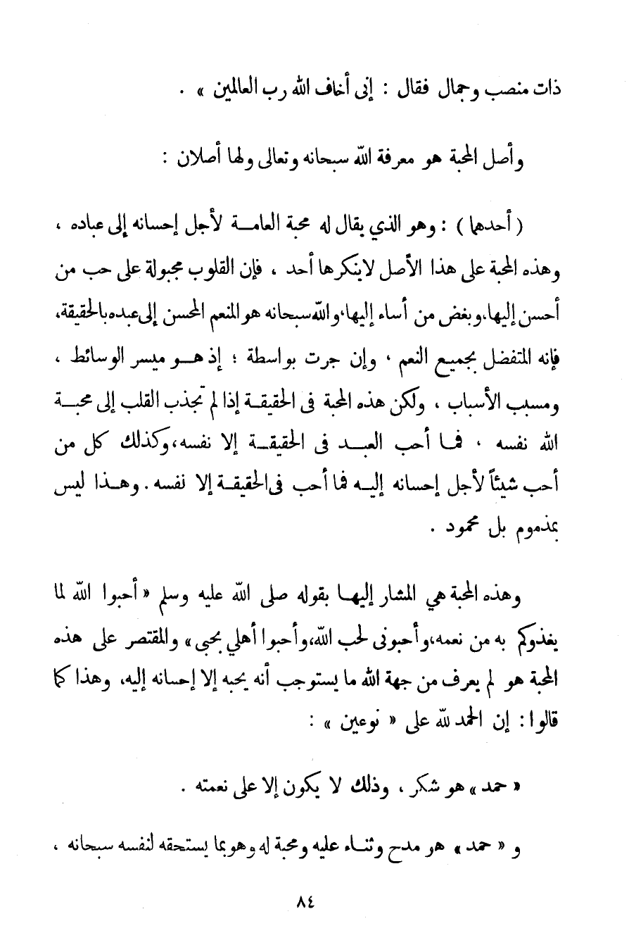 أَحَدُهُمَا: وَهُوَ الَّذِي يُقَالُ لَهُ مَحَبَّةُ الْعَامَّةِ لِأَجْلِ إحْسَانِهِ إلَى عِبَادِهِ وَهَذِهِ الْمَحَبَّةُ عَلَى هَذَا الْأَصْلِ لَا يُنْكِرُهَا أَحَدٌ فَإِنَّ الْقُلُوبَ مَجْبُولَةٌ عَلَى حُبِّ مَنْ أَحْسَنَ إلَيْهَا وَبُغْضِ مَنْ أَسَاءَ إلَيْهَا وَاَللَّهُ سُبْحَانَهُ هُوَ الْمُنْعِمُ الْمُحْسِنُ إلَى عَبْدِهِ بِالْحَقِيقَةِ فَإِنَّهُ الْمُتَفَضِّلُ بِجَمِيعِ النِّعَمِ وَإِنْ جَرَتْ بِوَاسِطَةِ؛ إذْ هُوَ مُيَسِّرُ الْوَسَائِطِ وَمُسَبِّبُ الْأَسْبَابِ وَلَكِنَّ هَذِهِ الْمَحَبَّةَ فِي الْحَقِيقَةِ إذَا لَمْ تَجْذِبْ الْقَلْبَ إلَى مَحَبَّةِ اللَّهِ نَفْسِهِ فَمَا أَحَبَّ الْعَبْدُ فِي الْحَقِيقَةِ إلَّا نَفْسَهُ وَكَذَلِكَ كُلُّ مَنْ أَحَبَّ شَيْئًا لِأَجْلِ إحْسَانِهِ إلَيْهِ فَمَا أَحَبَّ فِي الْحَقِيقَةِ إلَّا نَفْسَهُ. وَهَذَا لَيْسَ بِمَذْمُومِ بَلْ مَحْمُودٌ. وَهَذِهِ الْمَحَبَّةُ هِيَ الْمُشَارُ إلَيْهَا بِقَوْلِهِ صَلَّى اللَّهُ عَلَيْهِ وَسَلَّمَ {أَحِبُّوا اللَّهَ لِمَا يَغْذُوكُمْ بِهِ مِنْ نِعَمِهِ وَأَحِبُّونِي لِحُبِّ اللَّهِ وَأَحِبُّوا أَهْلِي بِحُبِّي} وَالْمُقْتَصِرُ عَلَى هَذِهِ الْمَحَبَّةِ هُوَ لَمْ يَعْرِفْ مِنْ جِهَةِ اللَّهِ مَا يَسْتَوْجِبُ أَنَّهُ يُحِبُّهُ إلَّا إحْسَانَهُ إلَيْهِ وَهَذَا كَمَا قَالُوا: إنَّ الْحَمْدَ لِلَّهِ عَلَى " نَوْعَيْنِ ": " حَمْدٌ " هُوَ شُكْرٌ وَذَلِكَ لَا يَكُونُ إلَّا عَلَى نِعْمَتِهِ. وَ " حَمْدٌ " هُوَ مَدْحٌ وَثَنَاءٌ عَلَيْهِ وَمَحَبَّةٌ لَهُ وَهُوَ بِمَا يَسْتَحِقُّهُ لِنَفْسِهِ سُبْحَانَهُ