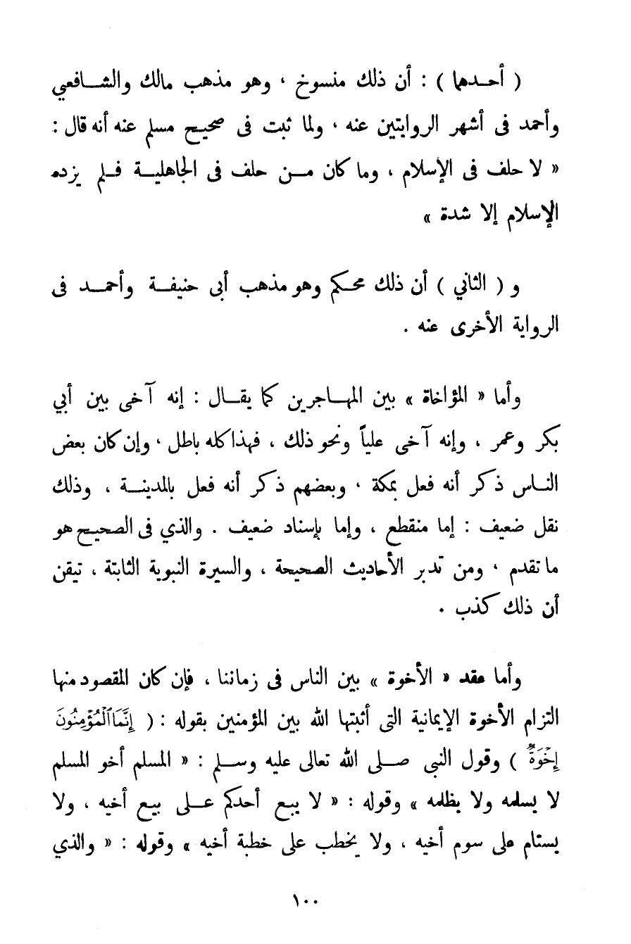 أَحَدُهُمَا: أَنَّ ذَلِكَ مَنْسُوخٌ وَهُوَ مَذْهَبُ مَالِكٍ وَالشَّافِعِيِّ وَأَحْمَد فِي أَشْهَرِ الرِّوَايَتَيْنِ عَنْهُ وَلَمَّا ثَبَتَ فِي صَحِيحِ مُسْلِمٍ عَنْهُ أَنَّهُ قَالَ: {لَا حِلْفَ فِي الْإِسْلَامِ وَمَا كَانَ مِنْ حِلْفٍ فِي الْجَاهِلِيَّةِ فَلَمْ يَزِدْهُ الْإِسْلَامُ إلَّا شِدَّةً} وَ (الثَّانِي أَنَّ ذَلِكَ مُحْكَمٌ وَهُوَ مَذْهَبُ أَبِي حَنِيفَةَ وَأَحْمَد فِي الرِّوَايَةِ الْأُخْرَى عَنْهُ. وَأَمَّا " الْمُؤَاخَاةُ " بَيْنَ الْمُهَاجِرِينَ كَمَا يُقَالُ: إنَّهُ آخَى بَيْنَ أَبِي بَكْرٍ وَعُمَرَ وَإِنَّهُ آخَى عَلِيًّا وَنَحْوَ ذَلِكَ فَهَذَا كُلُّهُ بَاطِلٌ وَإِنْ كَانَ بَعْضُ النَّاسِ ذَكَرَ أَنَّهُ فَعَلَ بِمَكَّةَ وَبَعْضُهُمْ ذَكَرَ أَنَّهُ فَعَلَ بِالْمَدِينَةِ وَذَلِكَ نَقْلٌ ضَعِيفٌ: إمَّا مُنْقَطِعٌ وَإِمَّا بِإِسْنَادِ ضَعِيفٍ. وَاَلَّذِي فِي الصَّحِيحِ هُوَ مَا تَقَدَّمَ وَمَنْ تَدَبَّرَ الْأَحَادِيثَ الصَّحِيحَةَ وَالسِّيرَةَ النَّبَوِيَّةَ الثَّابِتَةَ تَيَقَّنَ أَنَّ ذَلِكَ كَذِبٌ. وَأَمَّا عَقْدُ " الْأُخُوَّةِ " بَيْنَ النَّاسِ فِي زِمَامِنَا فَإِنْ كَانَ الْمَقْصُودُ مِنْهَا الْتِزَامَ الْأُخُوَّةِ الْإِيمَانِيَّةِ الَّتِي أَثْبَتَهَا اللَّهُ بَيْنَ الْمُؤْمِنِينَ بِقَوْلِهِ: {إنَّمَا الْمُؤْمِنُونَ إخْوَةٌ} وَقَوْلُ صَلَّى اللَّهُ تَعَالَى عَلَيْهِ وَسَلَّمَ {الْمُسْلِمُ أَخُو الْمُسْلِمِ لَا يُسْلِمْهُ وَلَا يَظْلِمْهُ} وَقَوْلُهُ: {لَا يَبِعْ أَحَدُكُمْ عَلَى بَيْعِ أَخِيهِ وَلَا يَسْتَامُ عَلَى سَوْمِ أَخِيهِ وَلَا يَخْطُبْ عَلَى خِطْبَةِ أَخِيهِ} وَقَوْلُهُ: {وَاَلَّذِي