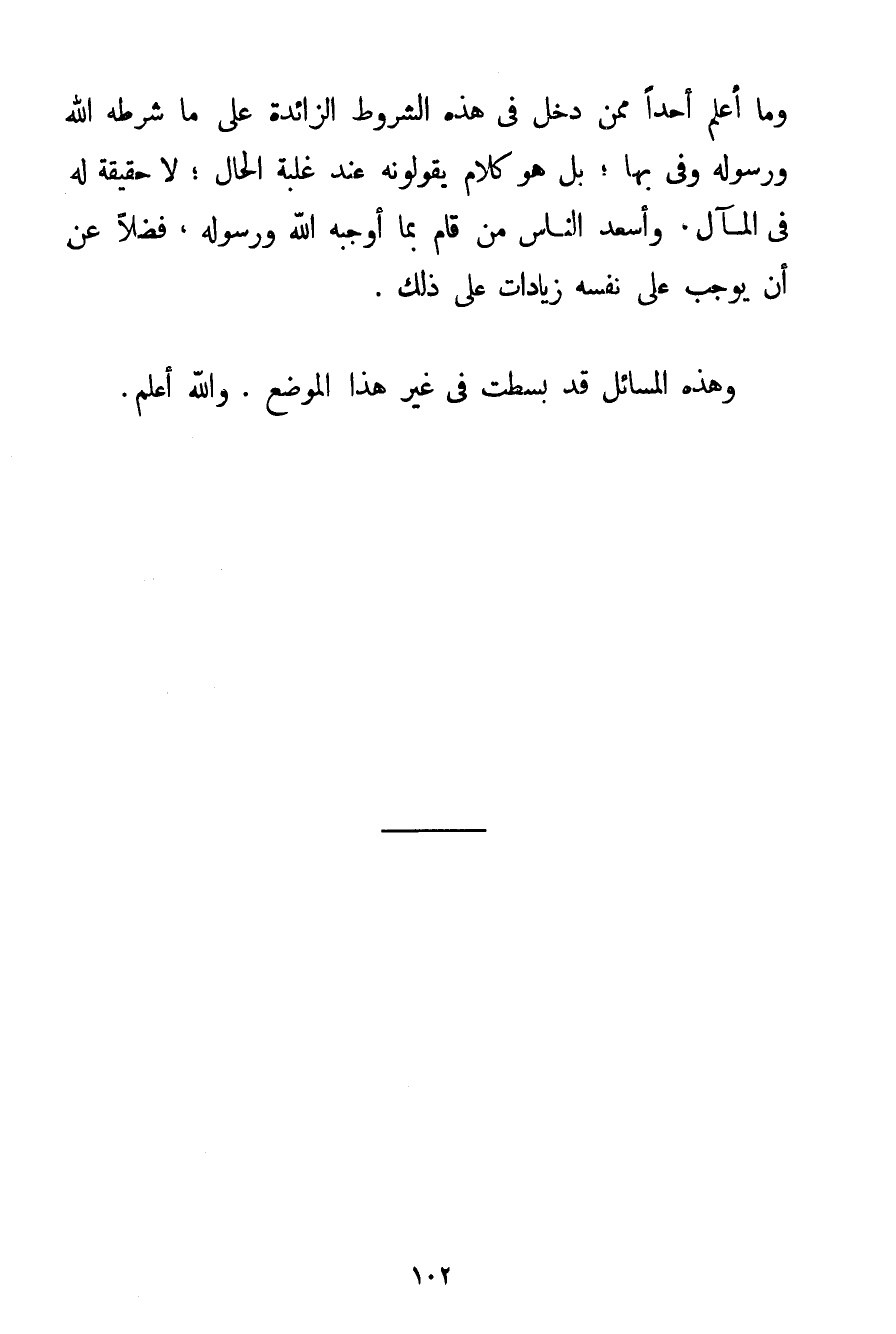 وَمَا أَعْلَمُ أَحَدًا مِمَّنْ دَخَلَ فِي هَذِهِ الشُّرُوطِ الزَّائِدَةِ عَلَى مَا شَرَطَهُ اللَّهُ وَرَسُولُهُ وَفَّى بِهَا؛ بَلْ هُوَ كَلَامٌ يَقُولُونَهُ عِنْدَ غَلَبَةِ الْحَالِ؛ لَا حَقِيقَةَ لَهُ فِي الْمَآلِ وَأَسْعَدُ النَّاسِ مَنْ قَامَ بِمَا أَوْجَبَهُ اللَّهُ وَرَسُولُهُ فَضْلًا عَنْ أَنْ يُوجِبَ عَلَى نَفْسِهِ زِيَادَاتٍ عَلَى ذَلِكَ. وَهَذِهِ الْمَسَائِلُ قَدْ بُسِطَتْ فِي غَيْرِ هَذَا الْمَوْضِعِ. وَاَللَّهُ أَعْلَمُ.