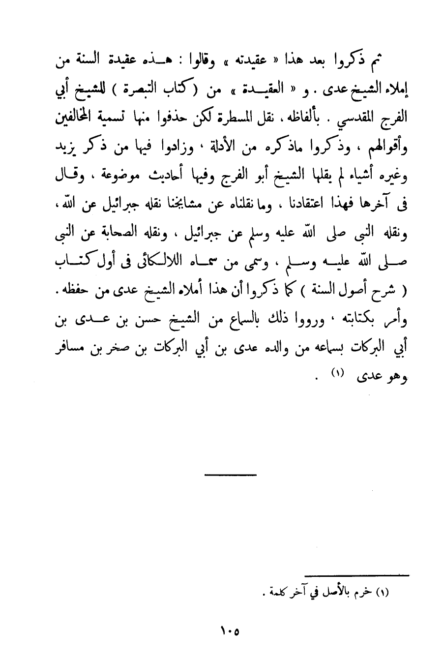 ثُمَّ ذَكَرُوا بَعْدَ هَذَا " عَقِيدَتَهُ " وَقَالُوا: هَذِهِ عَقِيدَةُ السُّنَّةِ مِنْ إمْلَاءِ الشَّيْخِ عَدِيٍّ. وَ " الْعَقِيدَةُ مِنْ (كِتَابِ التَّبْصِرَةِ لِلشَّيْخِ أَبِي الْفَرَجِ المقدسي. بِأَلْفَاظِهِ نَقْلَ الْمِسْطَرَةِ لَكِنْ حَذَفُوا مِنْهَا تَسْمِيَةَ الْمُخَالِفِينَ وَأَقْوَالَهُمْ وَذَكَرُوا مَا ذَكَرَهُ مِنْ الْأَدِلَّةِ وَزَادُوا فِيهَا مِنْ ذِكْرِ يَزِيدَ وَغَيْرِهِ أَشْيَاءَ لَمْ يَقُلْهَا الشَّيْخُ أَبُو الْفَرَجِ وَفِيهَا أَحَادِيثُ مَوْضُوعَةٌ وَقَالَ فِي آخِرِهَا فَهَذَا اعْتِقَادُنَا وَمَا نَقَلْنَاهُ عَنْ مَشَايِخِنَا نَقَلَهُ جبرائيل عَنْ اللَّهِ وَنَقَلَهُ النَّبِيُّ صَلَّى اللَّهُ عَلَيْهِ وَسَلَّمَ عَنْ جبرائيل وَنَقَلَهُ الصَّحَابَةُ عَنْ النَّبِيِّ صَلَّى اللَّهُ عَلَيْهِ وَسَلَّمَ وَسُمِّيَ مَنْ سَمَّاهُ اللكائي فِي أَوَّلِ كِتَابِ (شَرْحِ أُصُولِ السُّنَّةِ كَمَا ذَكَرُوا أَنَّ هَذَا أَمْلَاهُ الشَّيْخُ عَدِيٌّ مِنْ حِفْظِهِ. وَأَمَرَ بِكِتَابَتِهِ وَرَوَوْا ذَلِكَ بِالسَّمَاعِ مِنْ الشَّيْخِ حَسَنِ بْنِ عَدِيِّ بْنِ أَبِي الْبَرَكَاتِ بِسَمَاعِهِ مِنْ وَالِدِهِ عَدِيِّ بْنِ أَبِي الْبَرَكَاتِ بْنِ صَخْرِ بْنِ مُسَافِرٍ وَهُوَ عَدِيٌّ.