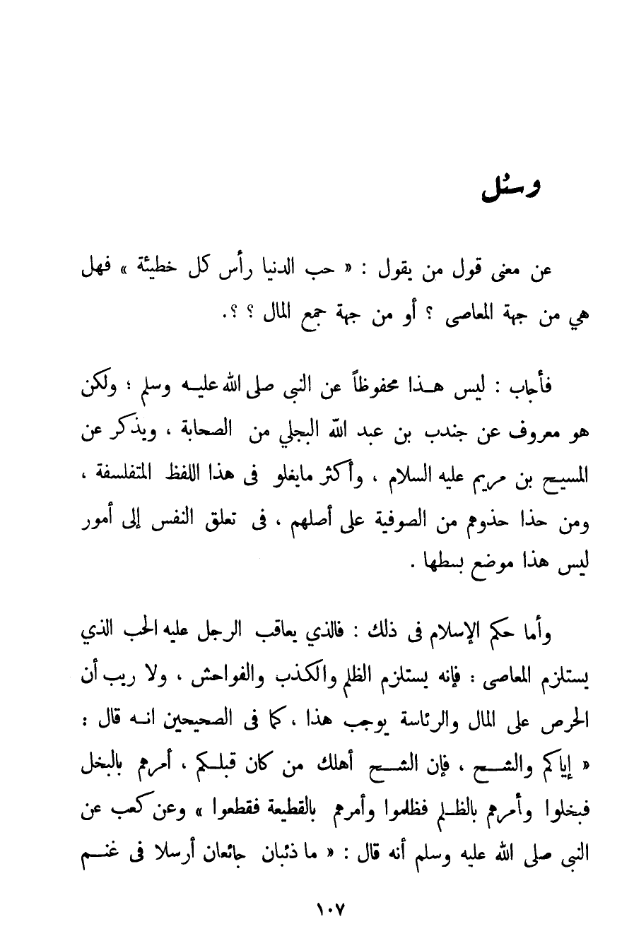 لَيْسَ هَذَا مَحْفُوظًا عَنْ النَّبِيِّ صَلَّى اللَّهُ عَلَيْهِ وَسَلَّمَ وَلَكِنْ هُوَ مَعْرُوفٌ عَنْ جُنْدُبِ بْنِ عَبْدِ اللَّهِ البجلي مِنْ الصَّحَابَةِ وَيُذْكَرُ عَنْ الْمَسِيحِ ابْنِ مَرْيَمَ عَلَيْهِ السَّلَامُ وَأَكْثَرُ مَا يَغْلُو فِي هَذَا اللَّفْظِ الْمُتَفَلْسِفَةُ وَمَنْ حَذَا حَذْوَهُمْ مِنْ الصُّوفِيَّةِ عَلَى أَصْلِهِمْ فِي تَعَلُّقِ النَّفْسِ إلَى أُمُورٍ لَيْسَ هَذَا مَوْضِعَ بَسْطِهَا. وَأَمَّا حُكْمُ الْإِسْلَامِ فِي ذَلِكَ: فَاَلَّذِي يُعَاقَبُ الرَّجُلُ عَلَيْهِ الْحُبُّ الَّذِي يَسْتَلْزِمُ الْمَعَاصِيَ: فَإِنَّهُ يَسْتَلْزِمُ الظُّلْمَ وَالْكَذِبَ وَالْفَوَاحِشَ وَلَا رَيْبَ أَنَّ الْحِرْصَ عَلَى الْمَالِ وَالرِّئَاسَةِ يُوجِبُ هَذَا كَمَا فِي الصَّحِيحَيْنِ أَنَّهُ قَالَ: {إيَّاكُمْ وَالشُّحَّ فَإِنَّ الشُّحَّ أَهْلَكَ مَنْ كَانَ قَبْلَكُمْ أَمَرَهُمْ بِالْبُخْلِ فَبَخِلُوا وَأَمَرَهُمْ بِالظُّلْمِ فَظَلَمُوا وَأَمَرَهُمْ بِالْقَطِيعَةِ فَقَطَعُوا} وَعَنْ كَعْبٍ عَنْ النَّبِيِّ صَلَّى اللَّهُ عَلَيْهِ وَسَلَّمَ أَنَّهُ قَالَ: {مَا ذِئْبَانِ جَائِعَانِ أُرْسِلَا فِي غَنَمٍ