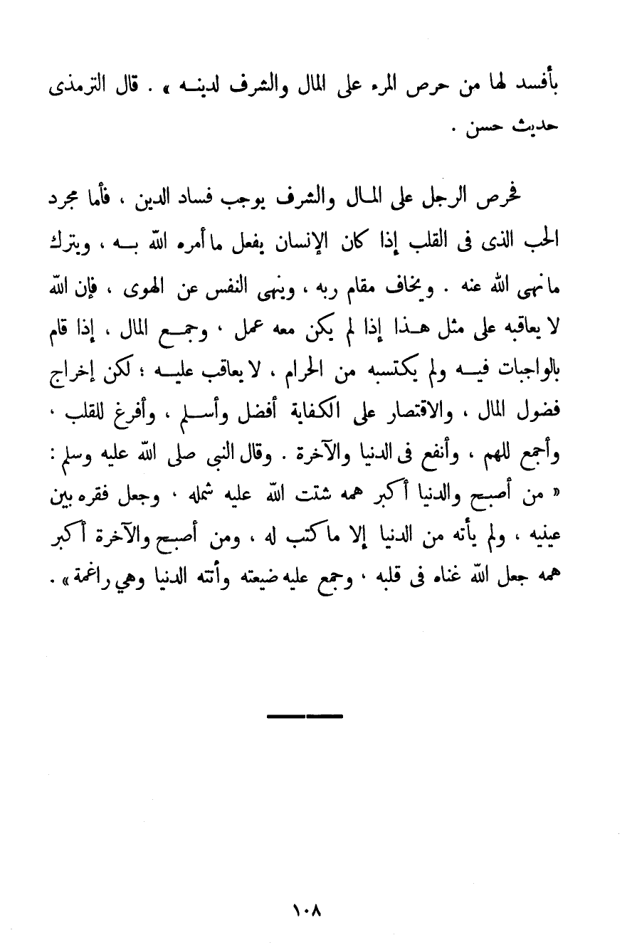 بِأَفْسَدَ لَهَا مِنْ حِرْصِ الْمَرْءِ عَلَى الْمَالِ وَالشَّرَفِ لِدِينِهِ} . قَالَ التِّرْمِذِيُّ حَدِيثٌ حَسَنٌ. فَحِرْصُ الرَّجُلِ عَلَى الْمَالِ وَالشَّرَفِ يُوجِبُ فَسَادَ الدِّينِ فَأَمَّا مُجَرَّدُ الْحُبِّ الَّذِي فِي الْقَلْبِ إذَا كَانَ الْإِنْسَانُ يَفْعَلُ مَا أَمَرَهُ اللَّهُ بِهِ وَيَتْرُكُ مَا نَهَى اللَّهُ عَنْهُ. وَيَخَافُ مَقَامَ رَبِّهِ وَيَنْهَى النَّفْسَ عَنْ الْهَوَى فَإِنَّ اللَّهَ لَا يُعَاقِبُهُ عَلَى مِثْلِ هَذَا إذَا لَمْ يَكُنْ مَعَهُ عَمَلٌ وَجَمْعُ الْمَالِ إذَا قَامَ بِالْوَاجِبَاتِ فِيهِ وَلَمْ يَكْتَسِبْهُ مِنْ الْحَرَامِ لَا يُعَاقَبُ عَلَيْهِ؛ لَكِنَّ إخْرَاجَ فُضُولِ الْمَالِ وَالِاقْتِصَارَ عَلَى الْكِفَايَةِ أَفْضَلُ وَأَسْلَمُ وَأَفْرَغُ لِلْقَلْبِ وَأَجْمَعُ لِلْهَمِّ وَأَنْفَعُ فِي الدُّنْيَا وَالْآخِرَةِ. وَقَالَ النَّبِيُّ صَلَّى اللَّهُ عَلَيْهِ وَسَلَّمَ {مَنْ أَصْبَحَ وَالدُّنْيَا أَكْبَرُ هَمِّهِ شَتَّتَ اللَّهُ عَلَيْهِ شَمْلَهُ وَجَعَلَ فَقْرَهُ بَيْنَ عَيْنَيْهِ وَلَمْ يَأْتِهِ مِنْ الدُّنْيَا إلَّا مَا كُتِبَ لَهُ وَمَنْ أَصْبَحَ وَالْآخِرَةُ أَكْبَرُ هَمِّهِ جَعَلَ اللَّهُ غِنَاهُ فِي قَلْبِهِ وَجَمَعَ عَلَيْهِ ضَيْعَتَهُ وَأَتَتْهُ الدُّنْيَا وَهِيَ رَاغِمَةٌ} .