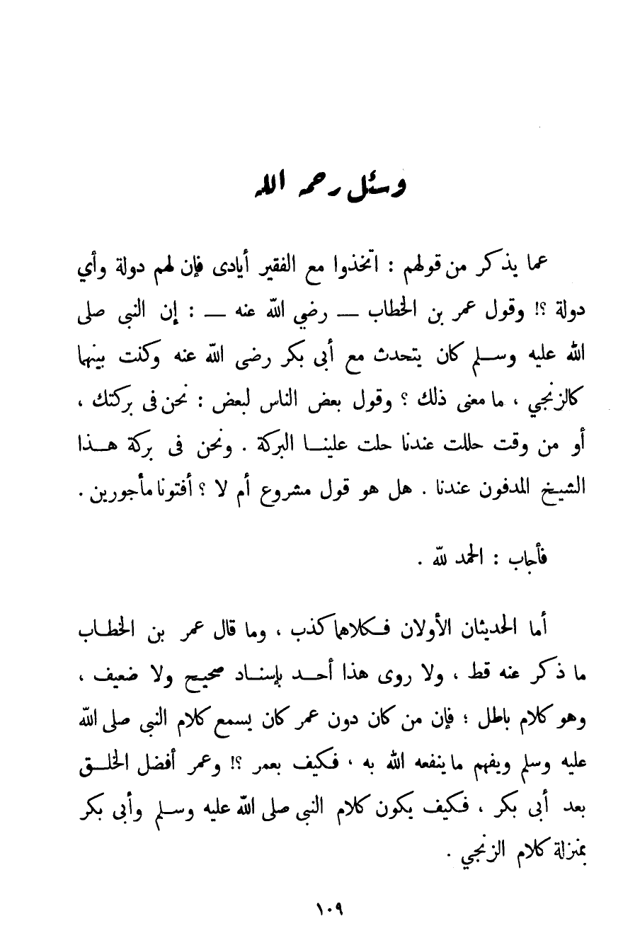 الْحَمْدُ لِلَّهِ، أَمَا الْحَدِيثَانِ الْأَوَّلَانِ فَكِلَاهُمَا كَذِبٌ وَمَا قَالَ عُمَرُ بْنُ الْخَطَّابِ مَا ذُكِرَ عَنْهُ قَطُّ وَلَا رَوَى هَذَا أَحَدٌ بِإِسْنَادِ صَحِيحٍ وَلَا ضَعِيفٍ وَهُوَ كَلَامٌ بَاطِلٌ؛ فَإِنَّ مَنْ كَانَ دُونَ عُمَرَ كَانَ يَسْمَعُ كَلَامَ النَّبِيِّ صَلَّى اللَّهُ عَلَيْهِ وَسَلَّمَ وَيَفْهَمُ مَا يَنْفَعُهُ اللَّهُ بِهِ فَكَيْفَ بِعُمَرِ؟ وَعُمَرُ أَفْضَلُ الْخَلْقِ بَعْدَ أَبِي بَكْرٍ فَكَيْفَ يَكُونُ كَلَامُ النَّبِيِّ صَلَّى اللَّهُ عَلَيْهِ وَسَلَّمَ وَأَبِي بَكْرٍ بِمَنْزِلَةِ كَلَامِ الزِّنْجِيِّ.