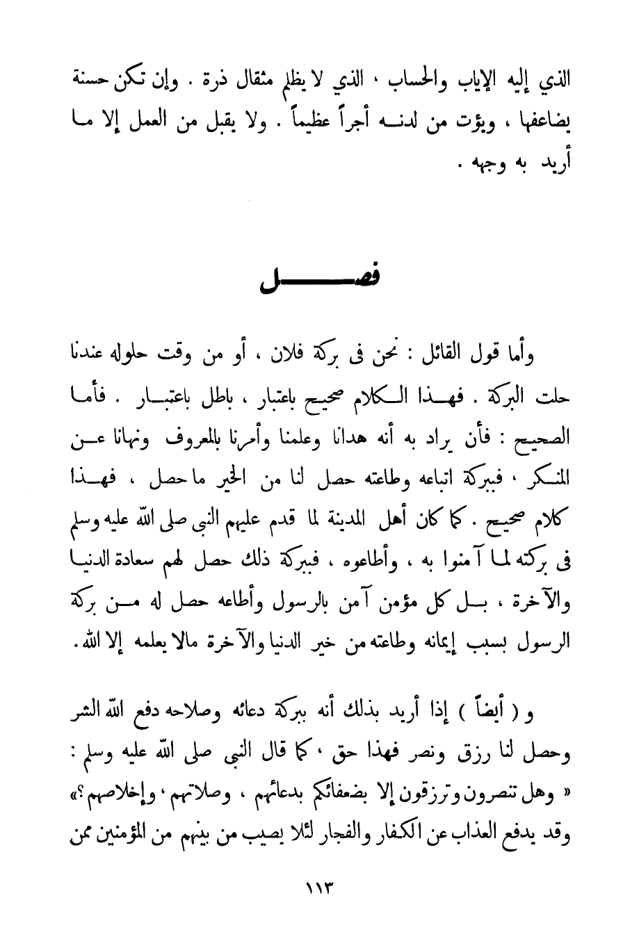وَأَمَّا قَوْلُ الْقَائِلِ: نَحْنُ فِي بَرَكَةِ فُلَانٍ أَوْ مِنْ وَقْتِ حُلُولِهِ عِنْدَنَا حَلَّتْ الْبَرَكَةُ. فَهَذَا الْكَلَامُ صَحِيحٌ بِاعْتِبَارِ بَاطِلٌ بِاعْتِبَارِ. فَأَمَّا الصَّحِيحُ: فَأَنْ يُرَادَ بِهِ أَنَّهُ هَدَانَا وَعَلَّمَنَا وَأَمَرَنَا بِالْمَعْرُوفِ وَنَهَانَا عَنْ الْمُنْكَرِ فَبِبَرَكَةِ اتِّبَاعِهِ وَطَاعَتِهِ حَصَلَ لَنَا مِنْ الْخَيْرِ مَا حَصَلَ فَهَذَا كَلَامٌ صَحِيحٌ. كَمَا كَانَ أَهْلُ الْمَدِينَةِ لَمَّا قَدِمَ عَلَيْهِمْ النَّبِيُّ صَلَّى اللَّهُ عَلَيْهِ وَسَلَّمَ فِي بَرَكَتِهِ لَمَّا آمَنُوا بِهِ وَأَطَاعُوهُ فَبِبَرَكَةِ ذَلِكَ حَصَلَ لَهُمْ سَعَادَةُ الدُّنْيَا وَالْآخِرَةِ بَلْ كُلُّ مُؤْمِنٍ آمَنَ بِالرَّسُولِ وَأَطَاعَهُ حَصَلَ لَهُ مِنْ بَرَكَةِ الرَّسُولِ بِسَبَبِ إيمَانِهِ وَطَاعَتِهِ مِنْ خَيْرِ الدُّنْيَا وَالْآخِرَةِ مَا لَا يَعْلَمُهُ إلَّا اللَّهُ. وَ (أَيْضًا إذَا أُرِيدَ بِذَلِكَ أَنَّهُ بِبَرَكَةِ دُعَائِهِ وَصَلَاحِهِ دَفَعَ اللَّهُ الشَّرَّ وَحَصَلَ لَنَا رِزْقٌ وَنَصْرٌ فَهَذَا حَقٌّ كَمَا قَالَ النَّبِيُّ صَلَّى اللَّهُ عَلَيْهِ وَسَلَّمَ {وَهَلْ تُنْصَرُونَ وَتُرْزَقُونَ إلَّا بِضُعَفَائِكُمْ بِدُعَائِهِمْ وَصَلَاتِهِمْ وَإِخْلَاصِهِمْ؟} وَقَدْ يَدْفَعُ الْعَذَابَ عَنْ الْكُفَّارِ وَالْفُجَّارِ لِئَلَّا يُصِيبَ مِنْ بَيْنِهِمْ مِنْ الْمُؤْمِنِينَ مِمَّنْ