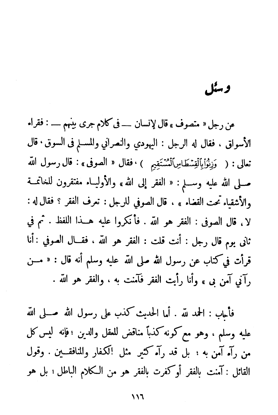 عَنْ رَجُلٍ " مُتَصَوِّفٍ " قَالَ لِإِنْسَانِ - فِي كَلَامٍ جَرَى بَيْنَهُمْ -: فُقَرَاءُ الْأَسْوَاقِ فَقَالَ لَهُ الرَّجُلُ: الْيَهُودِيُّ وَالنَّصْرَانِيُّ وَالْمُسْلِمُ فِي السُّوقِ قَالَ تَعَالَى: {وَزِنُوا بِالْقِسْطَاسِ الْمُسْتَقِيمِ} فَقَالَ " الصُّوفِيُّ ": قَالَ رَسُولُ اللَّهِ صَلَّى اللَّهُ عَلَيْهِ وَسَلَّمَ {الْفَقْرُ إلَى اللَّهِ وَالْأَوْلِيَاءُ مُفْتَقِرُونَ لِلْخَاتِمَةِ وَالْأَشْقِيَاءُ تَحْتَ الْقَضَاءِ} " قَالَ الصُّوفِيُّ لِلرَّجُلِ: تَعْرِفُ الْفَقْرَ؟ فَقَالَ لَهُ: لَا قَالَ الصُّوفِيُّ: الْفَقْرُ هُوَ اللَّهُ. فَأَنْكَرُوا عَلَيْهِ هَذَا اللَّفْظَ. ثُمَّ فِي ثَانِي يَوْمٍ قَالَ رَجُلٌ: أَنْتَ قُلْت: الْفَقْرُ هُوَ اللَّهُ فَقَالَ الصُّوفِيُّ: أَنَا قَرَأْت فِي كِتَابٍ عَنْ رَسُولِ اللَّهِ صَلَّى اللَّهُ عَلَيْهِ وَسَلَّمَ أَنَّهُ قَالَ: {مَنْ رَآنِي آمَنَ بِي} وَأَنَا رَأَيْت الْفَقْرَ فَآمَنْت بِهِ وَالْفَقْرُ هُوَ اللَّهُ.