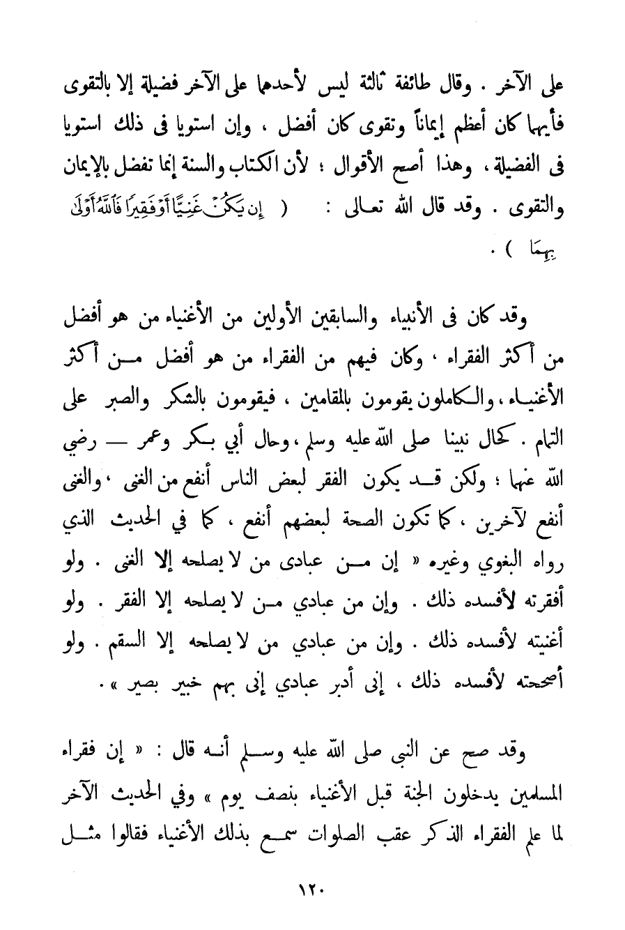 عَلَى الْآخَرِ. وَقَالَ طَائِفَةٌ ثَالِثَةٌ لَيْسَ لِأَحَدِهِمَا عَلَى الْآخَرِ فَضِيلَةٌ إلَّا بِالتَّقْوَى فَأَيُّهُمَا كَانَ أَعْظَمَ إيمَانًا وَتَقْوَى كَانَ أَفْضَلَ وَإِنْ اسْتَوَيَا فِي ذَلِكَ اسْتَوَيَا فِي الْفَضِيلَةِ وَهَذَا أَصَحُّ الْأَقْوَالِ؛ لِأَنَّ الْكِتَابَ وَالسُّنَّةَ إنَّمَا تَفْضُلُ بِالْإِيمَانِ وَالتَّقْوَى. وَقَدْ قَالَ اللَّهُ تَعَالَى: {إنْ يَكُنْ غَنِيًّا أَوْ فَقِيرًا فَاللَّهُ أَوْلَى بِهِمَا} . وَقَدْ كَانَ فِي الْأَنْبِيَاءِ وَالسَّابِقِينَ الْأَوَّلِينَ مِنْ الْأَغْنِيَاءِ مَنْ هُوَ أَفْضَلُ مِنْ أَكْثُرْ الْفُقَرَاءِ وَكَانَ فِيهِمْ مِنْ الْفُقَرَاءِ مَنْ هُوَ أَفْضَلُ مِنْ أَكْثَرِ الْأَغْنِيَاءِ وَالْكَامِلُونَ يَقُومُونَ بِالْمَقَامَيْنِ فَيَقُومُونَ بِالشُّكْرِ وَالصَّبْرِ عَلَى التَّمَامِ. كَحَالِ نَبِيِّنَا صَلَّى اللَّهُ عَلَيْهِ وَسَلَّمَ وَحَالِ أَبِي بَكْرٍ وَعُمَرَ - رَضِيَ اللَّهُ عَنْهُمَا وَلَكِنْ قَدْ يَكُونُ الْفَقْرُ لِبَعْضِ النَّاسِ أَنْفَعَ مِنْ الْغِنَى وَالْغِنَى أَنْفَعَ لِآخَرِينَ كَمَا تَكُونُ الصِّحَّةُ لِبَعْضِهِمْ أَنْفَعَ كَمَا فِي الْحَدِيثِ الَّذِي رَوَاهُ البغوي وَغَيْرُهُ {إنَّ مِنْ عِبَادِي مَنْ لَا يُصْلِحُهُ إلَّا الْغِنَى. وَلَوْ أَفْقَرْته لَأَفْسَدَهُ ذَلِكَ. وَإِنَّ مِنْ عِبَادِي مَنْ لَا يُصْلِحُهُ إلَّا الْفَقْرُ. وَلَوْ أَغْنَيْته لَأَفْسَدَهُ ذَلِكَ. وَإِنَّ مِنْ عِبَادِي مَنْ لَا يُصْلِحُهُ إلَّا السَّقَمُ. وَلَوْ أَصْحَحْته لَأَفْسَدَهُ ذَلِكَ إنِّي أُدَبِّرُ عِبَادِي إنِّي بِهِمْ خَبِيرٌ بَصِيرٌ} . وَقَدْ صَحَّ عَنْ النَّبِيِّ صَلَّى اللَّهُ عَلَيْهِ وَسَلَّمَ أَنَّهُ قَالَ: {إنَّ فُقَرَاءَ الْمُسْلِمِينَ يَدْخُلُونَ الْجَنَّةَ قَبْلَ الْأَغْنِيَاءِ بِنِصْفِ يَوْمٍ} وَفِي الْحَدِيثِ الْآخَرِ {لَمَّا عَلَّمَ الْفُقَرَاءَ الذِّكْرَ عَقِبَ الصَّلَوَاتِ سَمِعَ بِذَلِكَ الْأَغْنِيَاءُ فَقَالُوا مِثْلَ