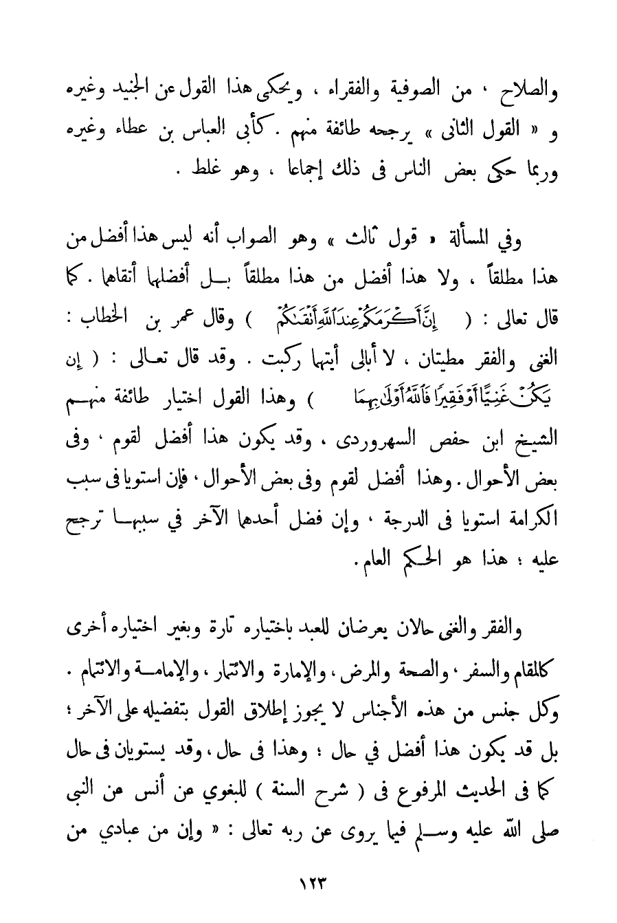 وَالصَّلَاحِ مِنْ الصُّوفِيَّةِ وَالْفُقَرَاءِ وَيُحْكَى هَذَا الْقَوْلُ عَنْ الْجُنَيْد وَغَيْرِهِ وَ " الْقَوْلُ الثَّانِي " يُرَجِّحُهُ طَائِفَةٌ مِنْهُمْ. كَأَبِي الْعَبَّاسِ بْنِ عَطَاءٍ وَغَيْرِهِ وَرُبَّمَا حَكَى بَعْضُ النَّاسِ فِي ذَلِكَ إجْمَاعًا وَهُوَ غَلَطٌ. وَفِي الْمَسْأَلَةِ " قَوْلٌ ثَالِثٌ " وَهُوَ الصَّوَابُ أَنَّهُ لَيْسَ هَذَا أَفْضَلَ مِنْ هَذَا مُطْلَقًا وَلَا هَذَا أَفْضَلَ مِنْ هَذَا مُطْلَقًا بَلْ أَفْضَلُهُمَا أَتْقَاهُمَا. كَمَا قَالَ تَعَالَى {إنَّ أَكْرَمَكُمْ عِنْدَ اللَّهِ أَتْقَاكُمْ} وَقَالَ عُمَرُ بْنُ الْخَطَّابِ: الْغِنَى وَالْفَقْرُ مَطِيَّتَانِ لَا أُبَالِي أَيَّتَهمَا رَكِبْت. وَقَدْ قَالَ تَعَالَى: {إنْ يَكُنْ غَنِيًّا أَوْ فَقِيرًا فَاللَّهُ أَوْلَى بِهِمَا} وَهَذَا الْقَوْلُ اخْتِيَارُ طَائِفَةٍ مِنْهُمْ الشَّيْخُ ابْنُ حَفْصٍ السهروردي وَقَدْ يَكُونُ هَذَا أَفْضَلَ لِقَوْمِ وَفِي بَعْضِ الْأَحْوَالِ. وَهَذَا أَفْضَلَ لِقَوْمِ وَفِي بَعْضِ الْأَحْوَالِ فَإِنْ اسْتَوَيَا فِي سَبَبِ الْكَرَامَةِ اسْتَوَيَا فِي الدَّرَجَةِ وَإِنْ فَضَلَ أَحَدُهُمَا الْآخَرَ فِي سَبَبِهَا تَرَجَّحَ عَلَيْهِ؛ هَذَا هُوَ الْحُكْمُ الْعَامُّ. وَالْفَقْرُ وَالْغِنَى حَالَانِ يَعْرِضَانِ لِلْعَبْدِ بِاخْتِيَارِهِ تَارَةً وَبِغَيْرِ اخْتِيَارِهِ أُخْرَى كَالْمَقَامِ وَالسَّفَرِ وَالصِّحَّةِ وَالْمَرَضِ وَالْإِمَارَةِ والائتمار وَالْإِمَامَةِ والائتمام. وَكُلُّ جِنْسٍ مِنْ هَذِهِ الْأَجْنَاسِ لَا يَجُوزُ إطْلَاقُ الْقَوْلِ بِتَفْضِيلِهِ عَلَى الْآخَرِ؛ بَلْ قَدْ يَكُونُ هَذَا أَفْضَلَ فِي حَالٍ؛ وَهَذَا فِي حَالٍ وَقَدْ يَسْتَوِيَانِ فِي حَالٍ كَمَا فِي الْحَدِيثِ الْمَرْفُوعِ فِي (شَرْحِ السُّنَّةِ للبغوي عَنْ أَنَسٍ عَنْ النَّبِيِّ صَلَّى اللَّهُ عَلَيْهِ وَسَلَّمَ فِيمَا يَرْوِي عَنْ رَبِّهِ تَعَالَى: {وَإِنَّ مِنْ عِبَادِي مَنْ