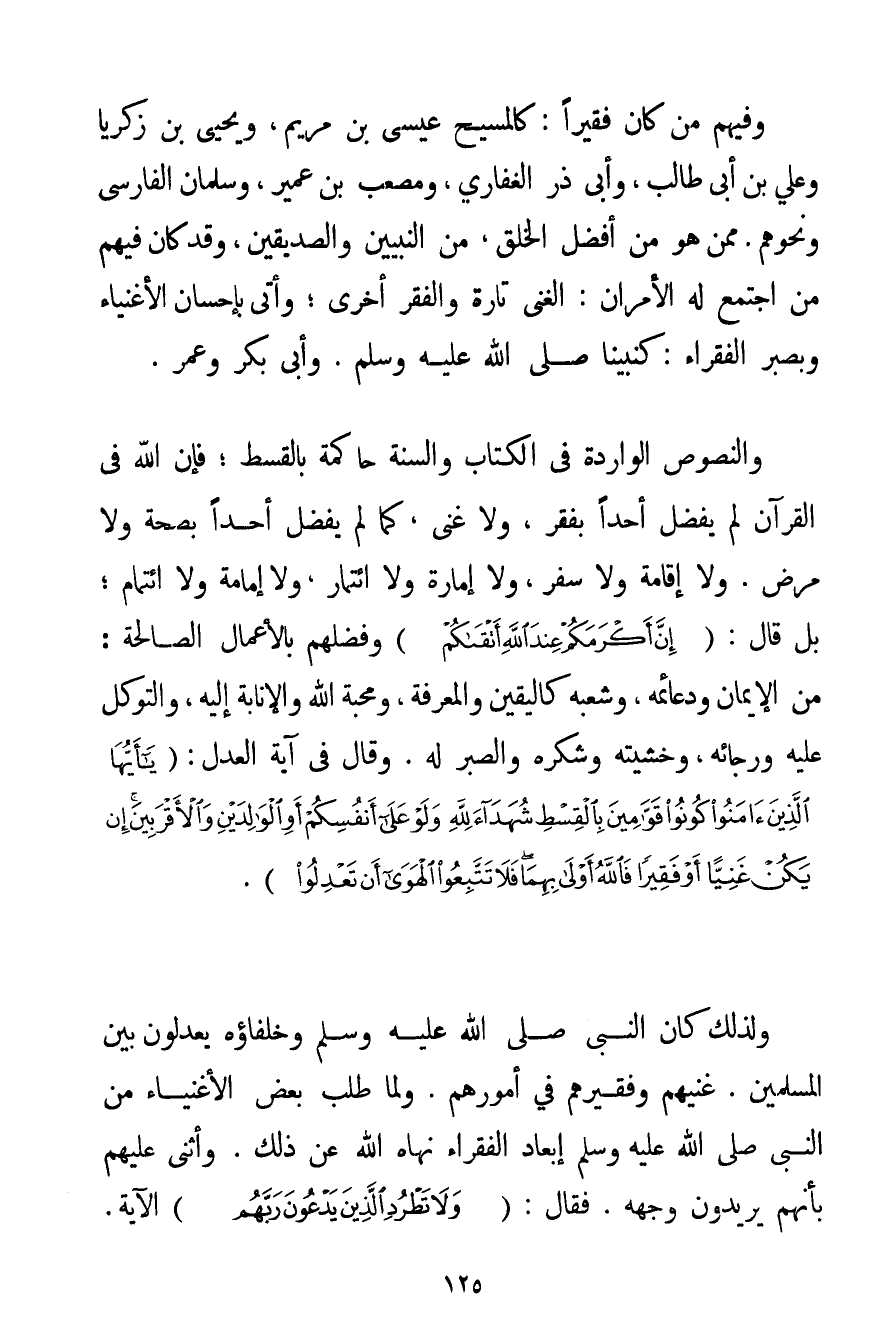 وَفِيهِمْ مَنْ كَانَ فَقِيرًا: كَالْمَسِيحِ عِيسَى ابْنِ مَرْيَمَ وَيَحْيَى بْنِ زَكَرِيَّا وَعَلِيِّ بْنِ أَبِي طَالِبٍ وَأَبِي ذَرٍّ الْغِفَارِيِّ وَمُصْعَبِ بْنِ عُمَيْرٍ وَسَلْمَانَ الْفَارِسِيِّ وَنَحْوِهِمْ. مِمَّنْ هُوَ مِنْ أَفْضَلِ الْخَلْقِ مِنْ النَّبِيِّينَ وَالصِّدِّيقِينَ وَقَدْ كَانَ فِيهِمْ مَنْ اجْتَمَعَ لَهُ الْأَمْرَانِ: الْغِنَى تَارَةً وَالْفَقْرُ أُخْرَى؛ وَأَتَى بِإِحْسَانِ الْأَغْنِيَاءِ وَبِصَبْرِ الْفُقَرَاءِ: كَنَبِيِّنَا صَلَّى اللَّهُ عَلَيْهِ وَسَلَّمَ. وَأَبِي بَكْرٍ وَعُمَرَ. وَالنُّصُوصُ الْوَارِدَةُ فِي الْكِتَابِ وَالسُّنَّةِ حَاكِمَةٌ بِالْقِسْطِ؛ فَإِنَّ اللَّهَ فِي الْقُرْآنِ لَمْ يُفَضِّلْ أَحَدًا بِفَقْرِ وَلَا غِنًى كَمَا لَمْ يُفَضِّلْ أَحَدًا بِصِحَّةِ وَلَا مَرَضٍ. وَلَا إقَامَةٍ وَلَا سَفَرٍ وَلَا إمَارَةٍ وَلَا ائْتِمَارٍ وَلَا إمَامَةٍ وَلَا ائْتِمَامٍ؛ بَلْ قَالَ: {إنَّ أَكْرَمَكُمْ عِنْدَ اللَّهِ أَتْقَاكُمْ} وَفَضَّلَهُمْ بِالْأَعْمَالِ الصَّالِحَةِ: مِنْ الْإِيمَانِ وَدَعَائِمِهِ وَشُعَبِهِ كَالْيَقِينِ وَالْمَعْرِفَةِ وَمَحَبَّةِ اللَّهِ وَالْإِنَابَةِ إلَيْهِ وَالتَّوَكُّلِ عَلَيْهِ وَرَجَائِهِ وَخَشْيَتِهِ وَشُكْرِهِ وَالصَّبْرِ لَهُ. وَقَالَ فِي آيَةِ الْعَدْلِ: {يَا أَيُّهَا الَّذِينَ آمَنُوا كُونُوا قَوَّامِينَ بِالْقِسْطِ شُهَدَاءَ لِلَّهِ وَلَوْ عَلَى أَنْفُسِكُمْ أَوِ الْوَالِدَيْنِ وَالْأَقْرَبِينَ إنْ يَكُنْ غَنِيًّا أَوْ فَقِيرًا فَاللَّهُ أَوْلَى بِهِمَا فَلَا تَتَّبِعُوا الْهَوَى أَنْ تَعْدِلُوا} . وَلِذَلِكَ كَانَ النَّبِيُّ صَلَّى اللَّهُ عَلَيْهِ وَسَلَّمَ وَخُلَفَاؤُهُ يَعْدِلُونَ بَيْنَ الْمُسْلِمِينَ. غَنِيِّهِمْ وَفَقِيرِهِمْ فِي أُمُورِهِمْ. وَلَمَّا طَلَبَ بَعْضُ الْأَغْنِيَاءِ مِنْ النَّبِيِّ صَلَّى اللَّهُ عَلَيْهِ وَسَلَّمَ إبْعَادَ الْفُقَرَاءِ نَهَاهُ اللَّهُ عَنْ ذَلِكَ. وَأَثْنَى عَلَيْهِمْ بِأَنَّهُمْ يُرِيدُونَ وَجْهَهُ. فَقَالَ: {وَلَا تَطْرُدِ الَّذِينَ يَدْعُونَ رَبَّهُمْ} الْآيَةَ.